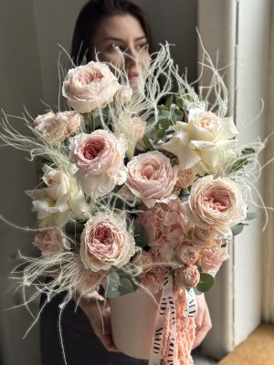 Цена на букет в шляпной коробке зависит от количества и сорта растений, сезонности, а также времени их сборки. В композиции могут быть использованы розы, гортензии, ромашки, пионы, а также другие растения.