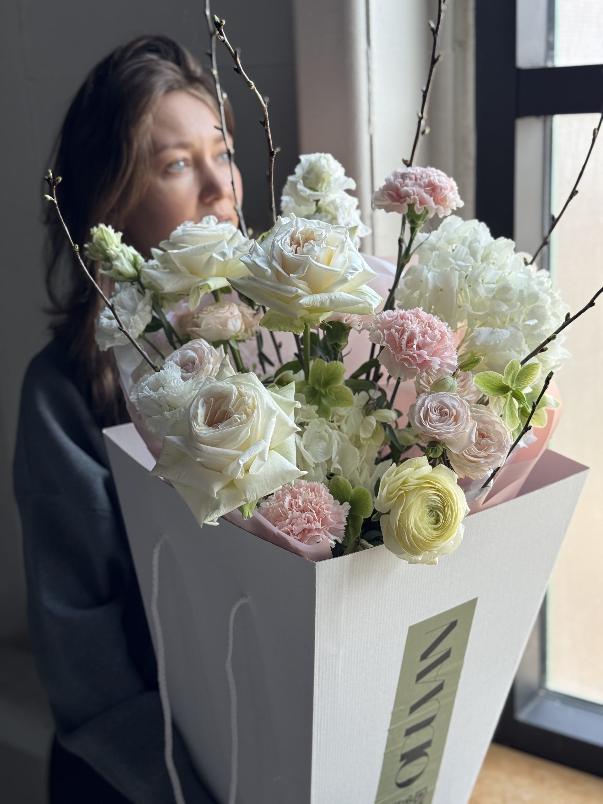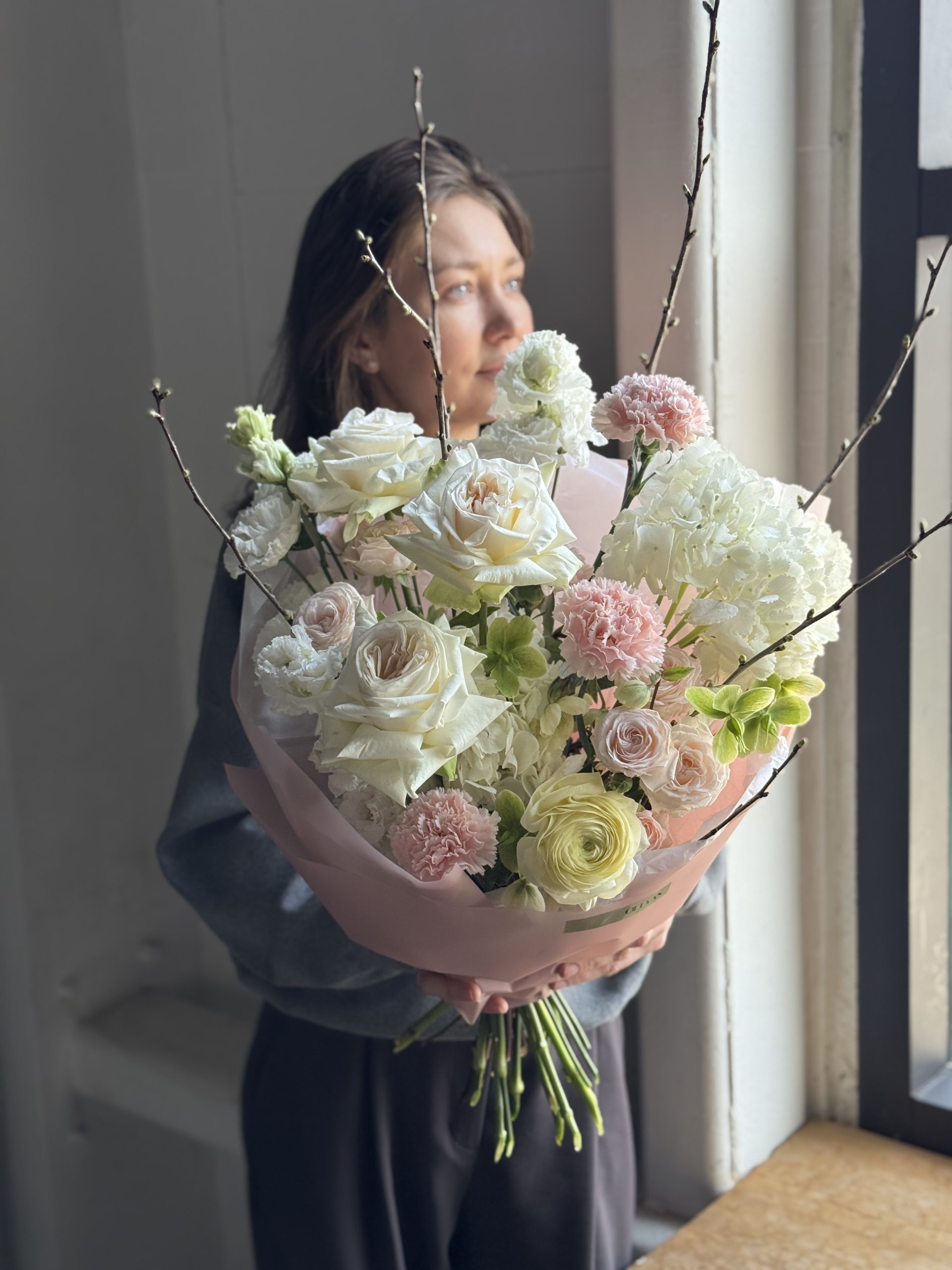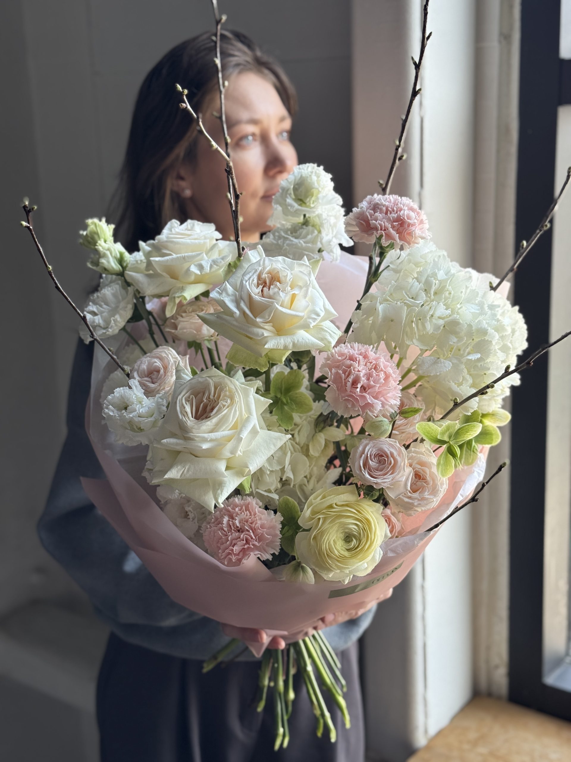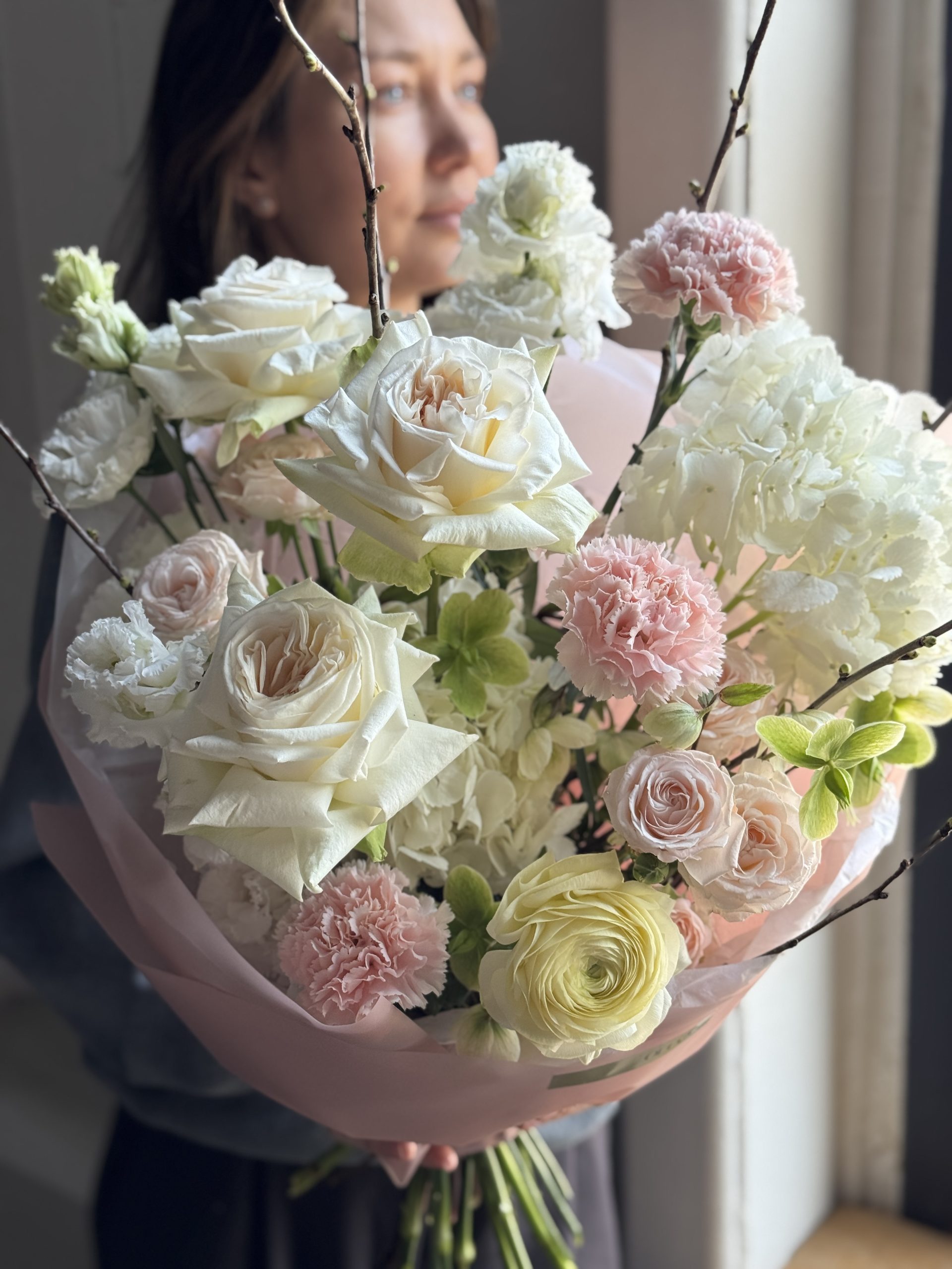 Описание: Букет с ароматной пионовидной розой Охара, гортензией, диантусами, ранункулюсом, хелеборусом, эустомой, пионовидной кустовой розой Бомбастик и ветками прунуса.