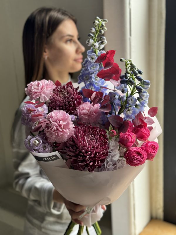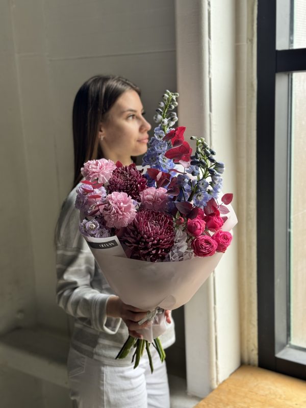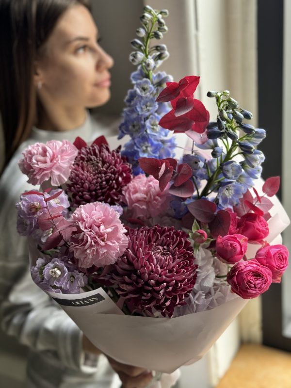 Описание: Сборный букет с дельфиниумами, гортензией, хризантемами Бигуди, гвоздиками, кустовой маттиолой, пионовидной кустовой розой и веточками стабилизированного эвкалипта.