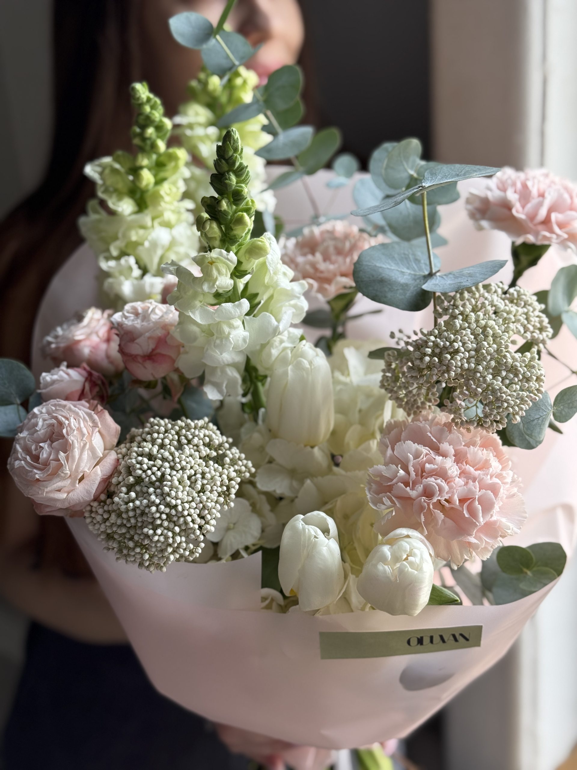 Описание: Сборный букет с гортензией, кустовой розой Бомбастик, озотамнусом, тюльпанами, леувенбеками, диантусами и веточками эвкалипта.