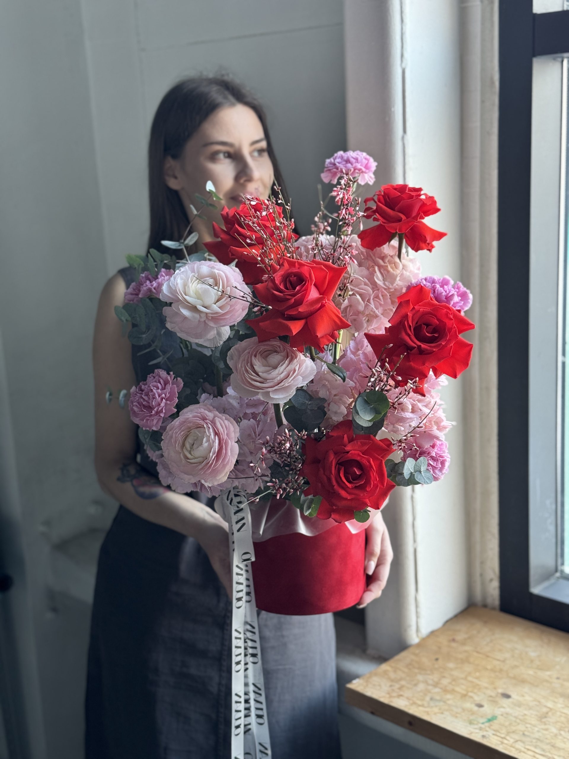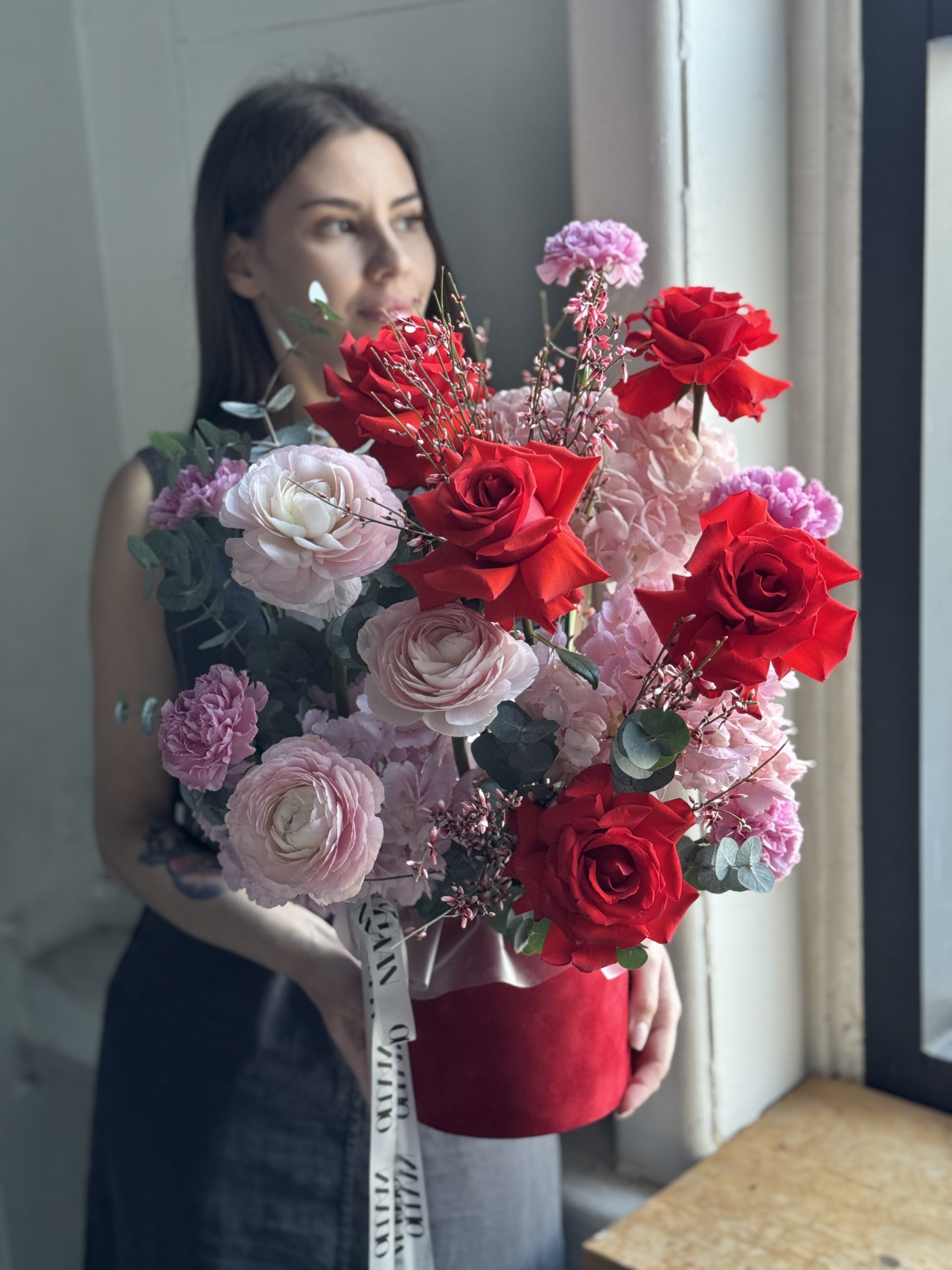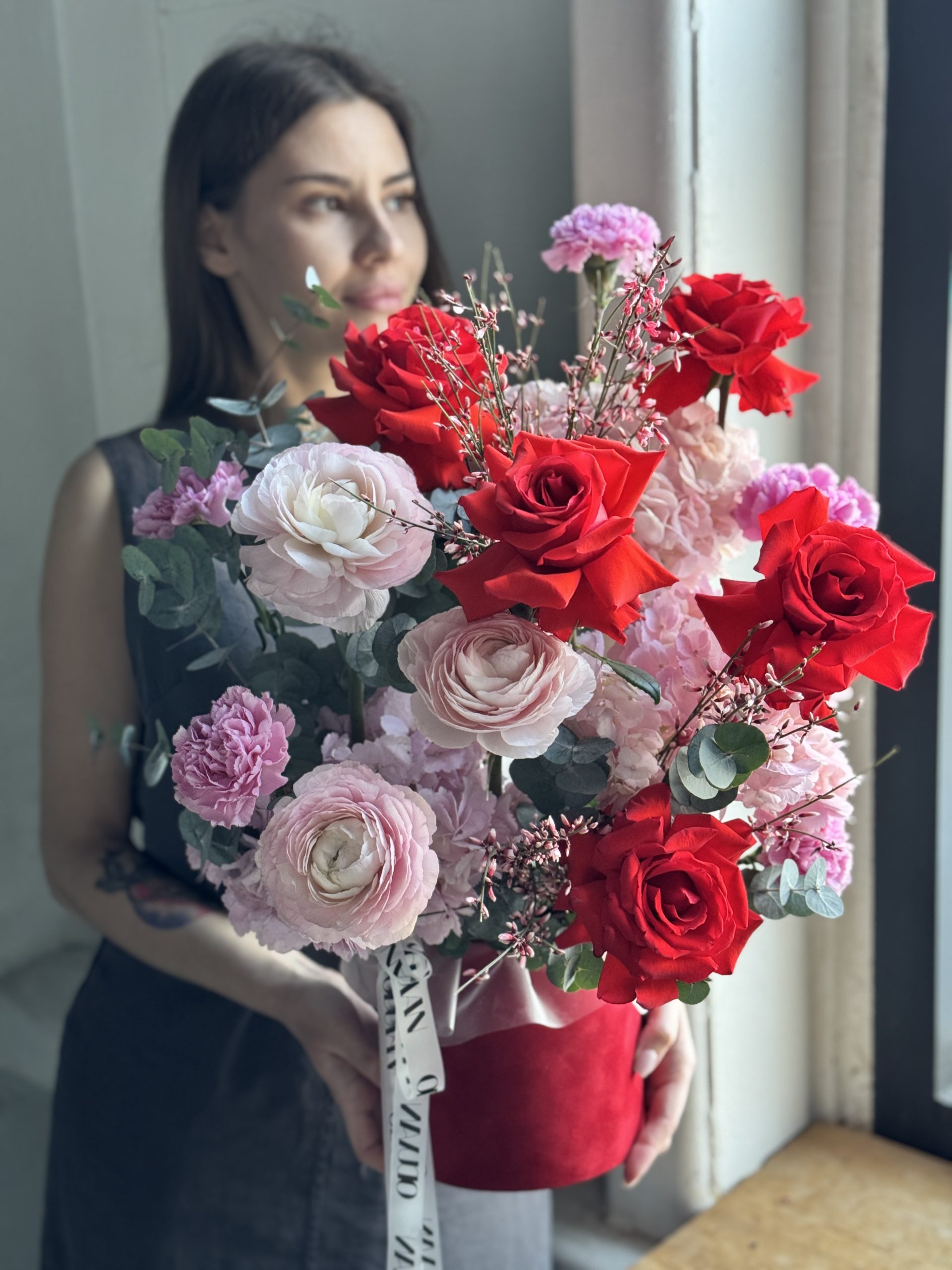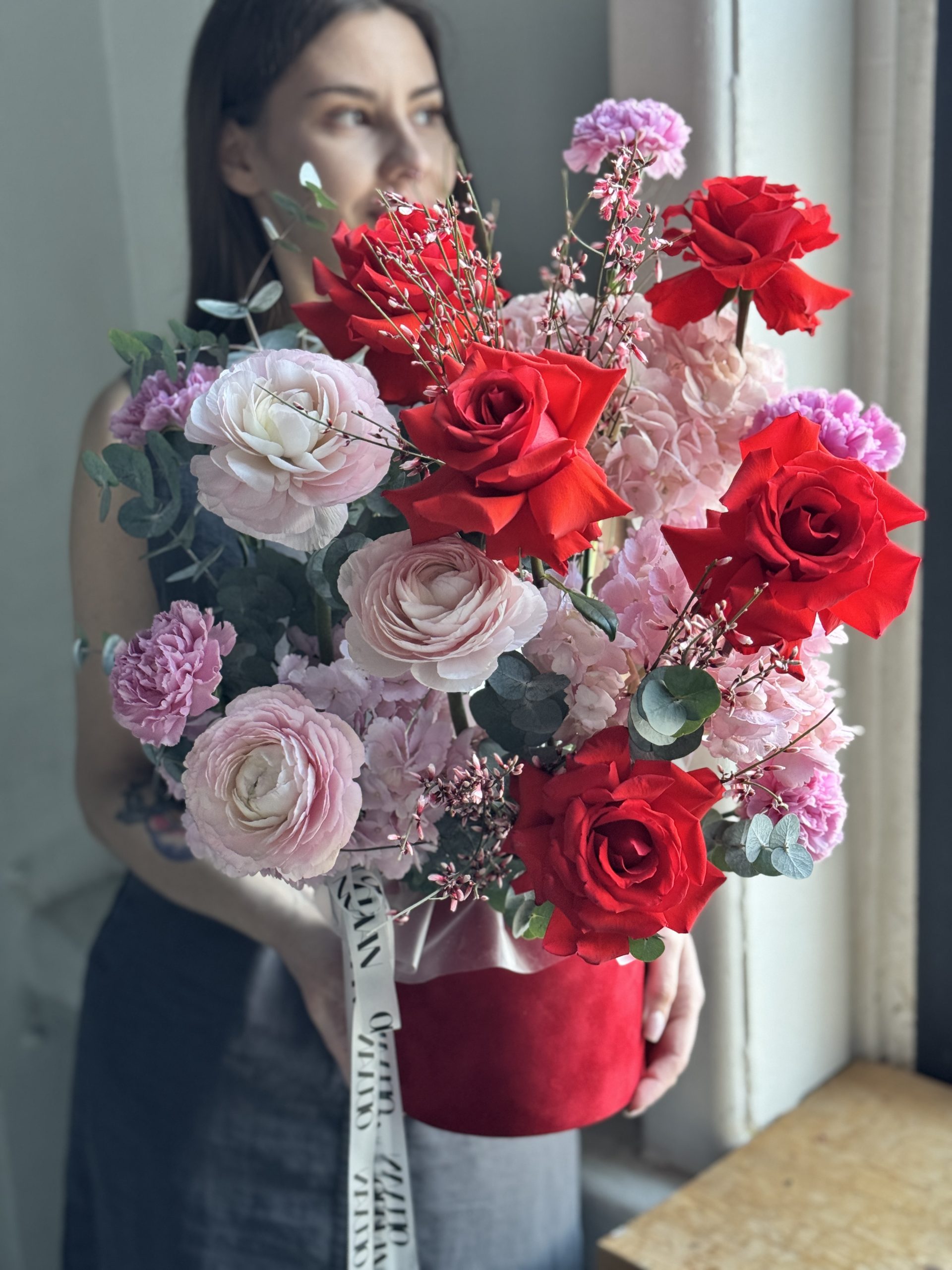 Описание: Композиция в бархатной коробке с розами Нина во французком раскрытие, ранункулюсами, гортензиями, диантусами, веточками эвкалипта и ароматной генисты.
