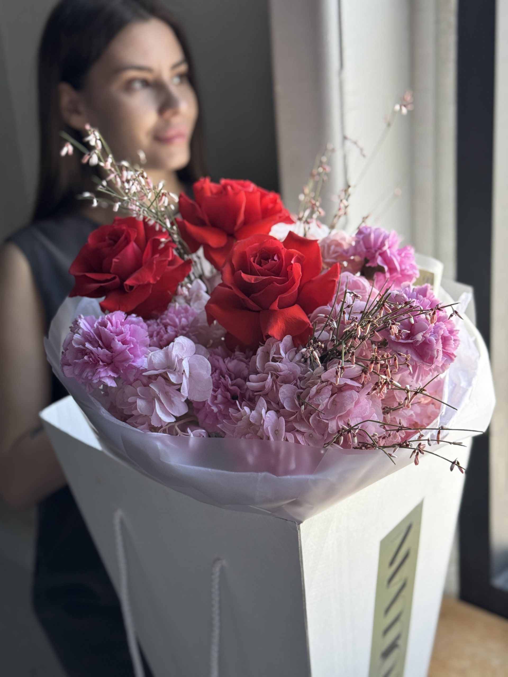 Описание: Сборный букет с гортензиями, розами Нина во французком раскрытие, диантусами и веточками ароматной генисты.