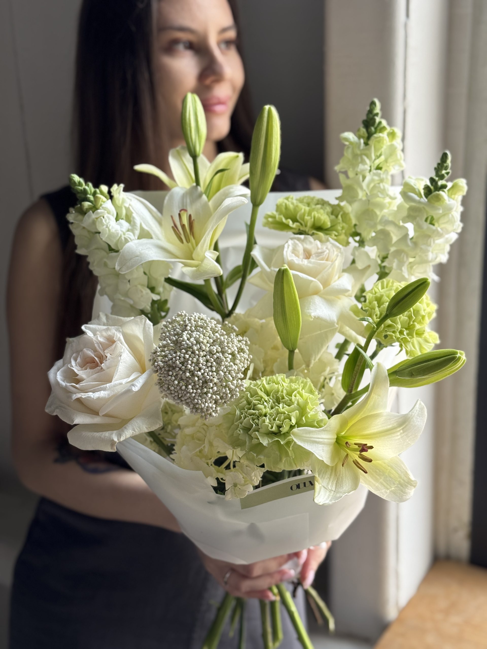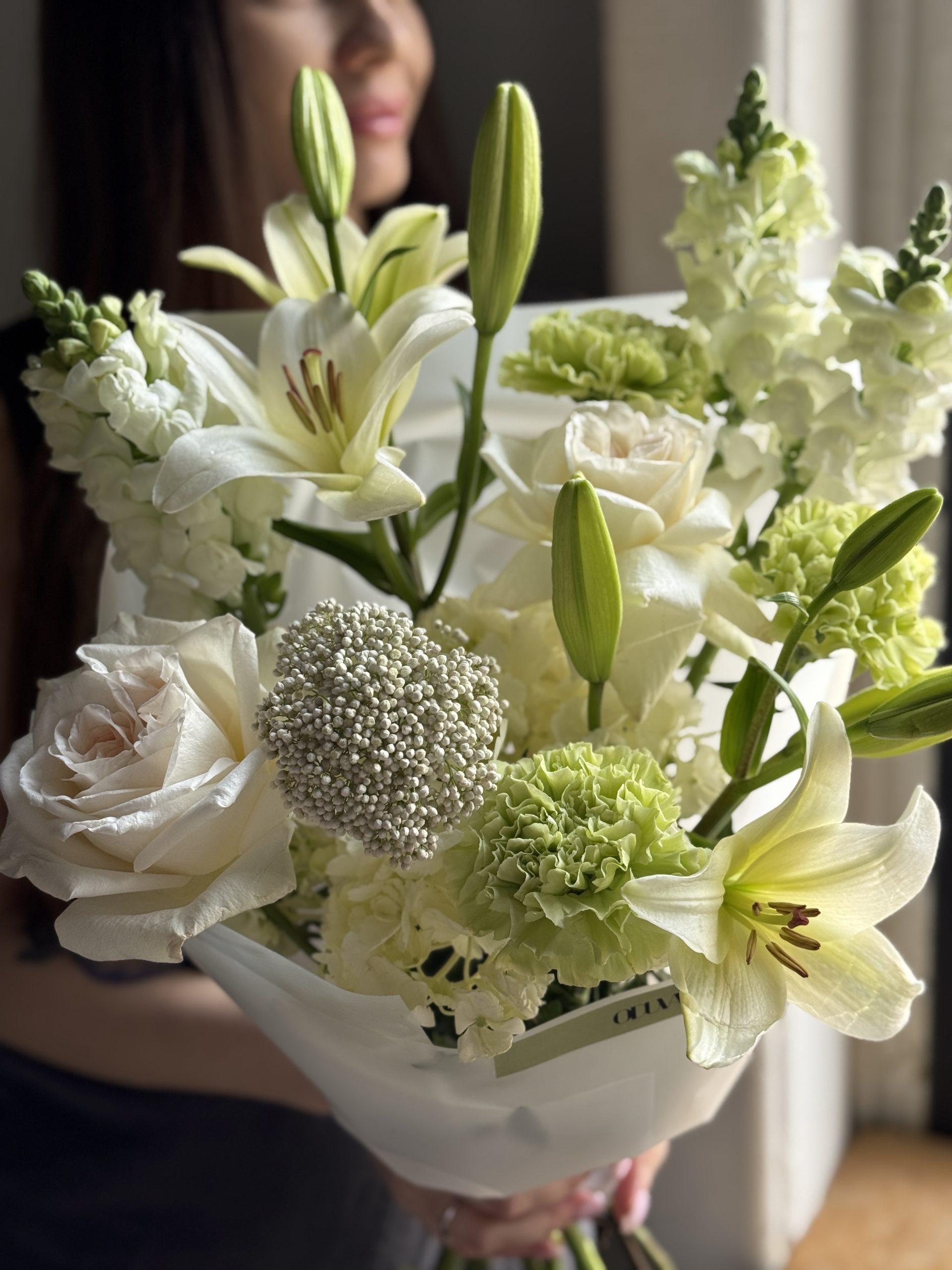 Описание: Сборный букет с лилиями, леувенбеками, озотамнусом, диантусами, гортензией и садовыми розами Вайт Охара.