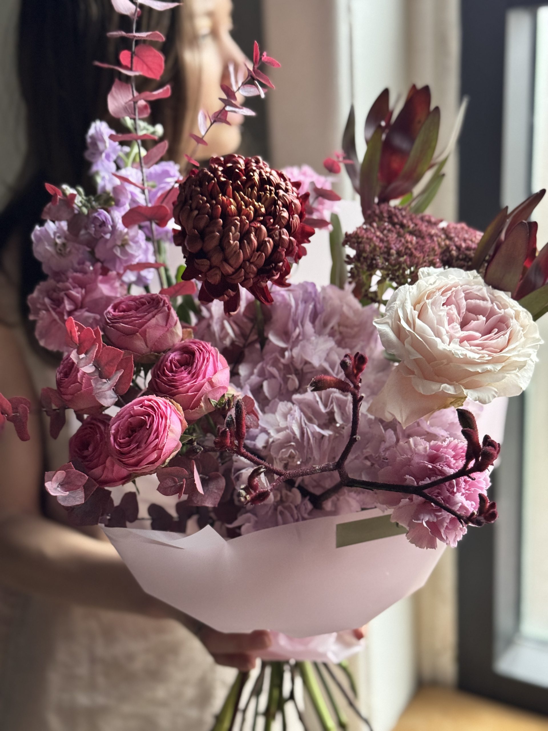 Описание: Сборный букет с хризантемами Бигуди, кустовыми пионовидными розами, диантусами, листьями эвкалипта и веточками стабилизированного эвкалипта.