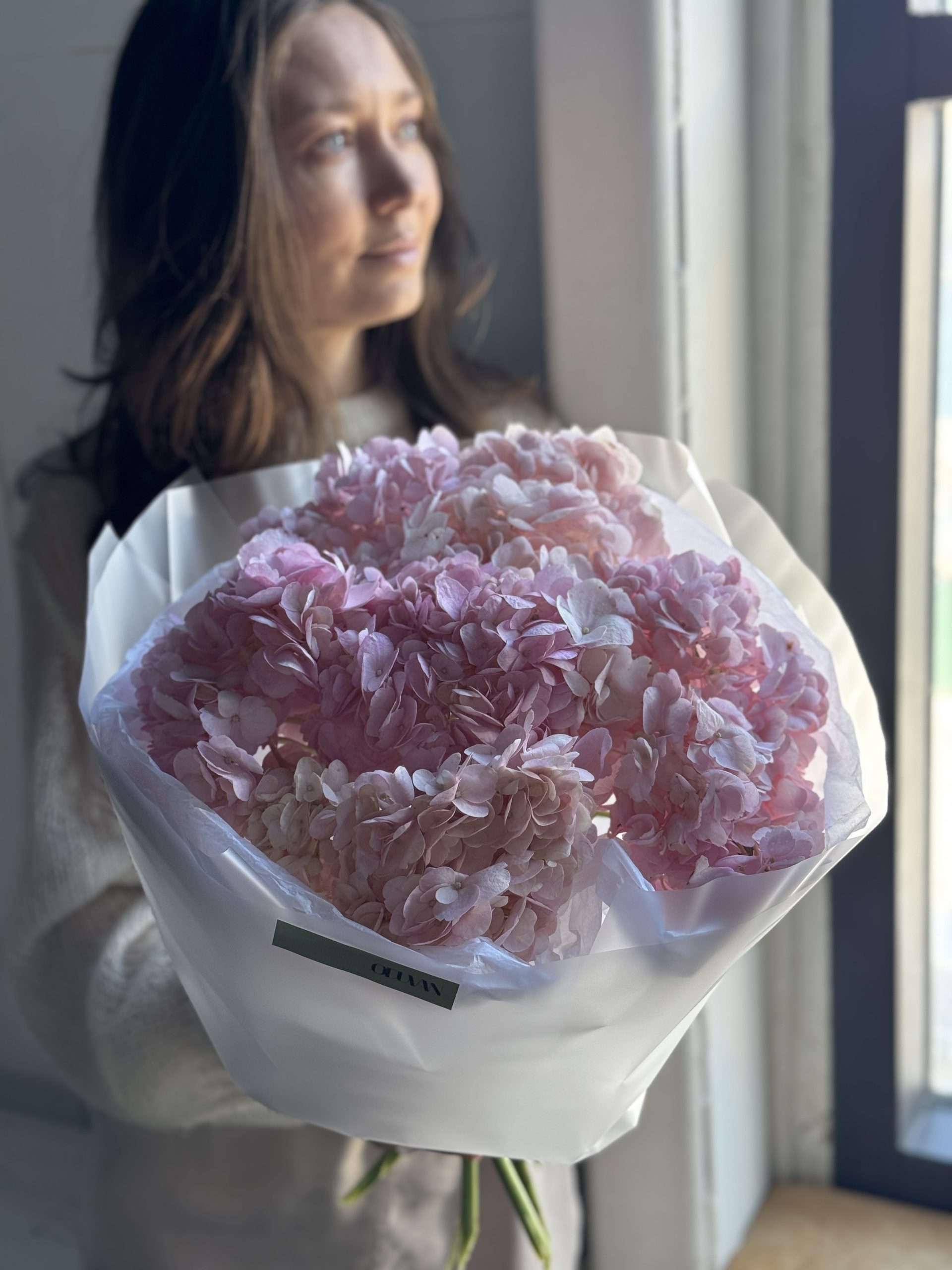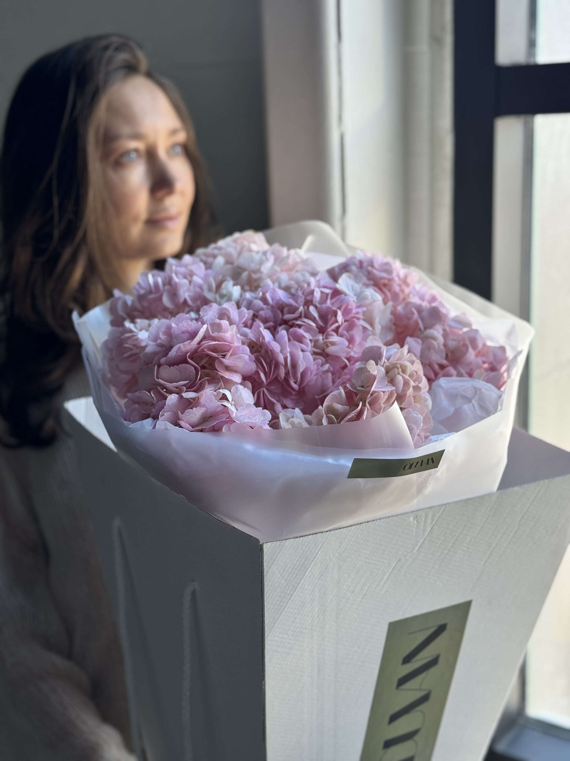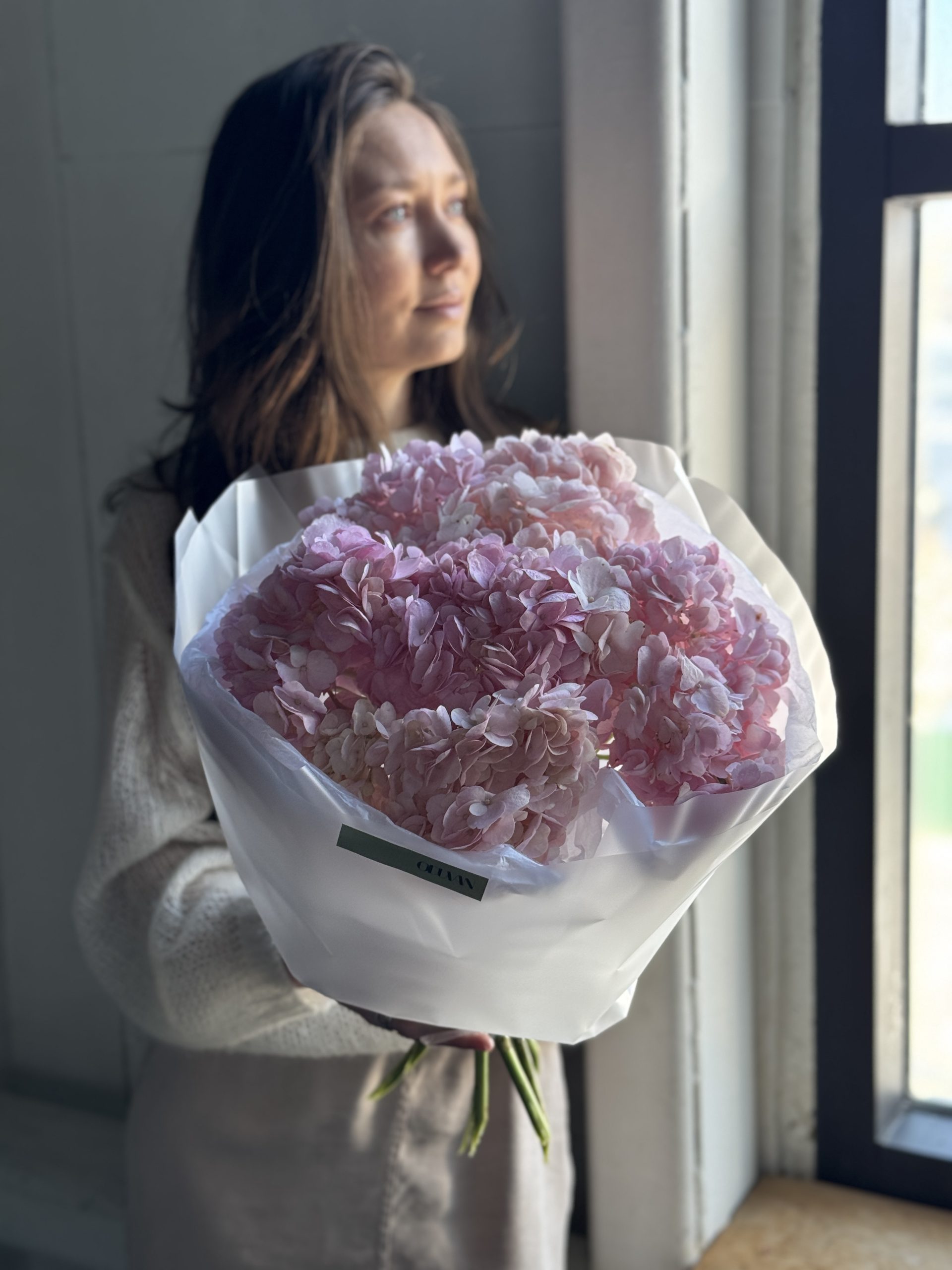 Описание: Монобукет из 5 розовых гортензией в авторской упаковке.