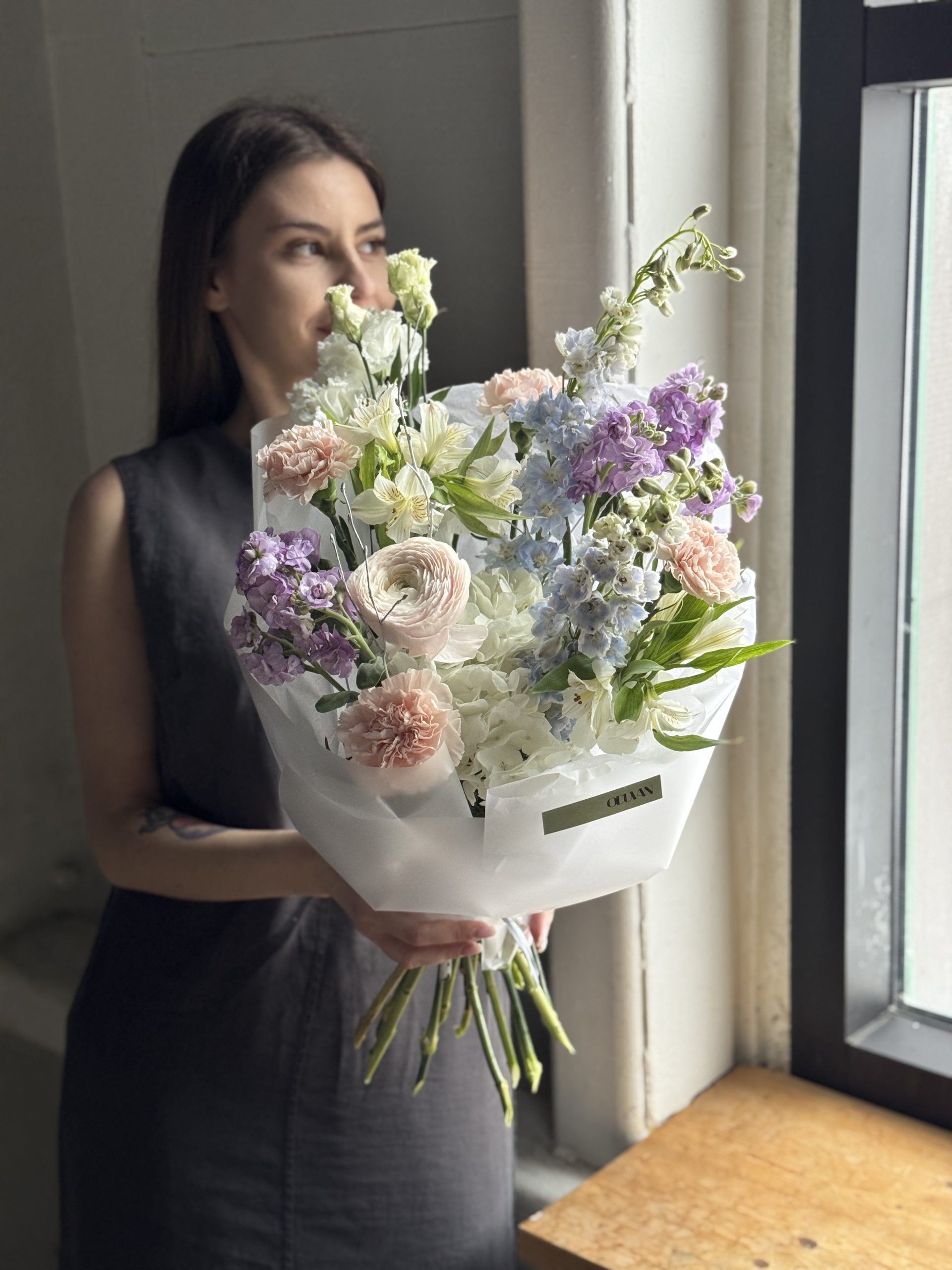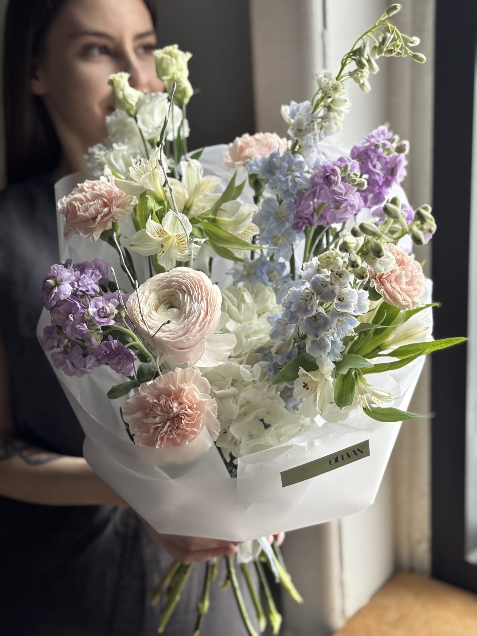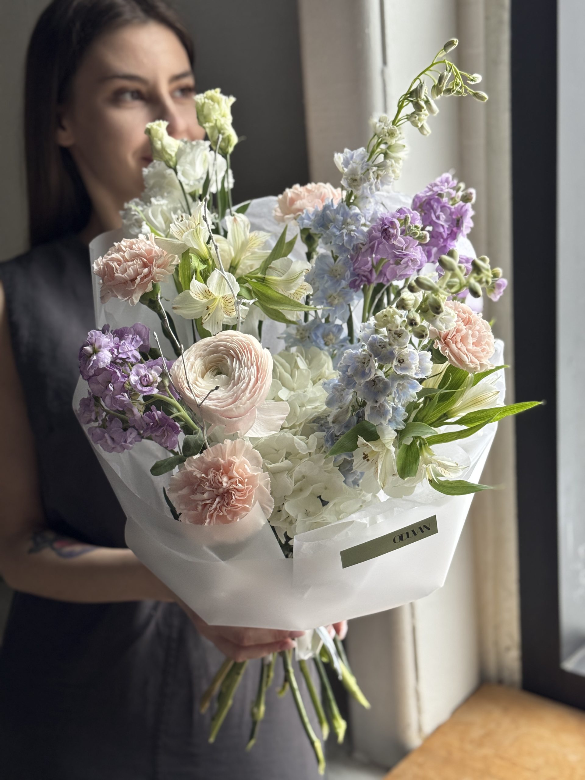 Описание: Сборный букет с гортензией, дельфиниумом, ароматными маттиолами, эустомой, ранункулюсом, диантусами, альстромериями и веточками березы