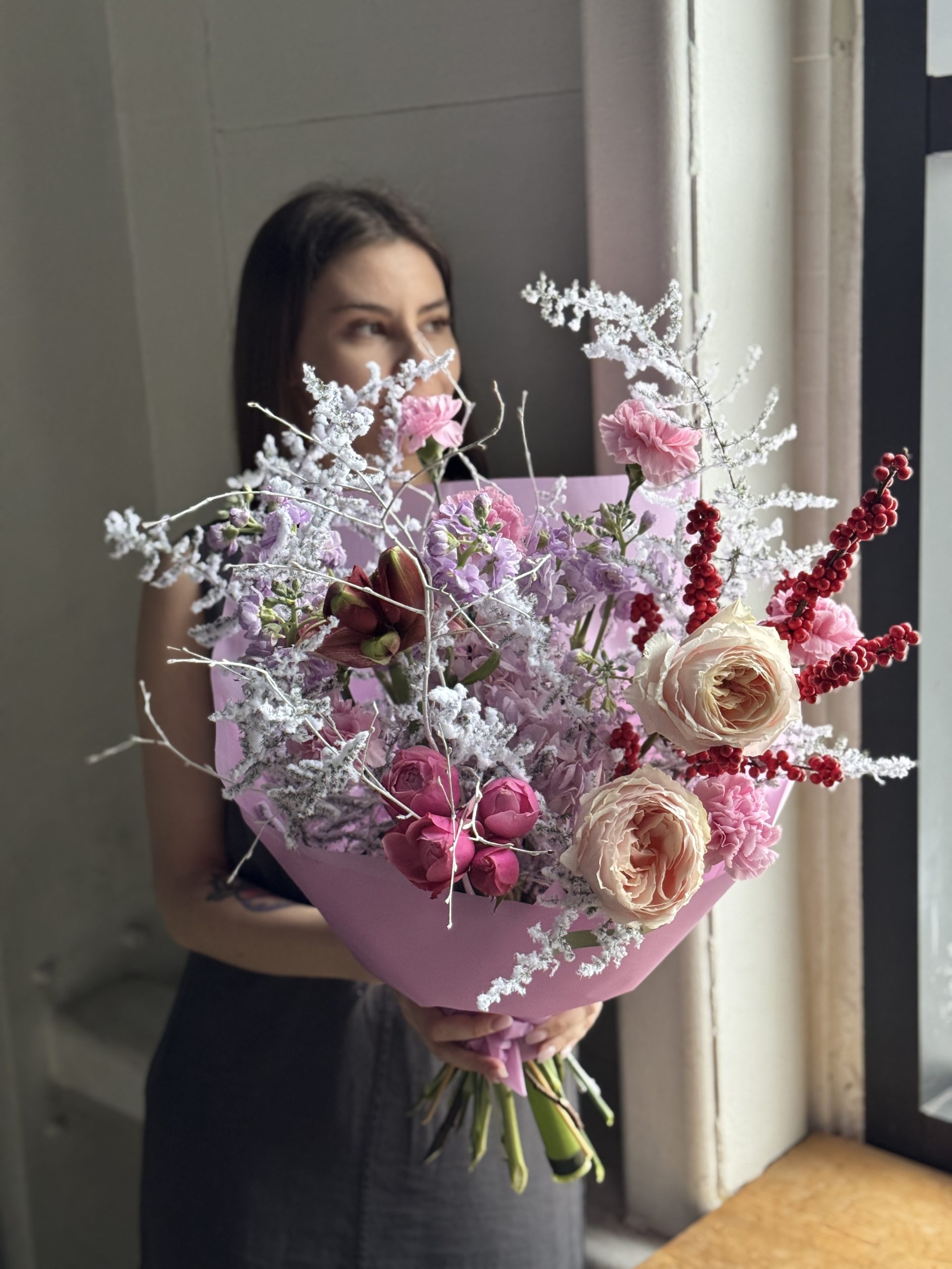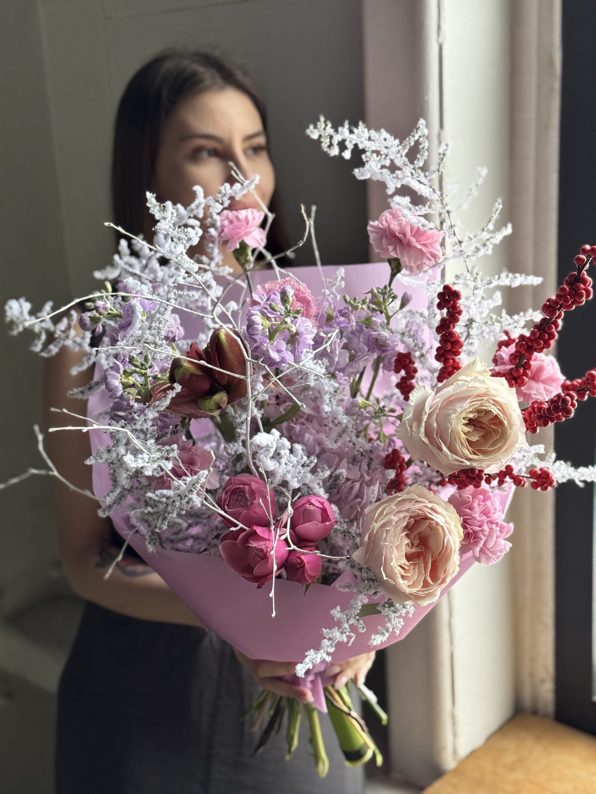 Описание: Сборный букет с гортензией, веточками Илекса, диантусами, садовыми розами Тсумуги, амариллисом, ароматной маттиолой, кустовой розой, заснеженным аспарагусом и ветками березы.