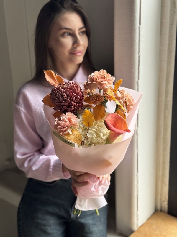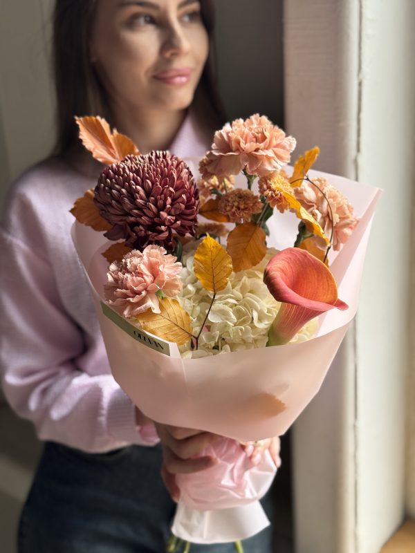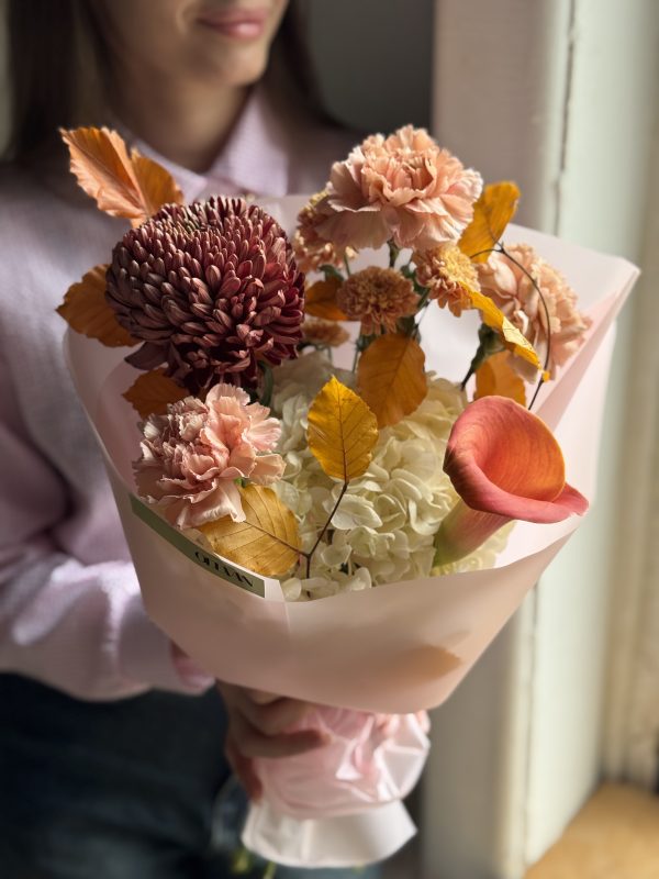 Описание: Сборный букет с гортензией, каллой, хризантемой Бигуди, диантусами и веточками бука.