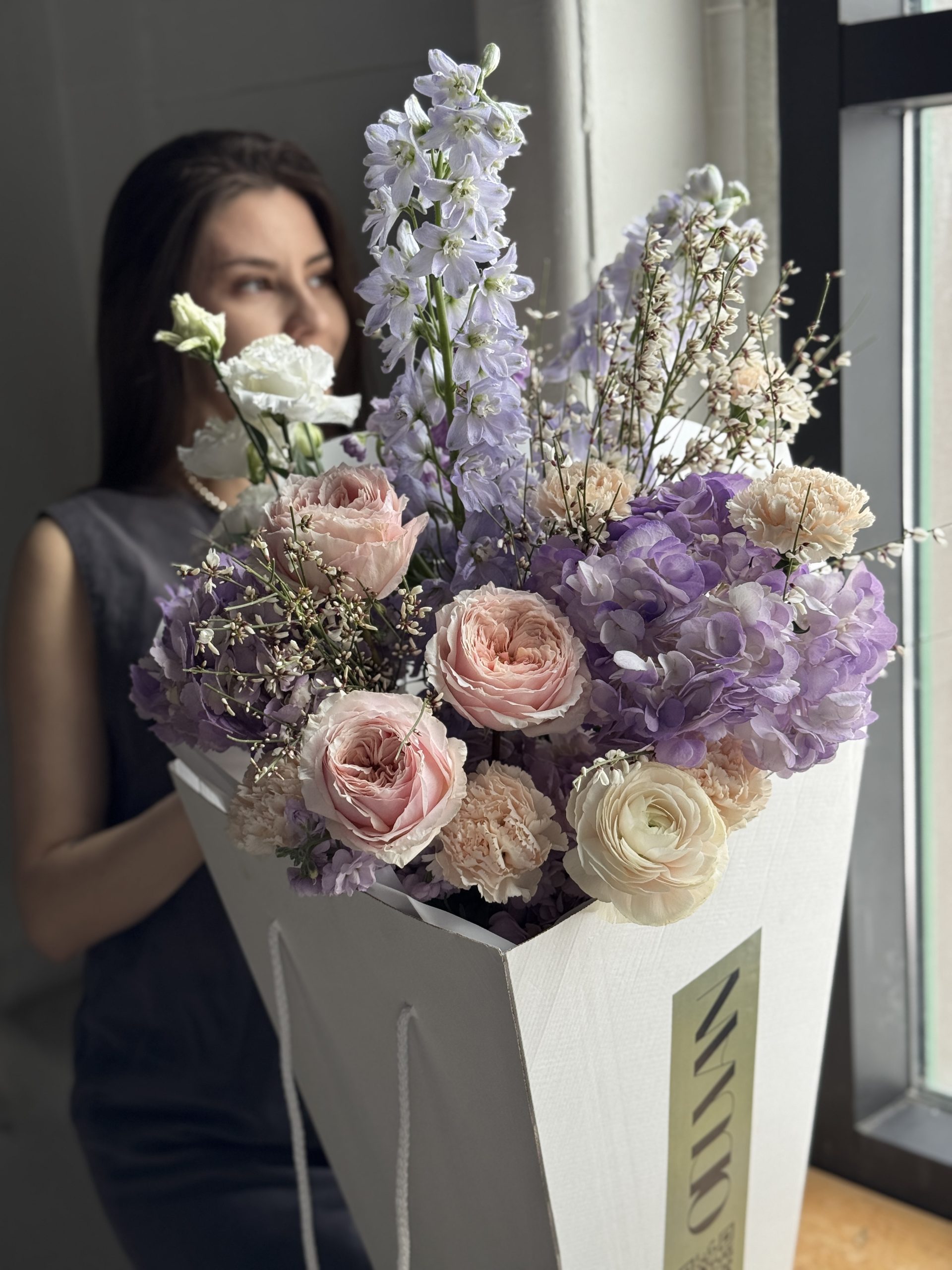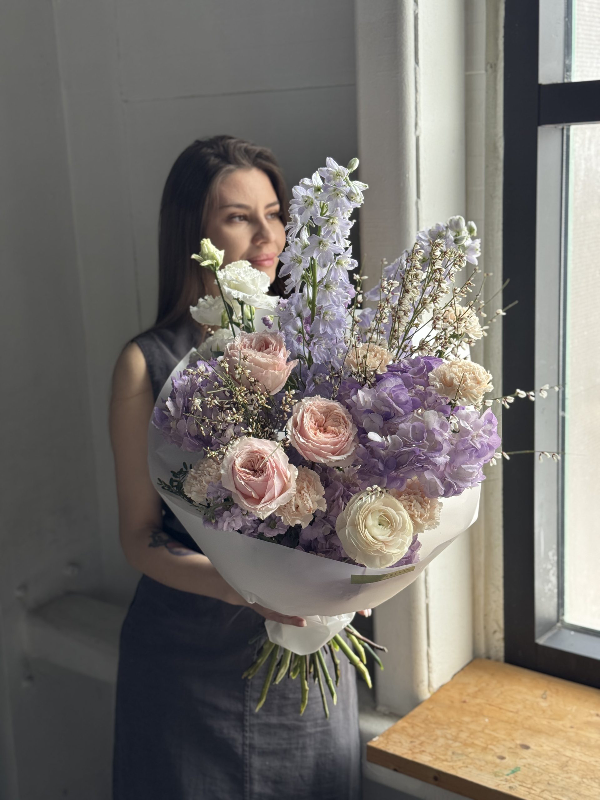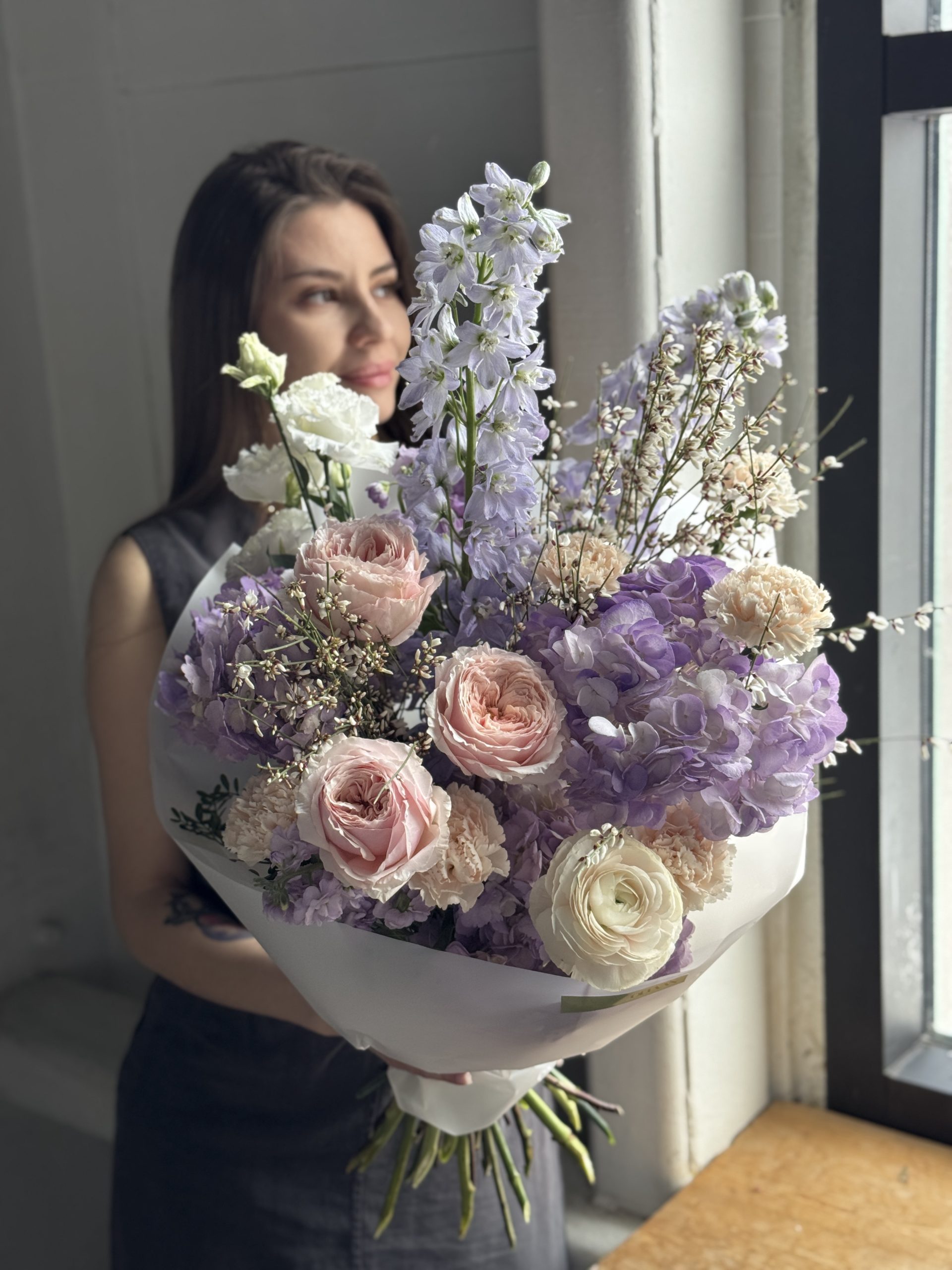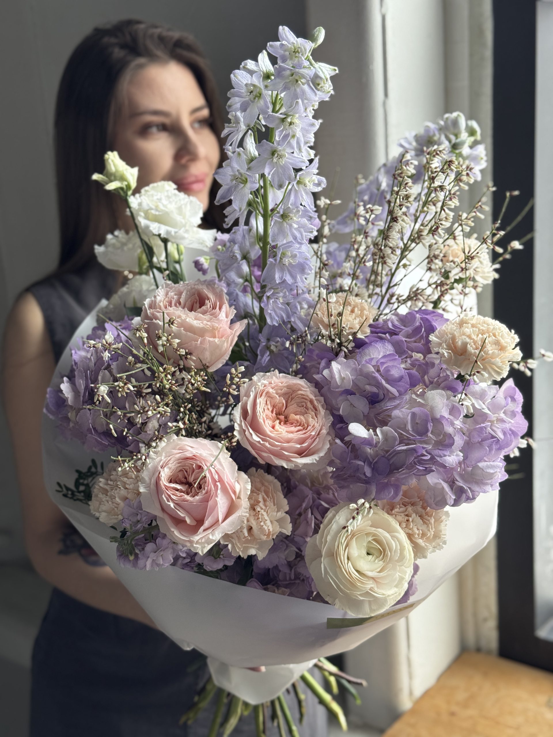 Описание: Сборный букет с гортензиями, дельфиниумами, ранункулюсом, садовыми розами, ароматными маттиолами, диантусами, эустомой и ароматной генистой.
