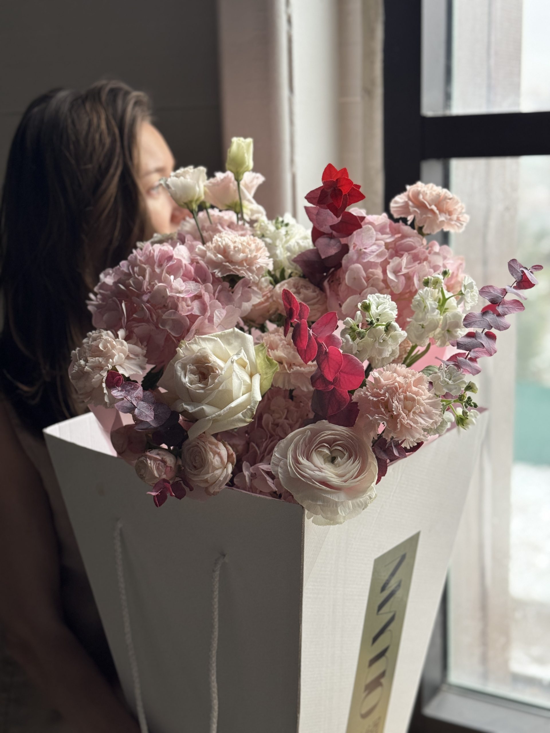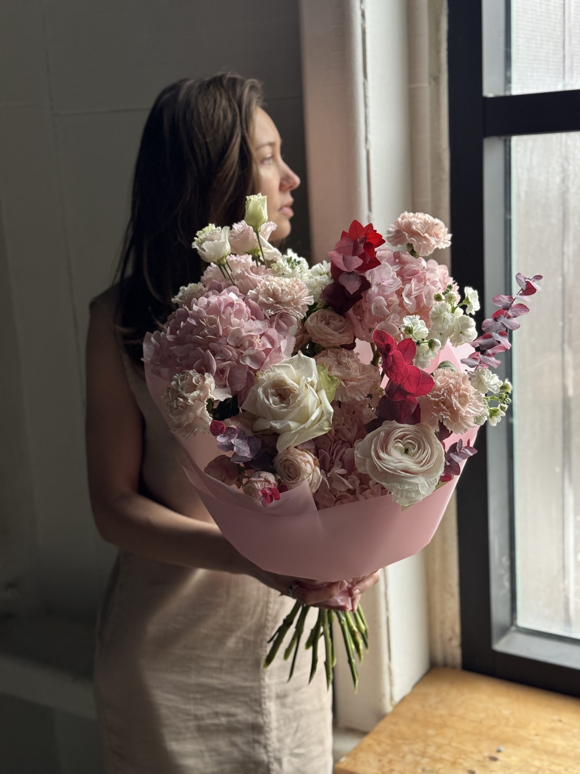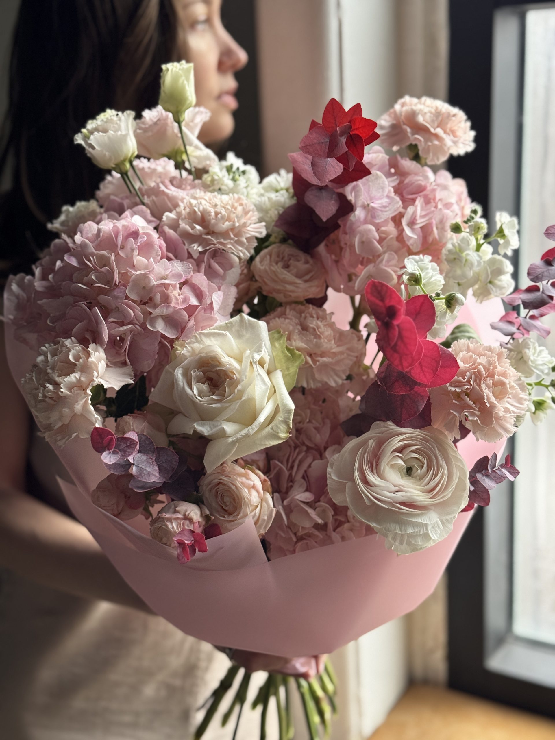 Описание: Сборный букет с ранункулюсами, диантусами, листьями эвкалипта, садовыми розами и кустовой маттиолой
