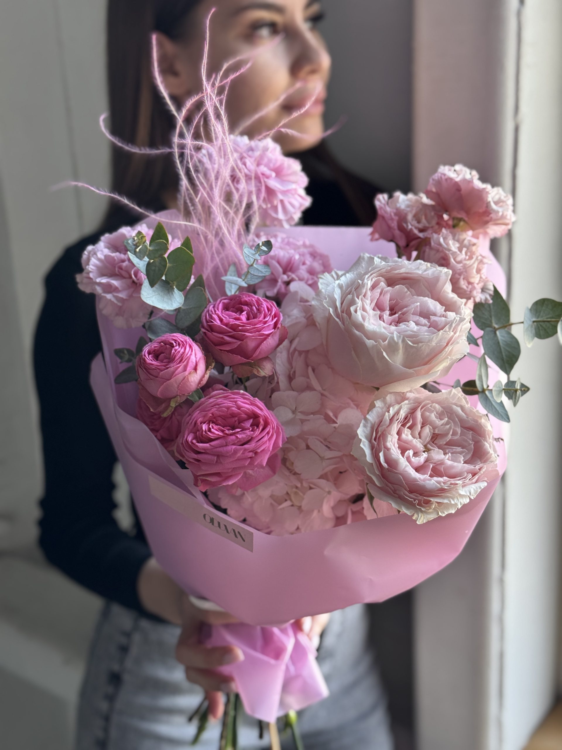 Описание: Сборный букет с гортензией, садовыми и кустовой розами, диантусами, эцстомой, пушистой стифой и веточками эвкалипта.