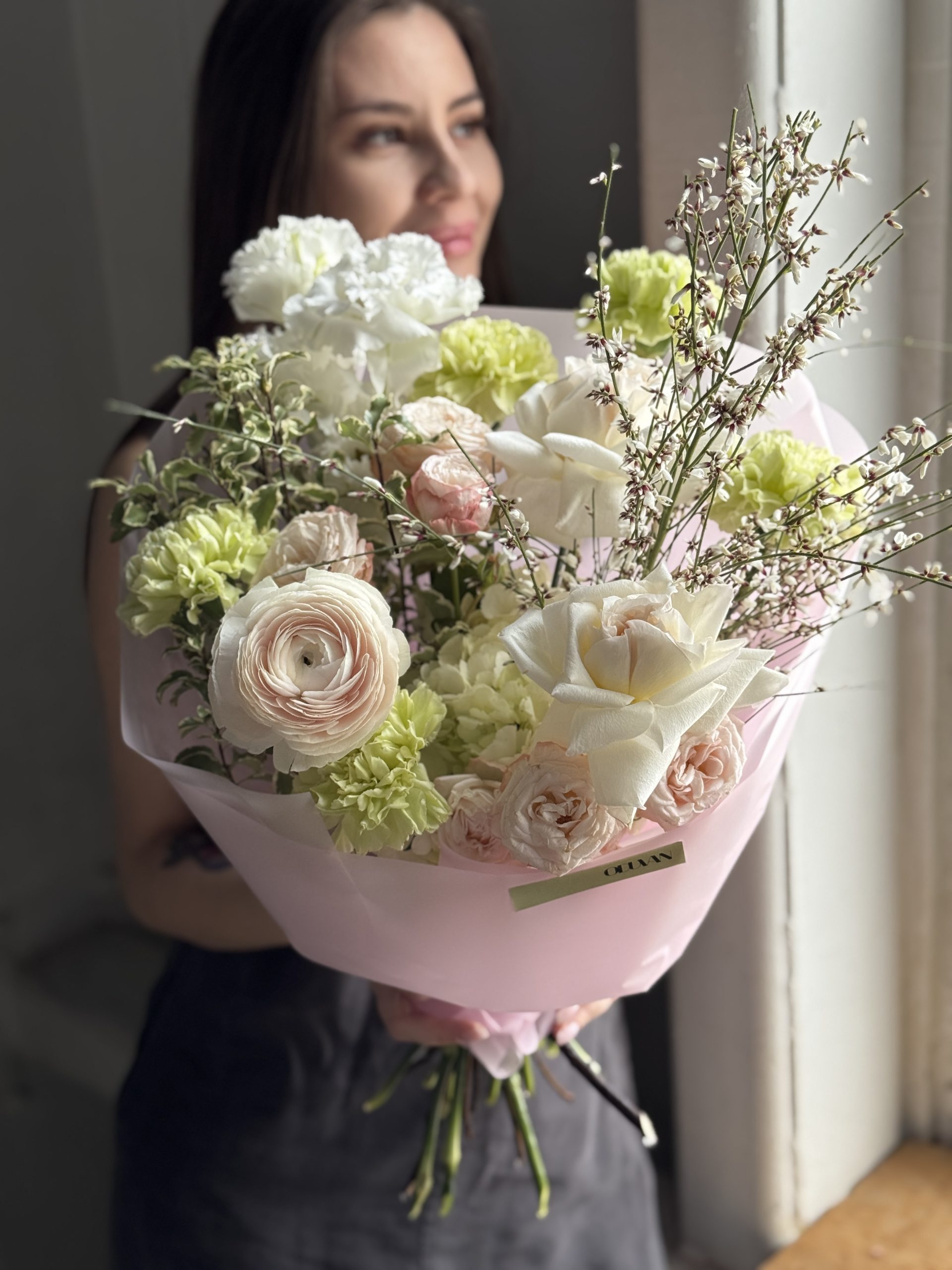 Описание: Сборный букет с гортензией, ароматными розами Вайт Охара, ранункулюсом, эустомой, кустовыми розами Бомбастик, сортовыми гвоздиками, веточками генисты и листьями питтоспорума.