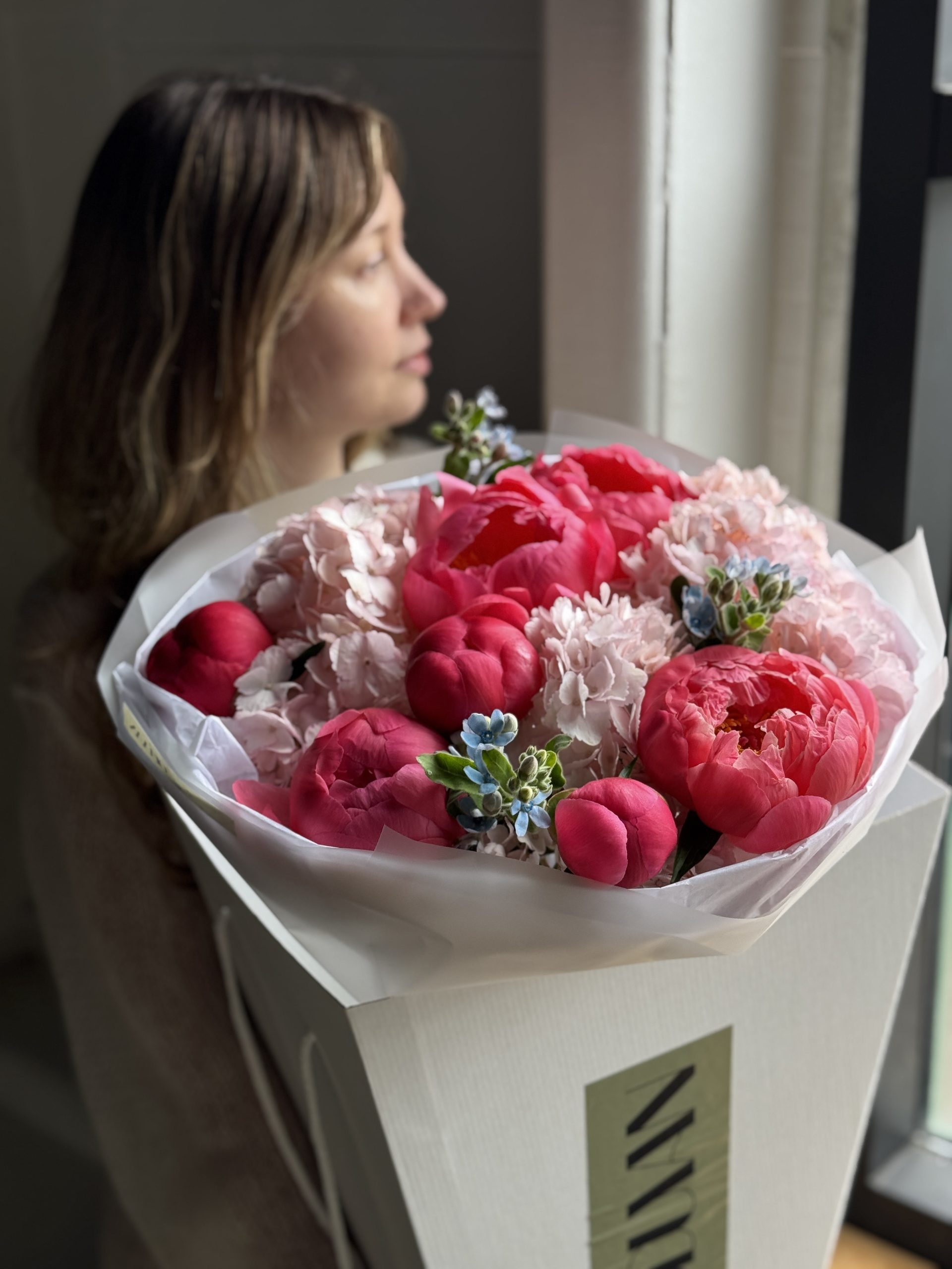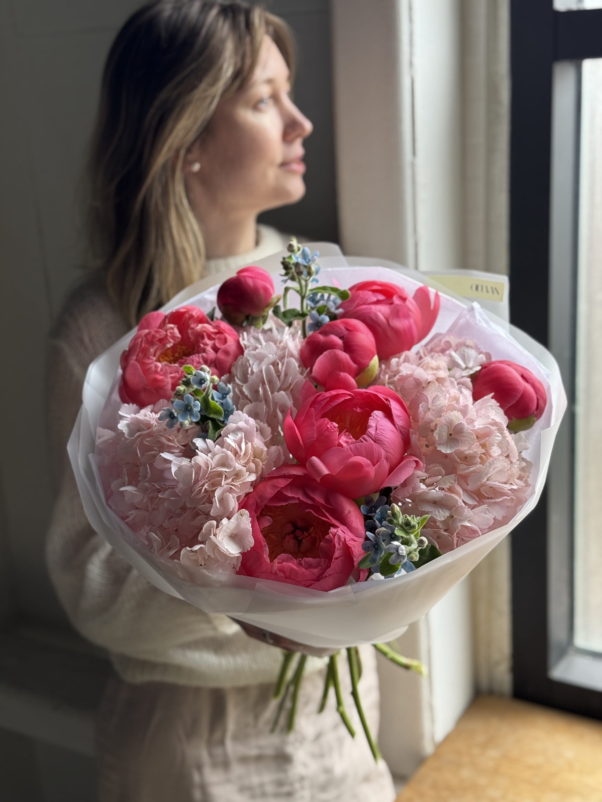 Описание: Сборный букет с гортензиями, коралловыми пионами и твидиями.