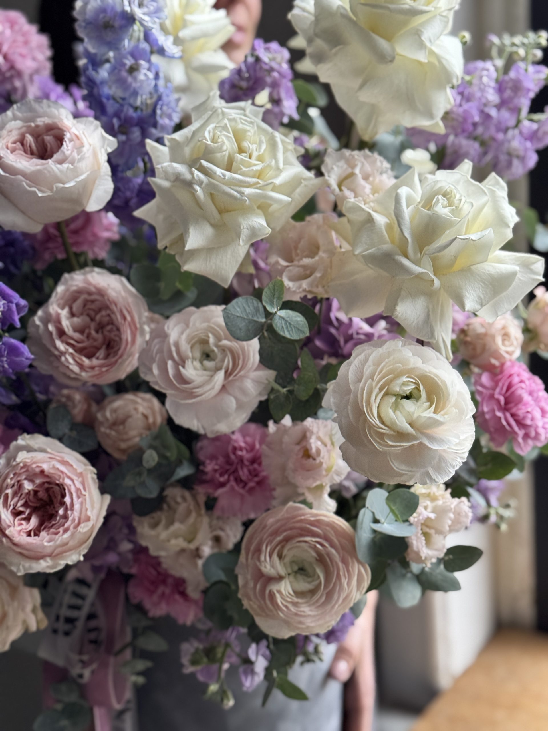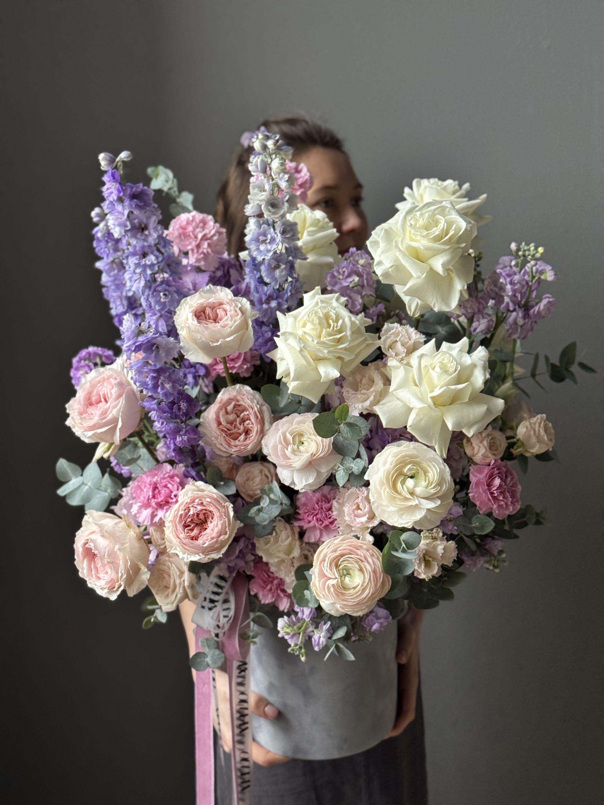 Описание: Композиция в бархатной коробке с дельфиниумами, садовыми ароматными розами, гортензиями, ранункулюсами, ароматными маттиолами, кустовыми розами, диантусами и веточками эвкалипта.