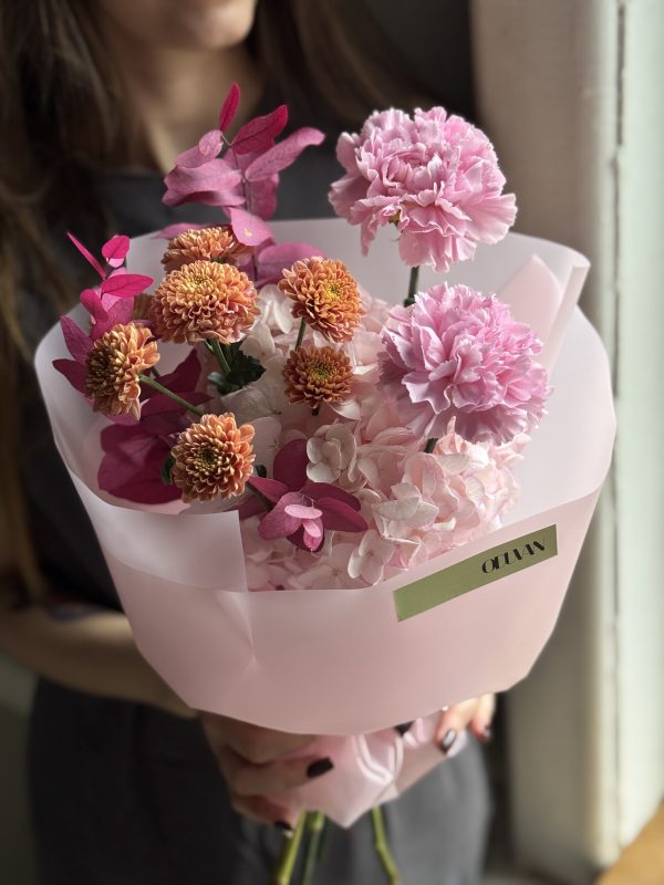Описание: Сборный букет с гортензией, кустовой хризантемой, диантксами и веточками стабилизированного эвкалипта.