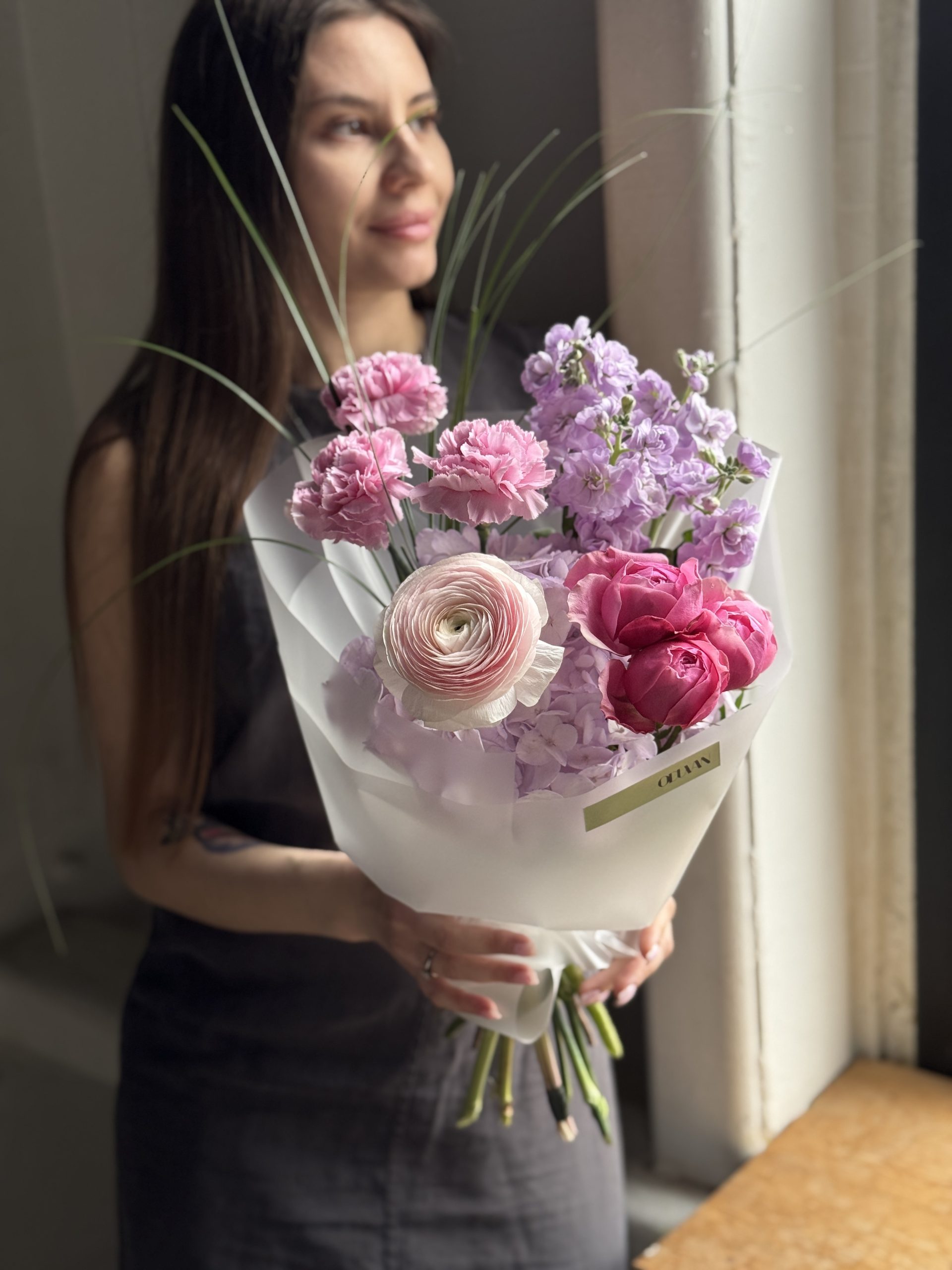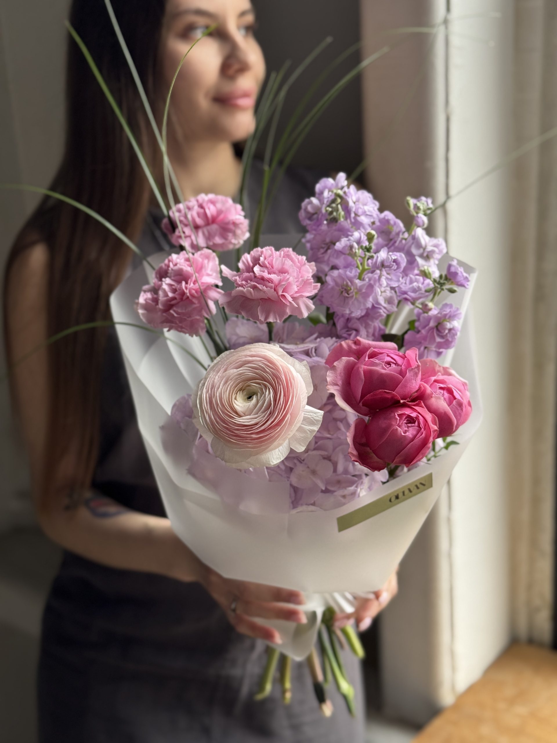 Описание: Сборный букет с гортензией, кустовой розой Жизель, ароматной маттиолой, ранункулюсом, диантусами и листьями берграсса.