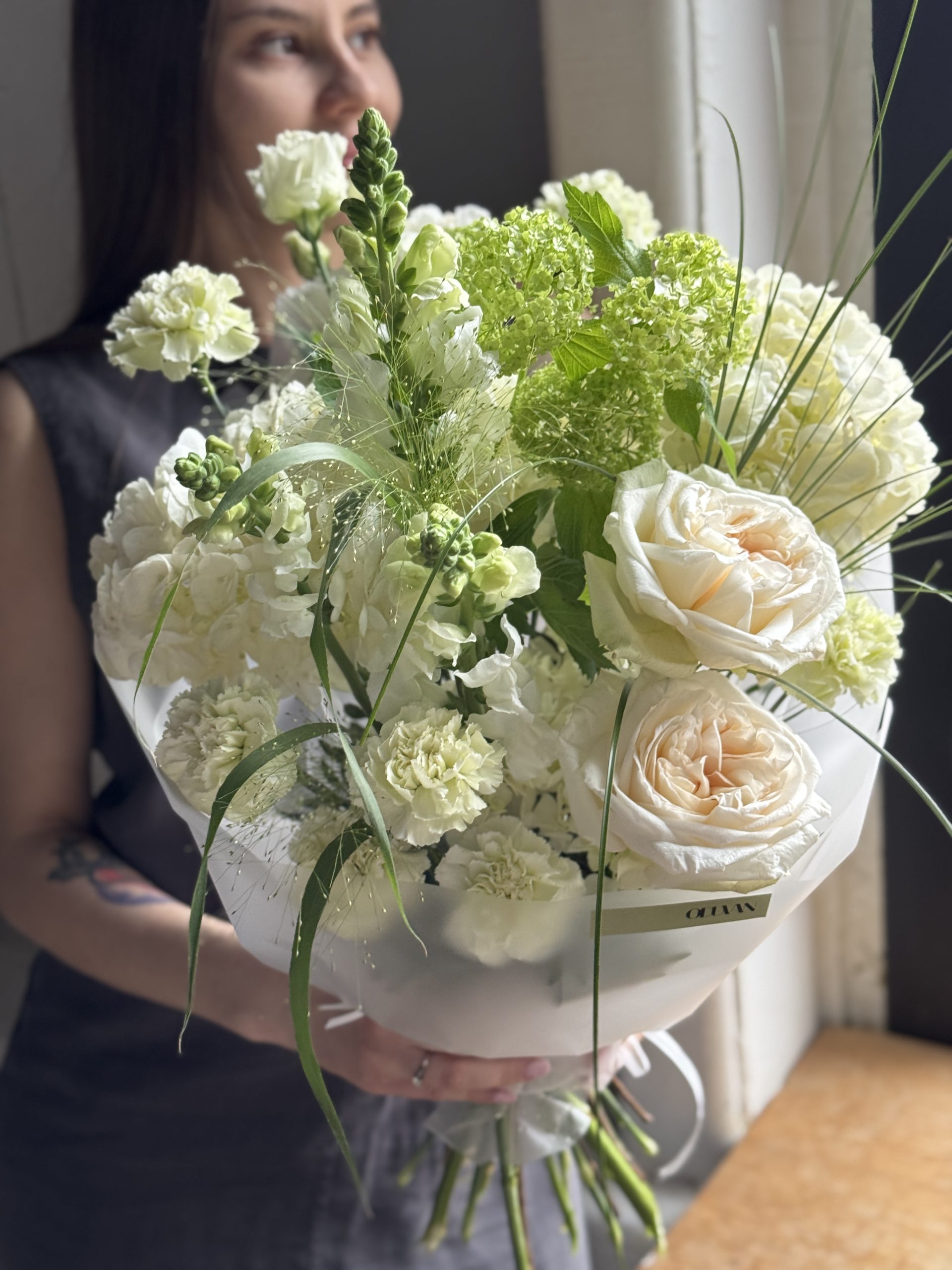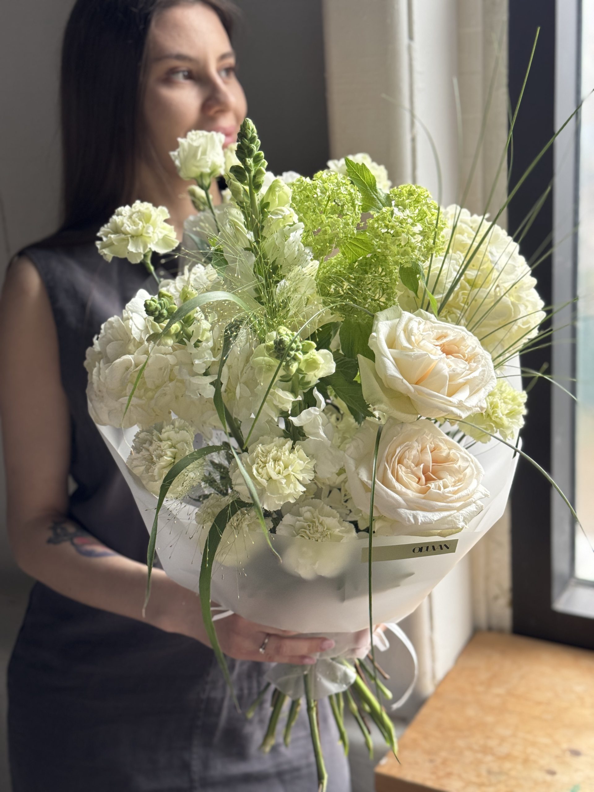 Описание: Сборный букет с гортензиями, леувенбеками, садовыми розами Вайт Охара, эустомой, диантусами, зеленым вибурнумом, листьями берграсса и пушистыми веточками паникума.