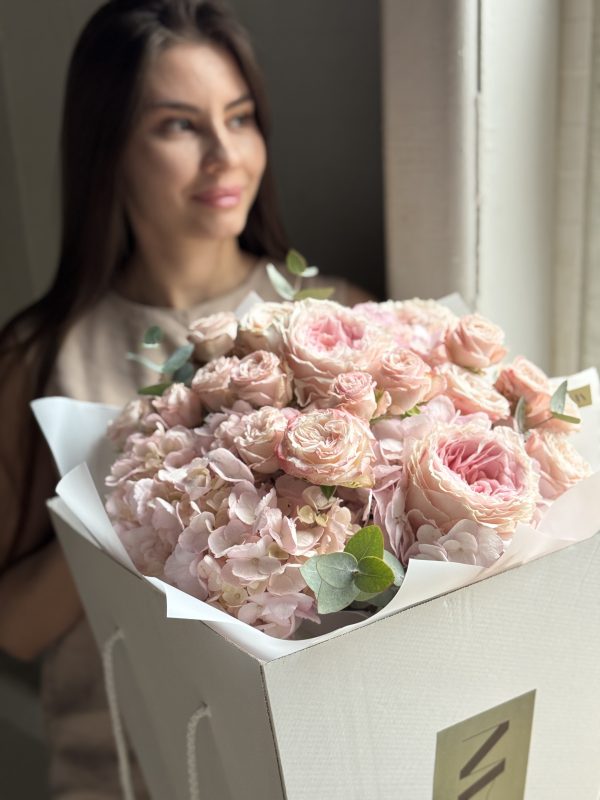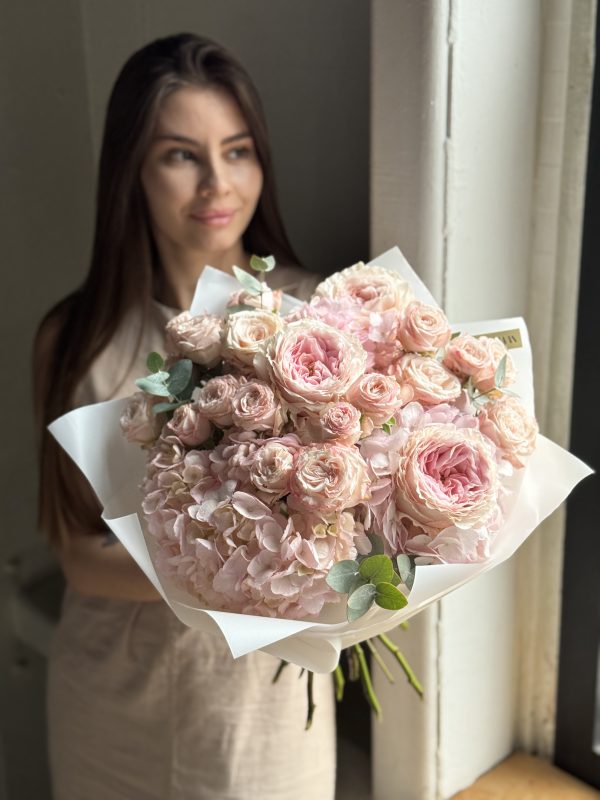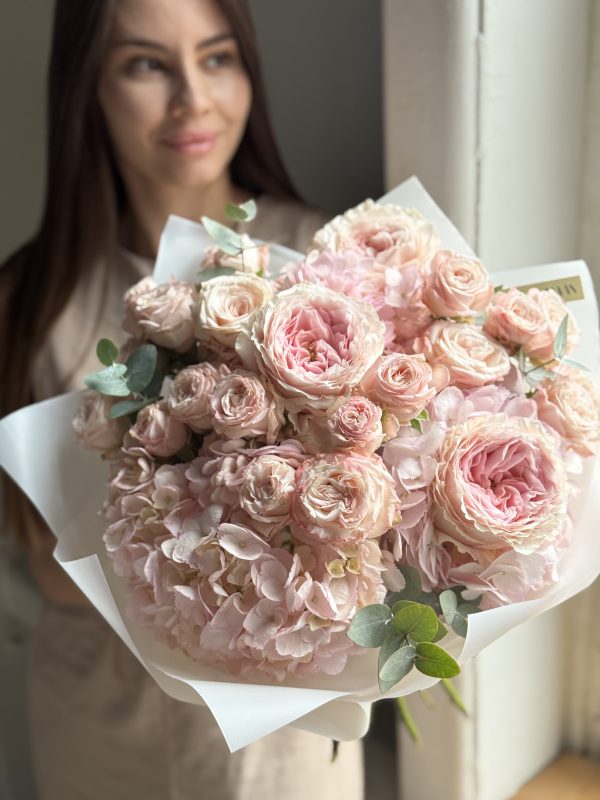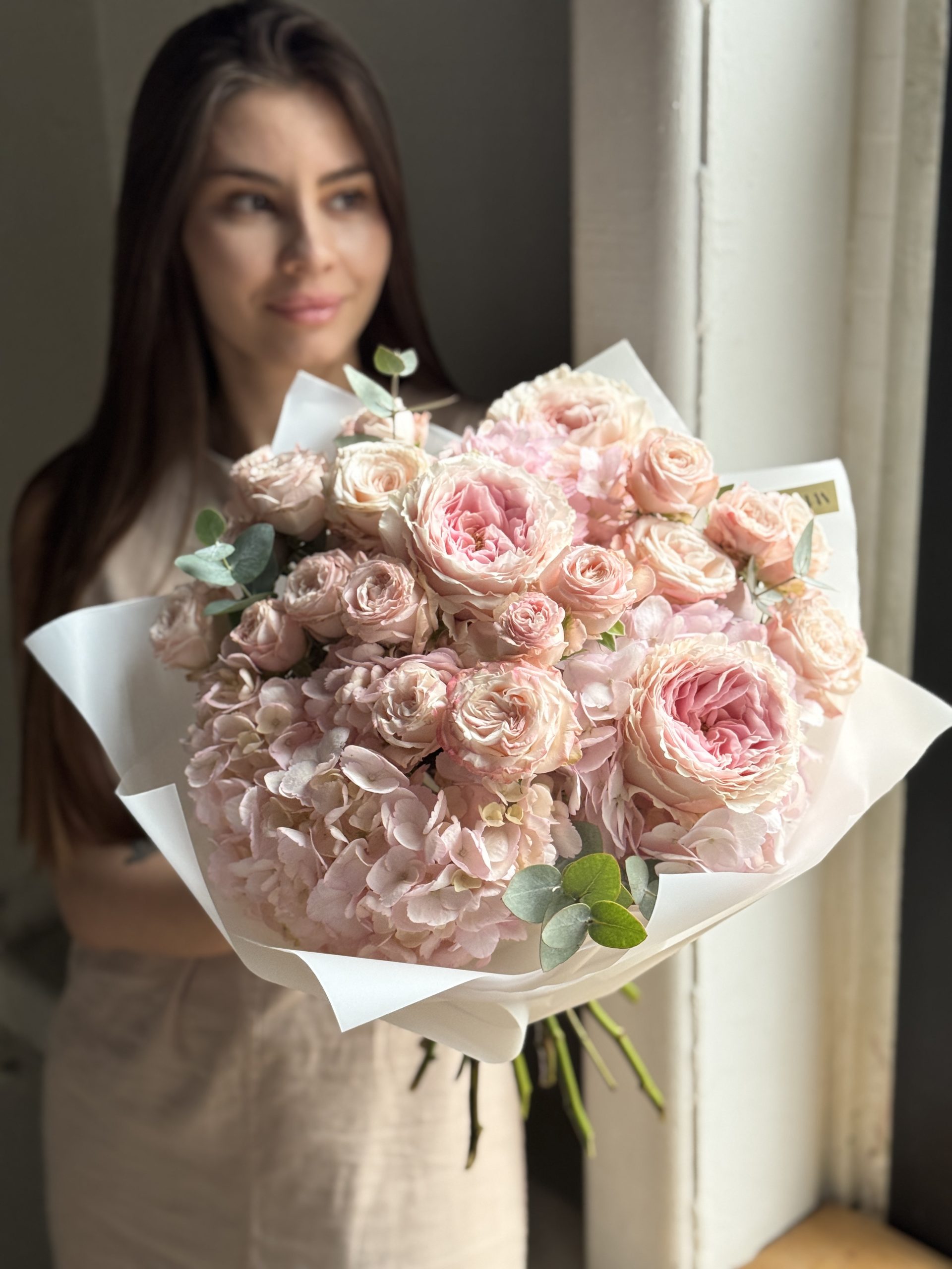 Описание: Сборный букет с гортензиями, кустовыми розами Бомбастик, садовыми Тсумуги и веточками эвкалипта.