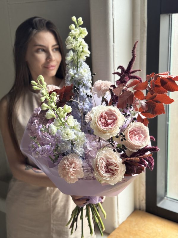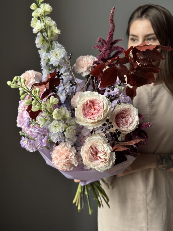 Описание: Сборный букет с гортензией, садовыми розами Тсумуги, объемными дельфиниумами, кустовой маттиолой, диантусами, амарантами, черными ягодами вибурнума и листьями бука.