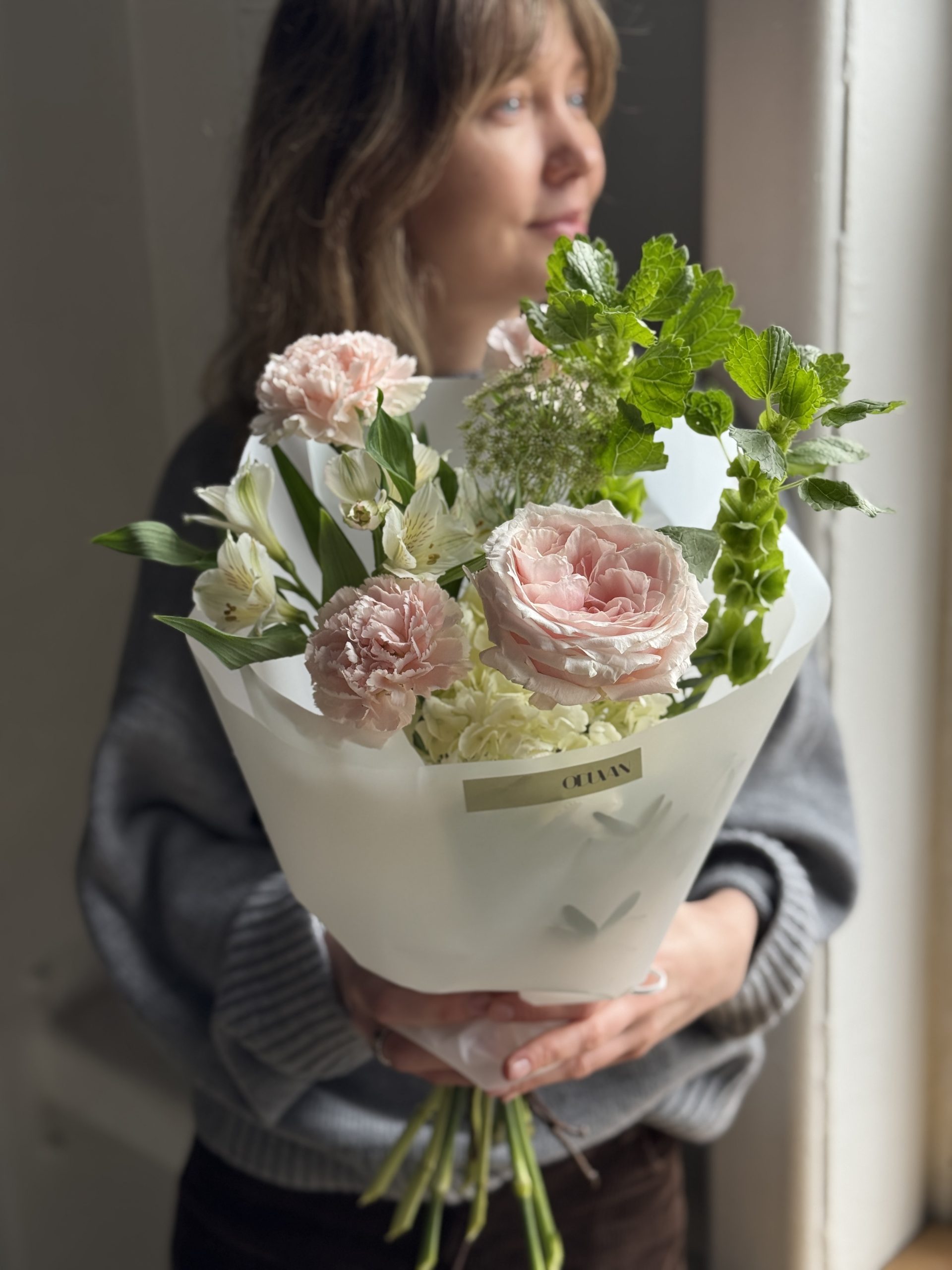 Описание: Сборный букет с гортензией, садовой розой, альстромерией, диантусами, амми и молуцеллой.