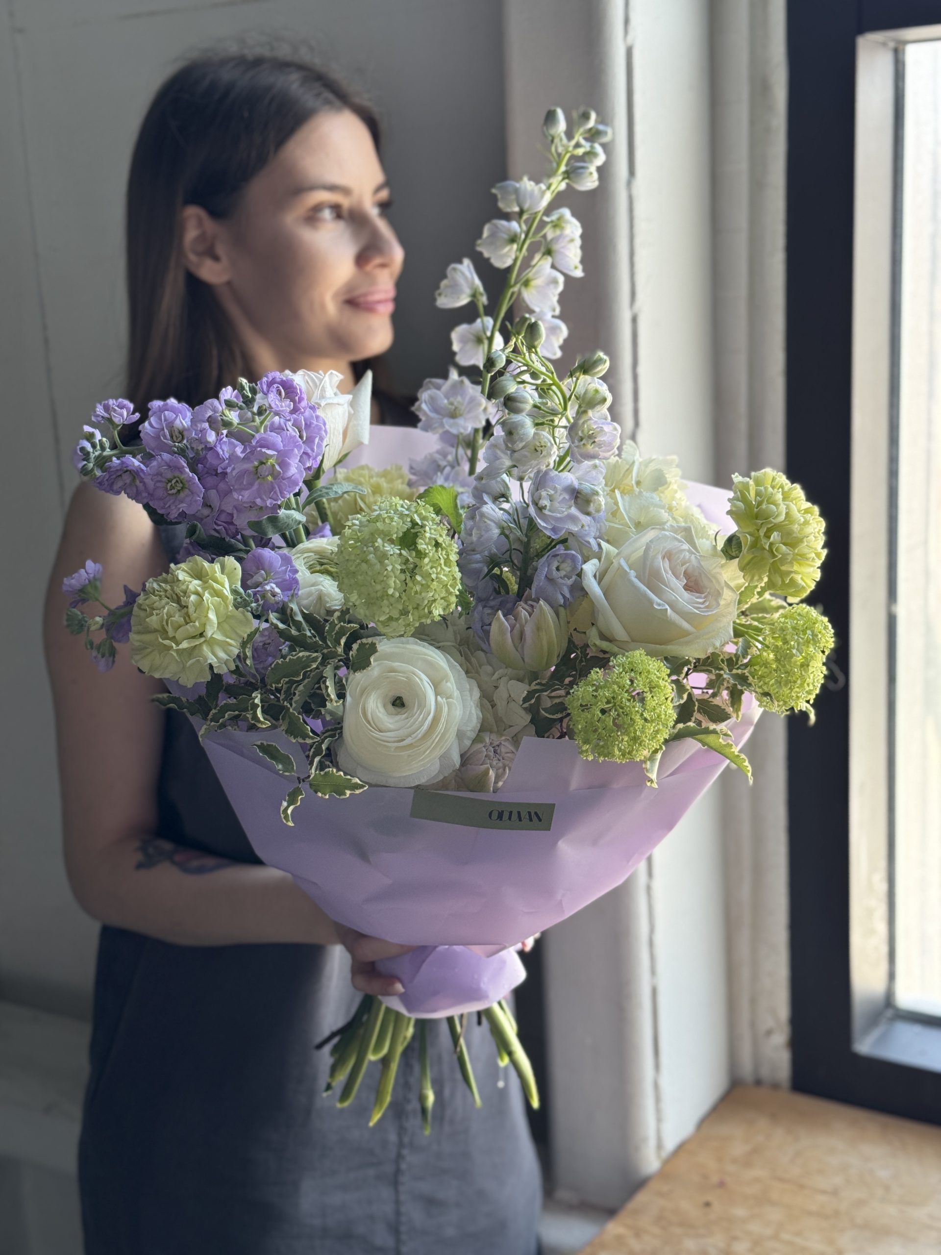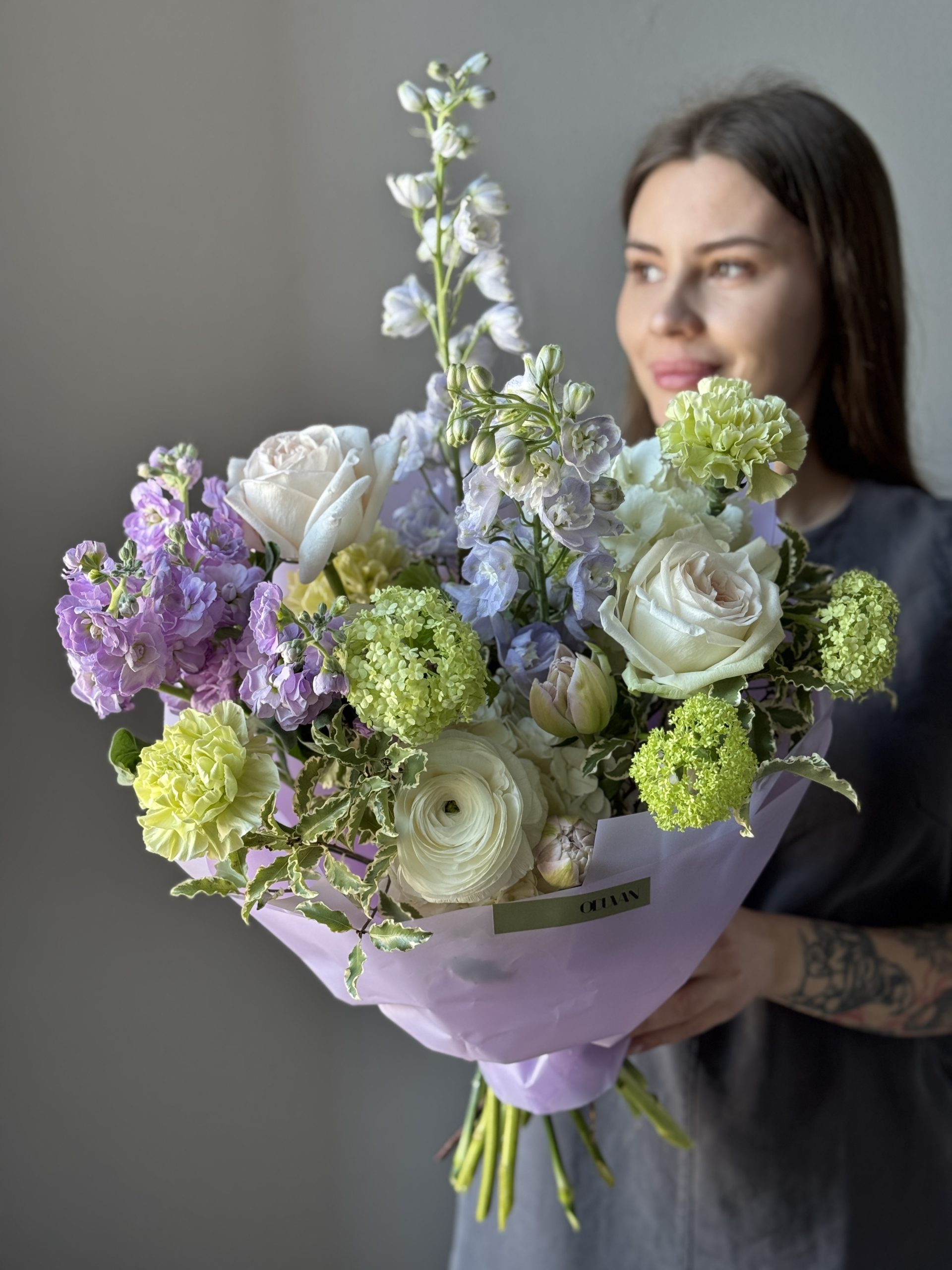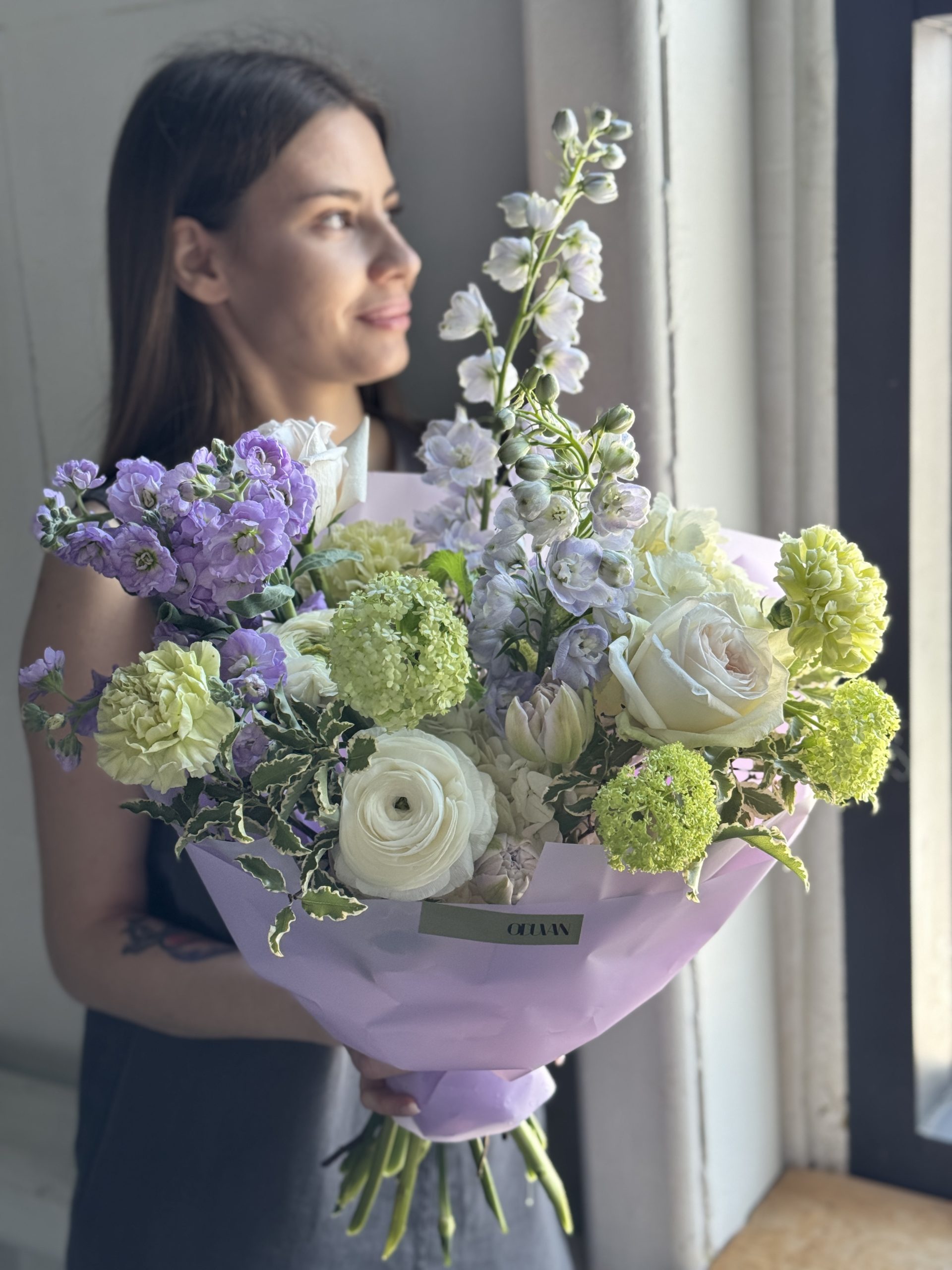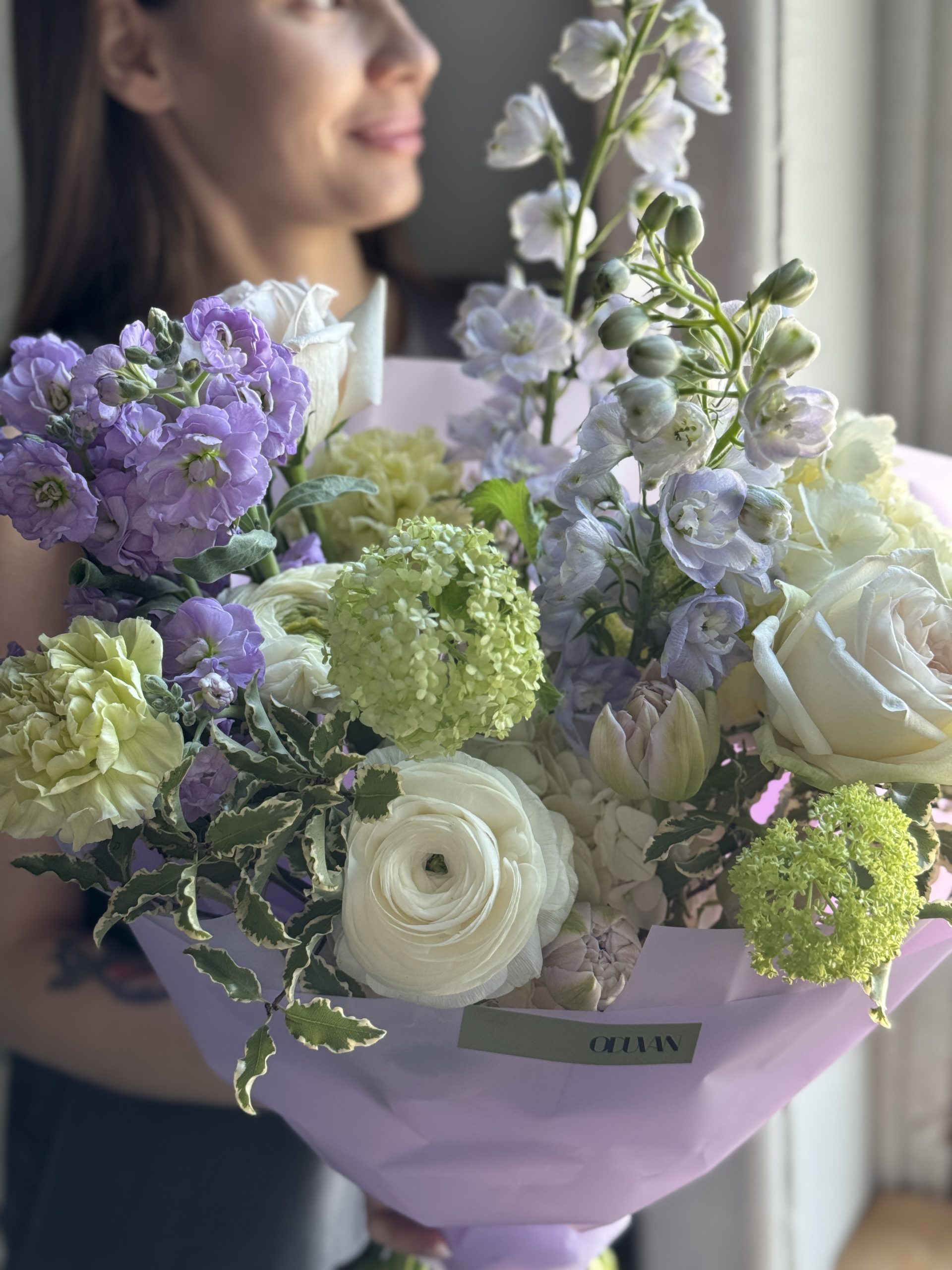 Описание: Сборный букет с гортензиями, ранункулюсами, дельфиниумами, пионовидными тюльпанами, зеленым вибурнумом, ароматной маттиолой и листьями питтоспорума.
