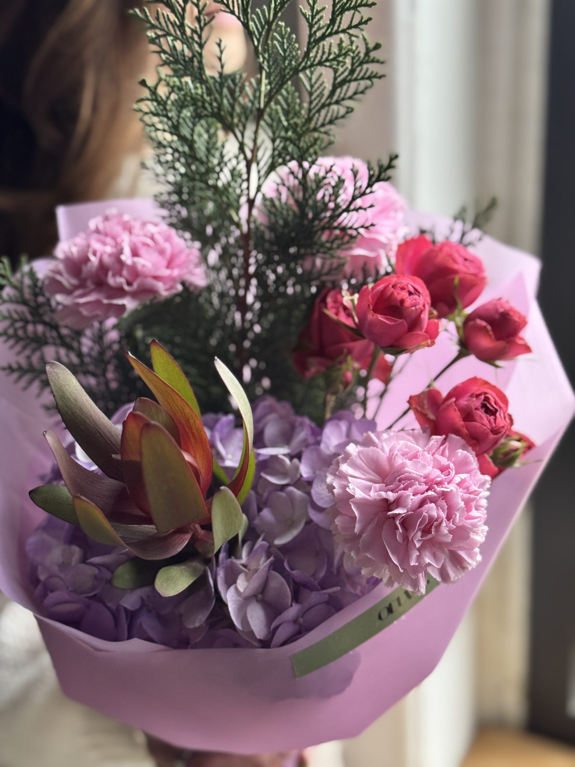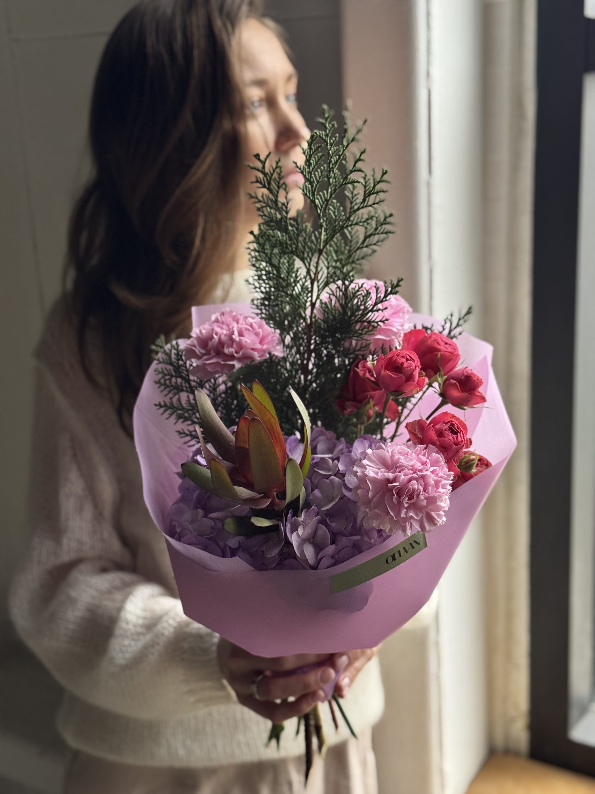 Описание: Сборный букет с гортензией, леукаденроном, диантусами, кустовой розой и веточкой туи.