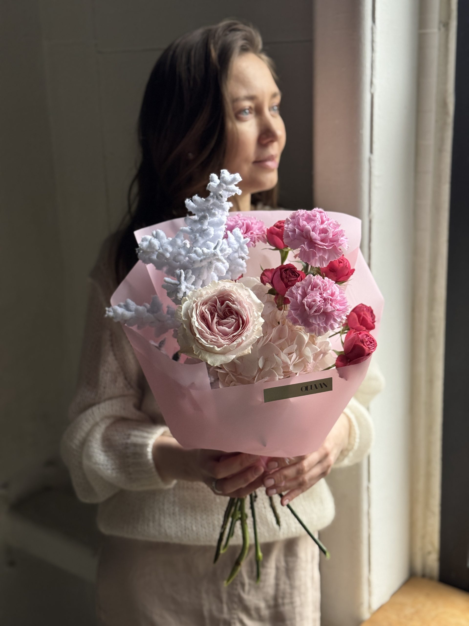 Описание: Сборный букет с гортензией, садовой розой Тсумуги и кустовой Жизель, гвоздиками и заснеженным рускусом.