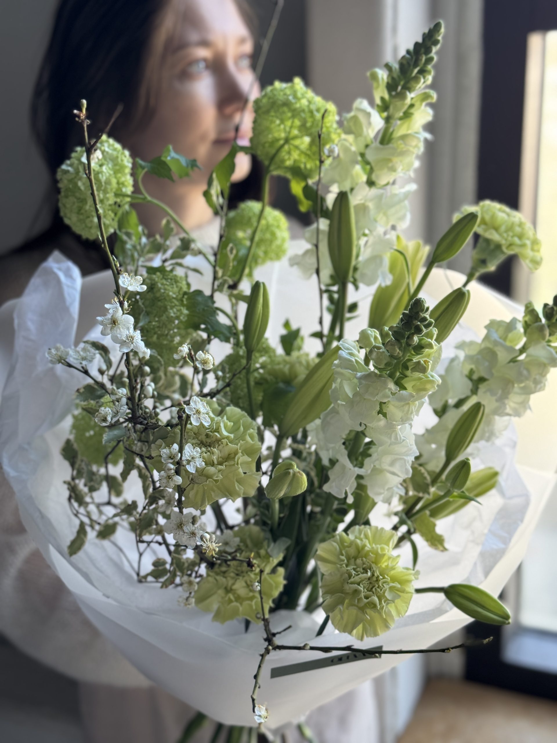 Описание: Сборный букет с каллами, лилиями, леувенбеками, диантусами, зеленым вибурнумом и цветущими веточками.