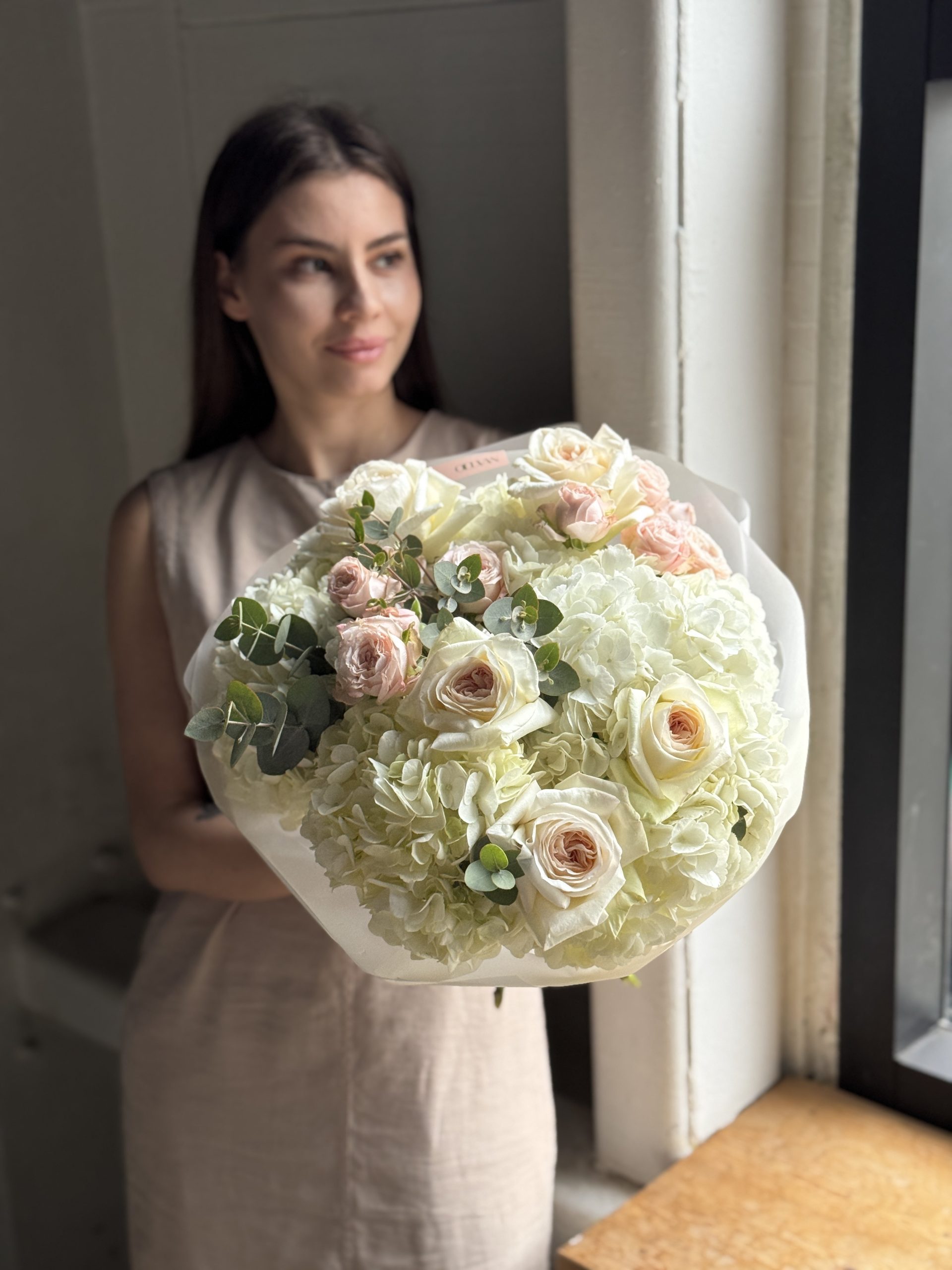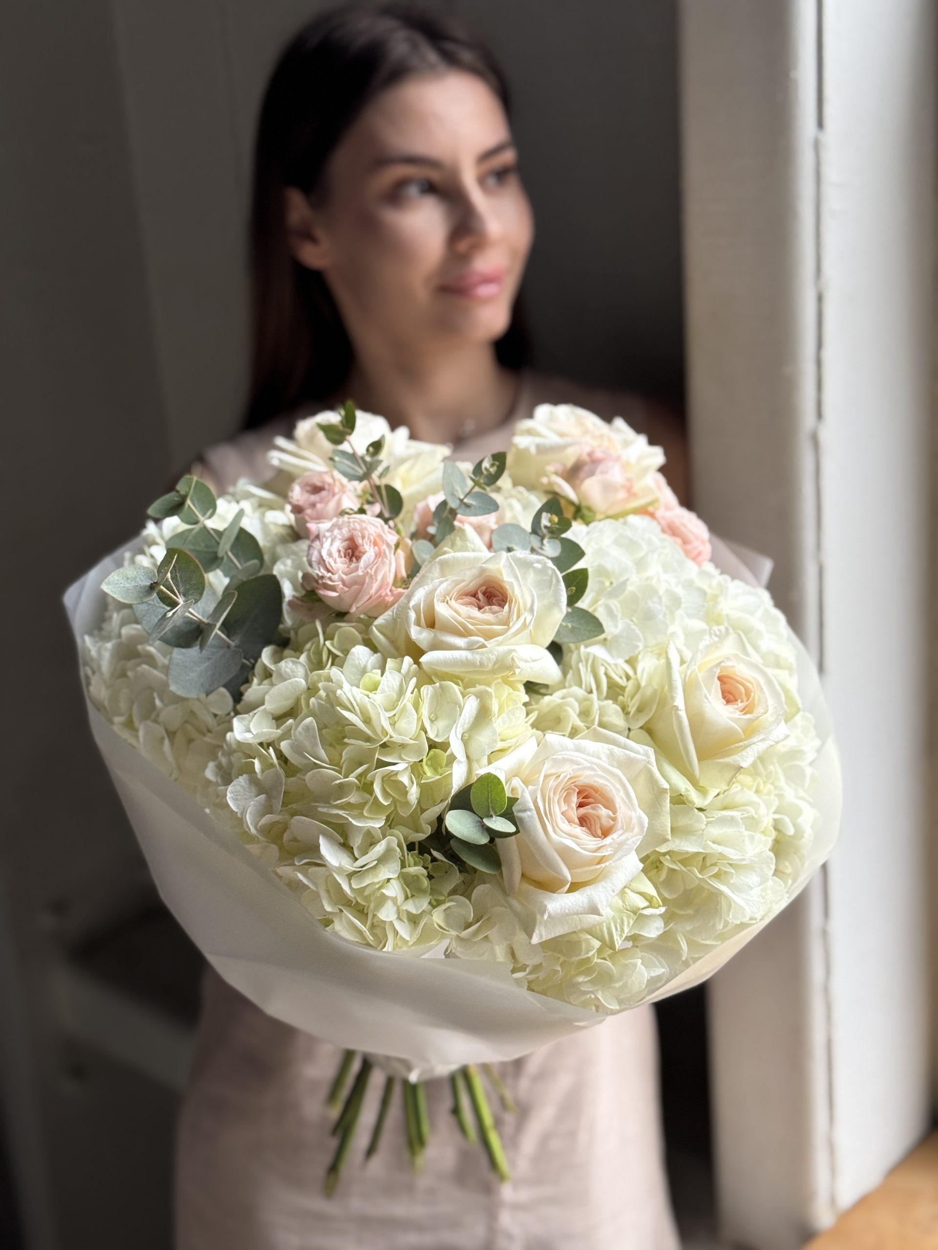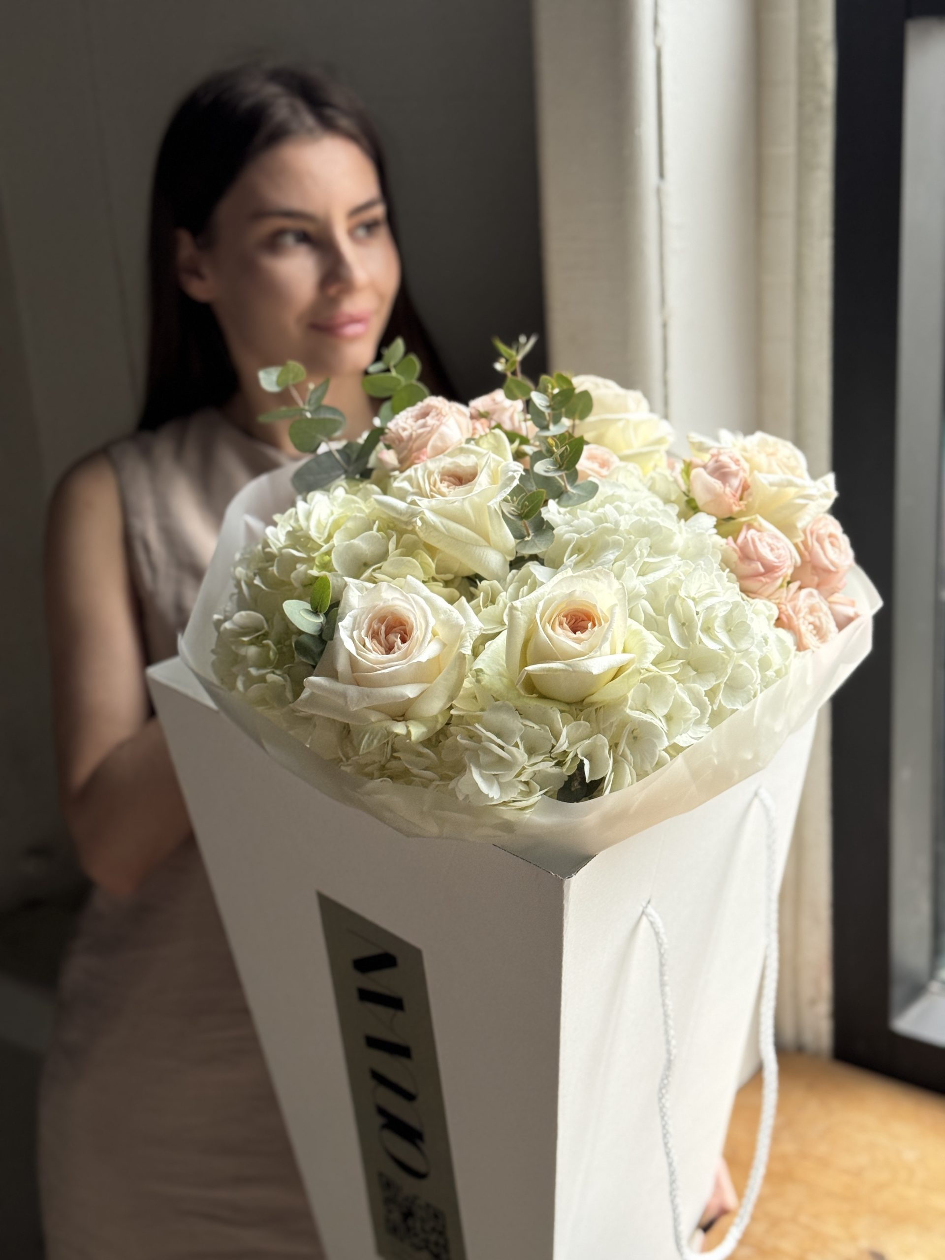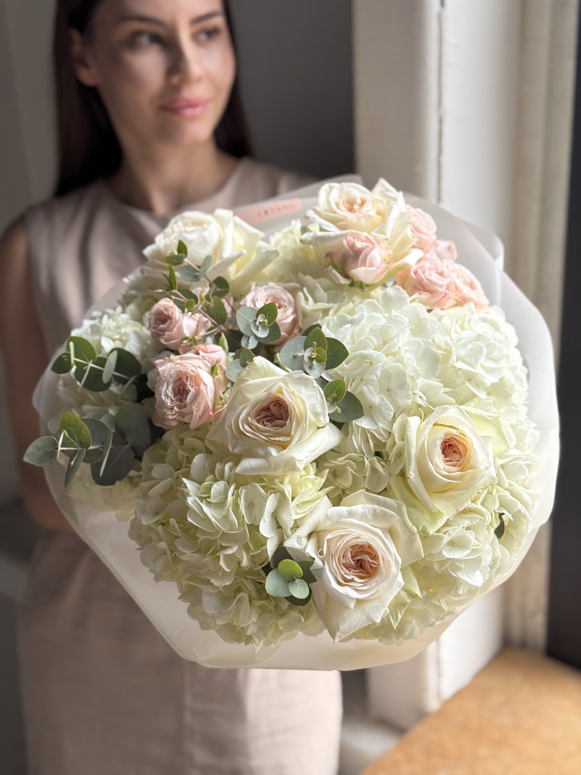 Описание: Сборный букет с гортензиями, ароматными розами Вайт Охара, кустовыми Бомбастик и веточками эвкалипта.