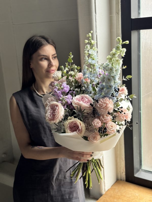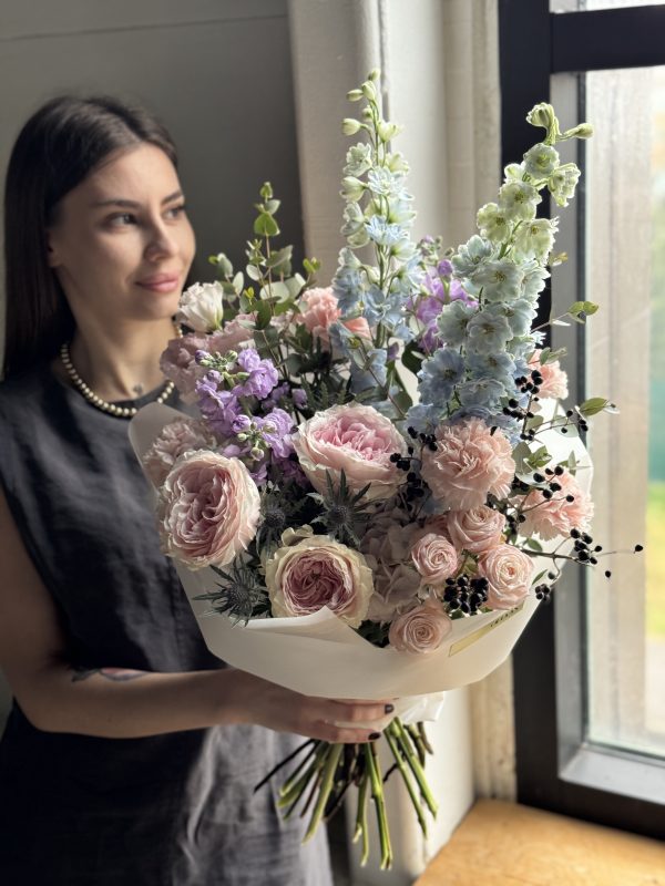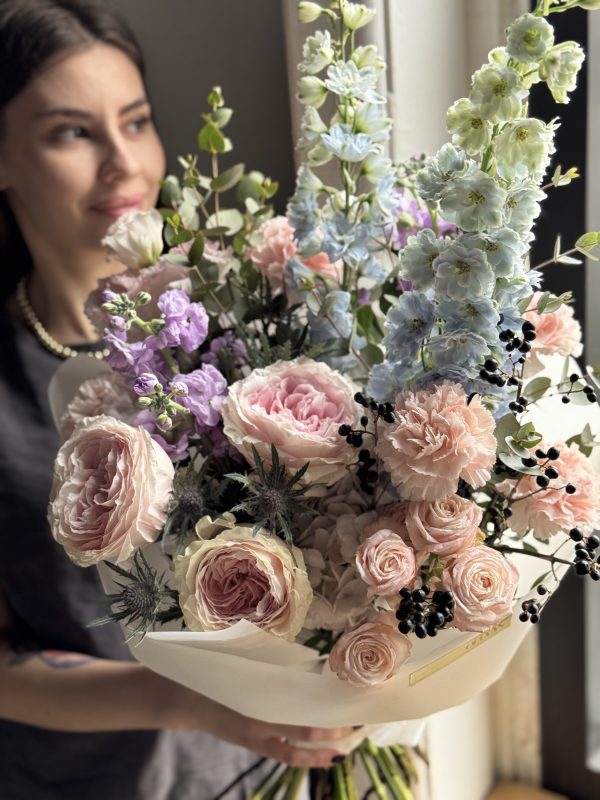 Описание: Сборный букет с гортензией, дельфиниумами, ароматной маттиолой, эрингиумом, эустомой, садовыми и кустовыми розами, диантусами, веточками черных ягод вибурнума и эвкалипта.