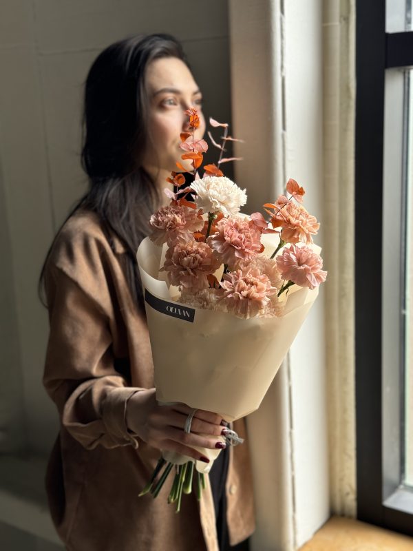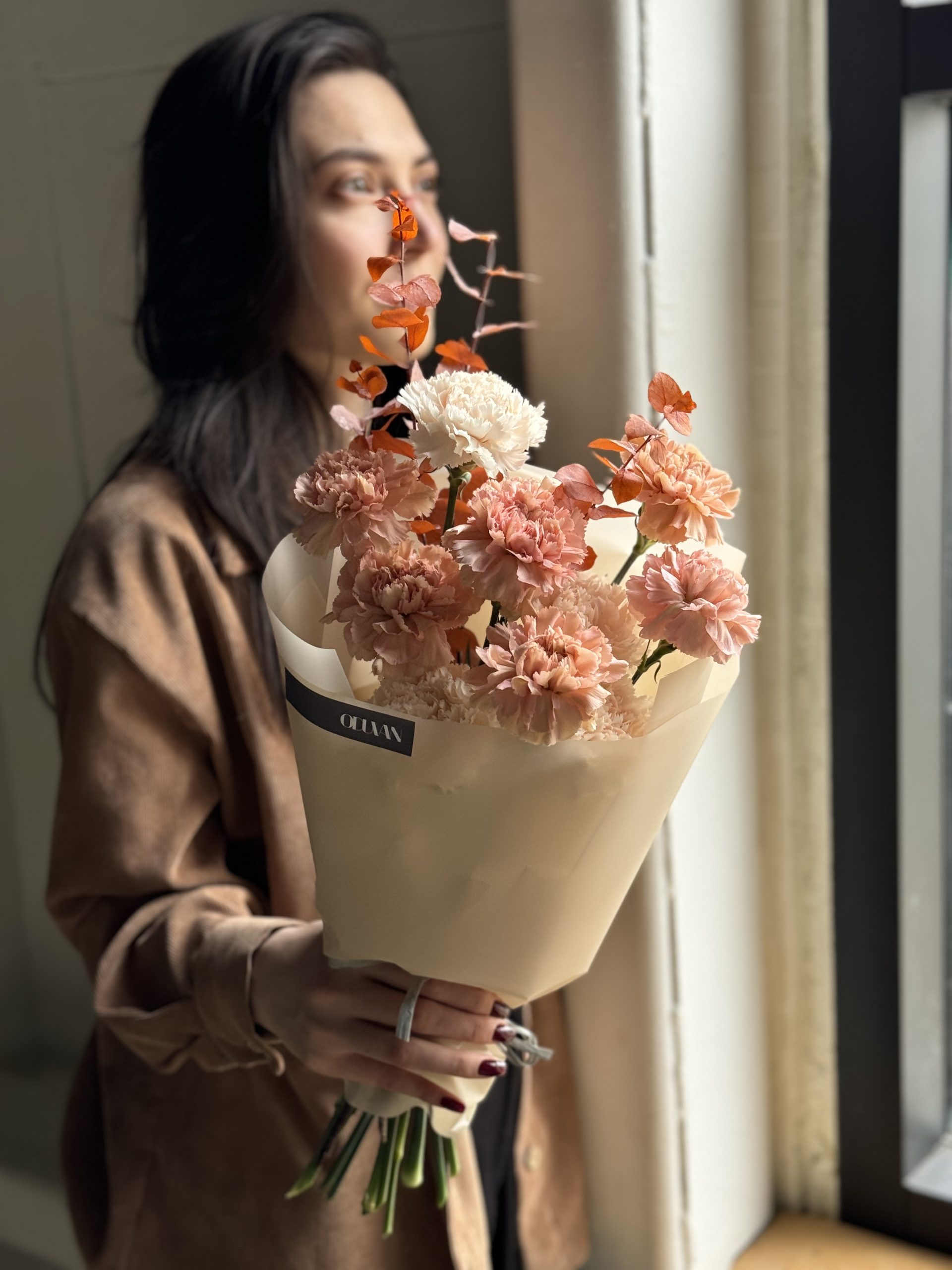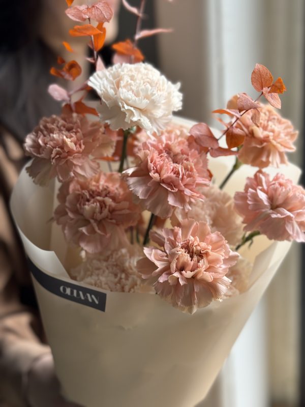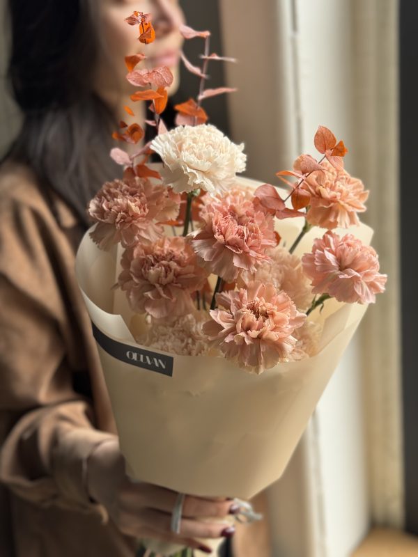 Описание: Монобукет из микса сортовых гвоздик с веточками стабилизированного эвкалипта.