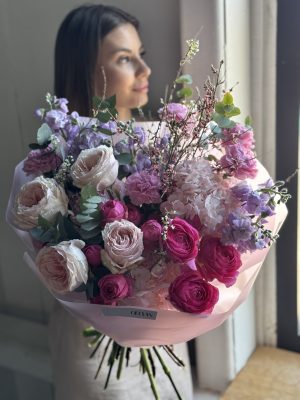 Описание: Сборный букет с дельфиниумами, гортензиями, садовыми розами, ранункулюсами, эустомами, веточками генисты и зеленым вибурнумом.