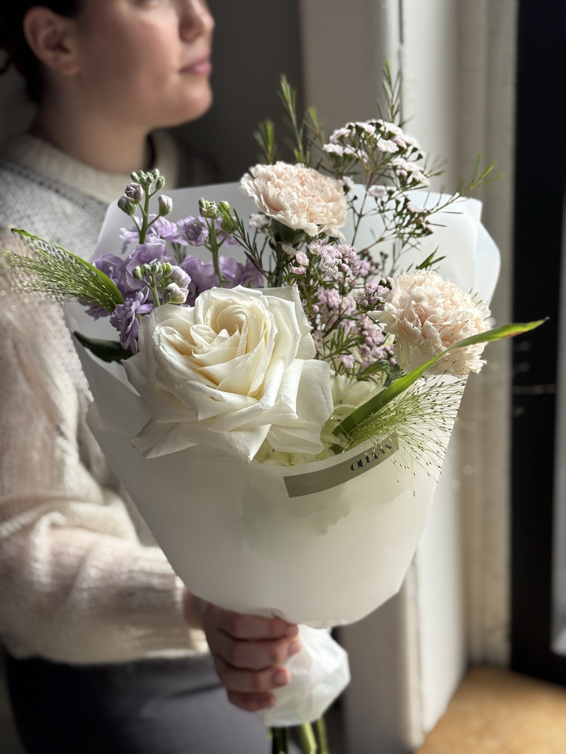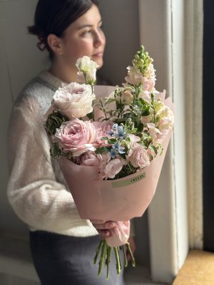 Описание: Сборный букет с гортензией, пионовидной розой Охара, диантусами, ароматным хамелациумом, кустовой маттиолой и зеленью паникума.