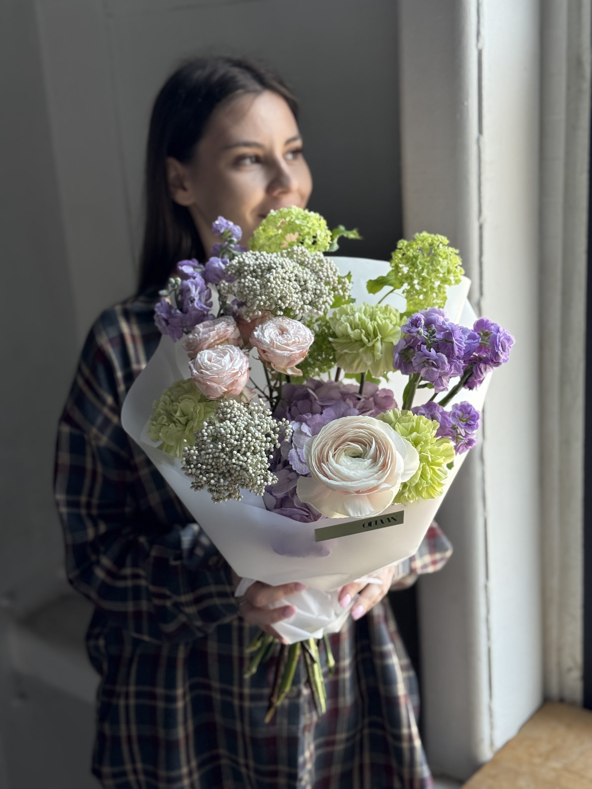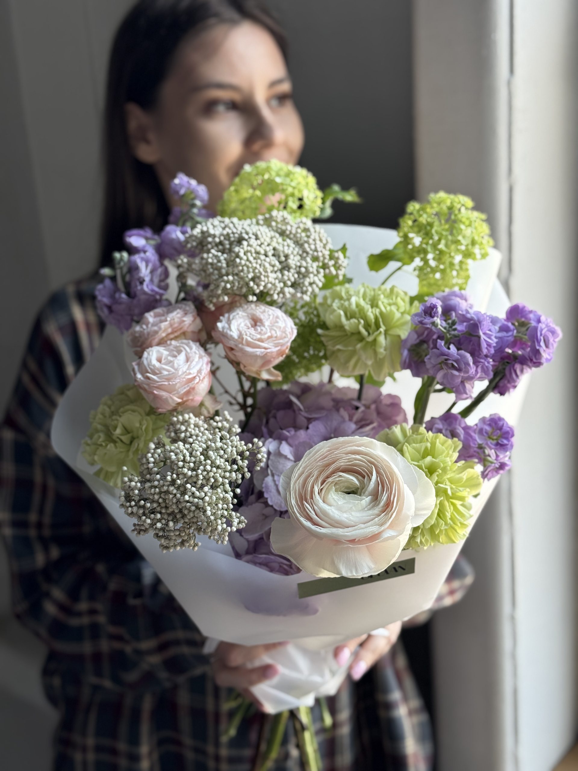 Описание: Сборный букет с гортензией, ароматной кустовой маттиолой, диантусами, ранункулюсом, кустовой пионовидной розой Бомбастик, озотамнусом и цветущей веткой вибурнума.