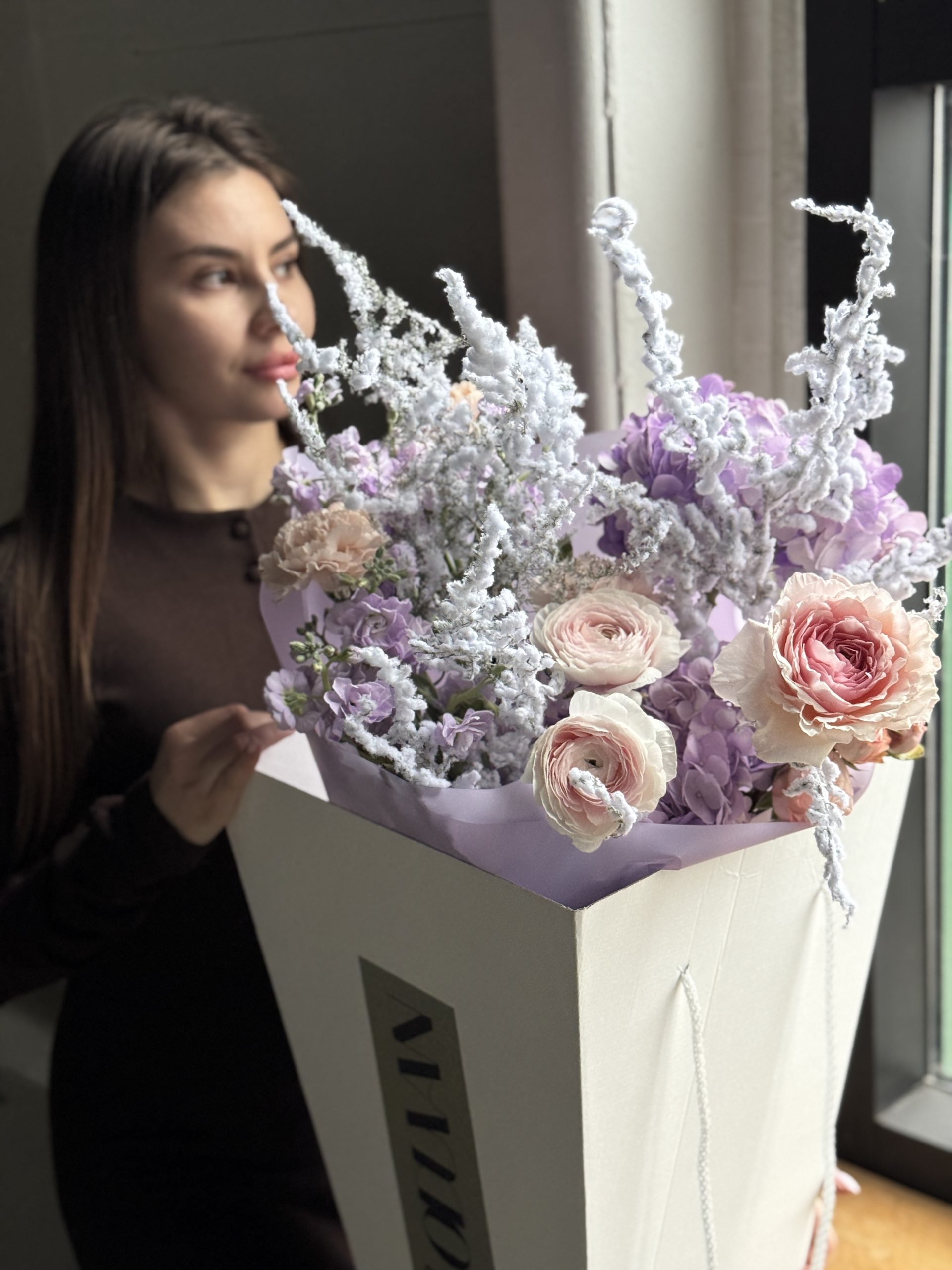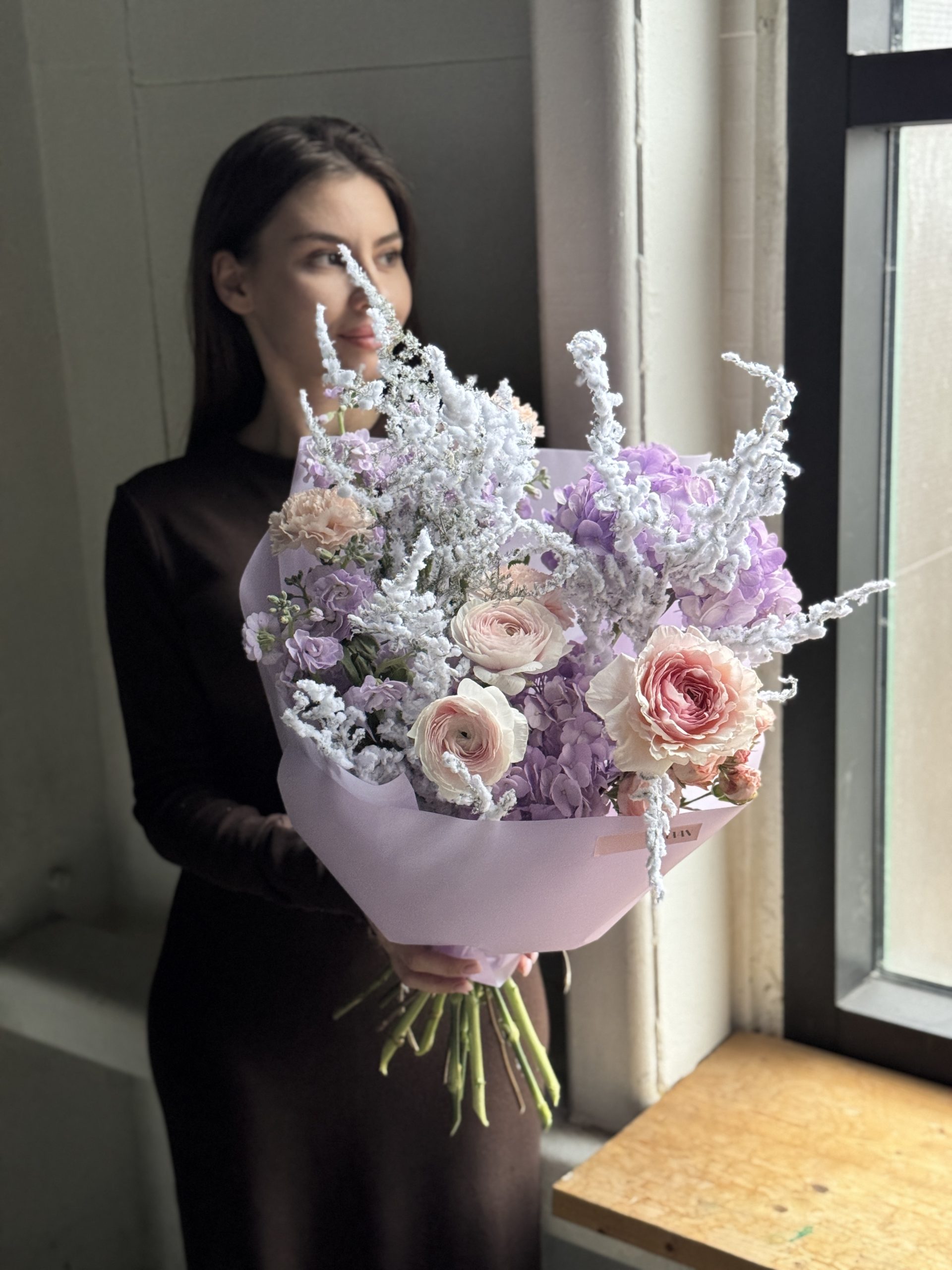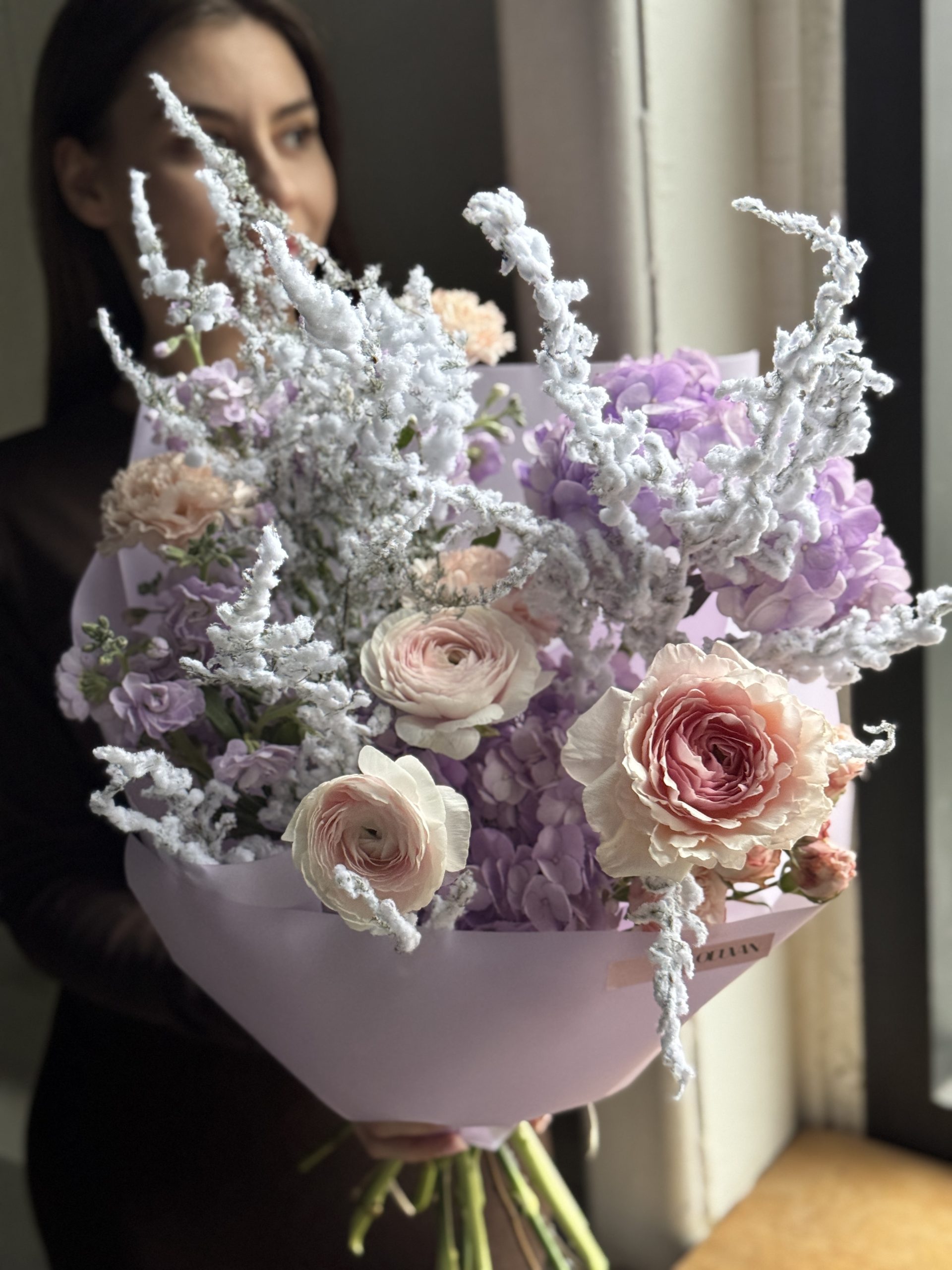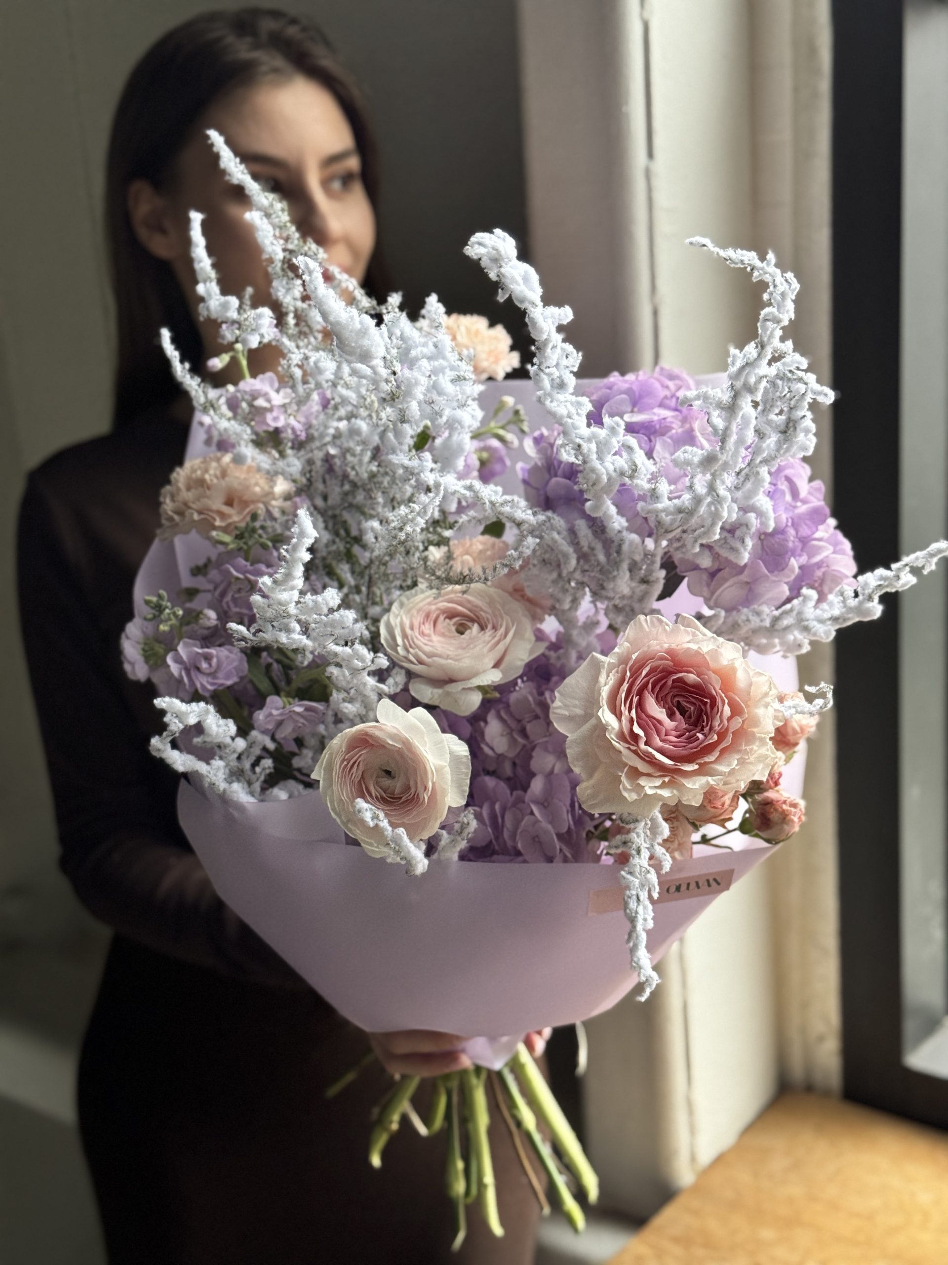 Описание: Сборный букет с гортензиями, ранункулюсами, пионовидными розами Тсумуги и Бомбастик, ароматной маттиолой, диантусами и заснеженным аспарагусом.