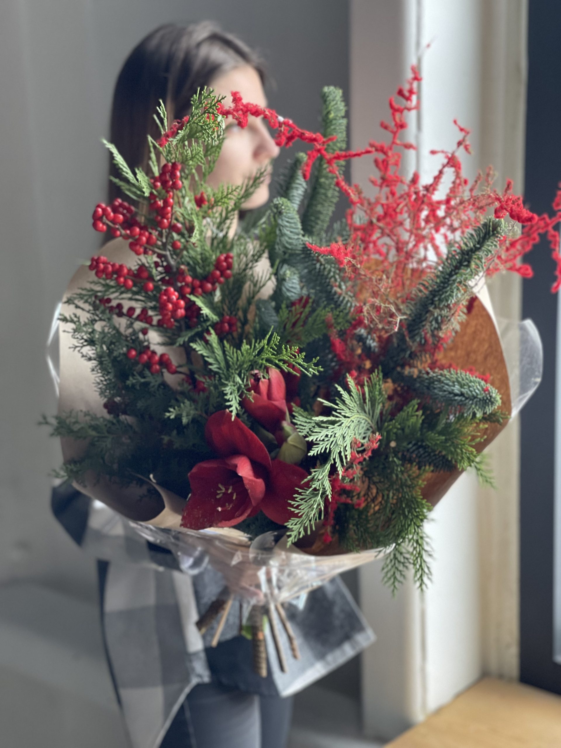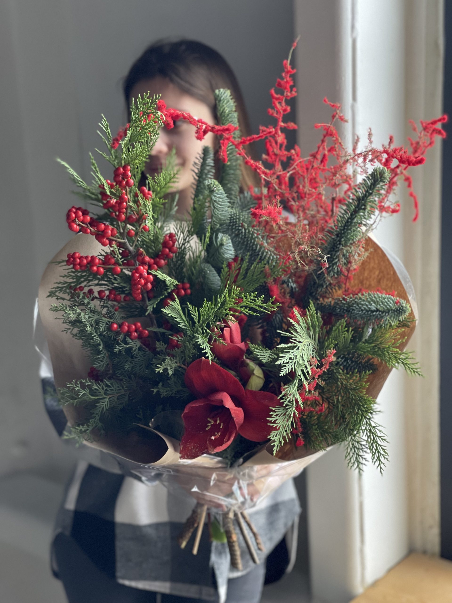 Описание: Букет с ветками нобилиса, туи, кипариса, амарилисом, веточками ягод Илекса и заснеженным аспарагусом.