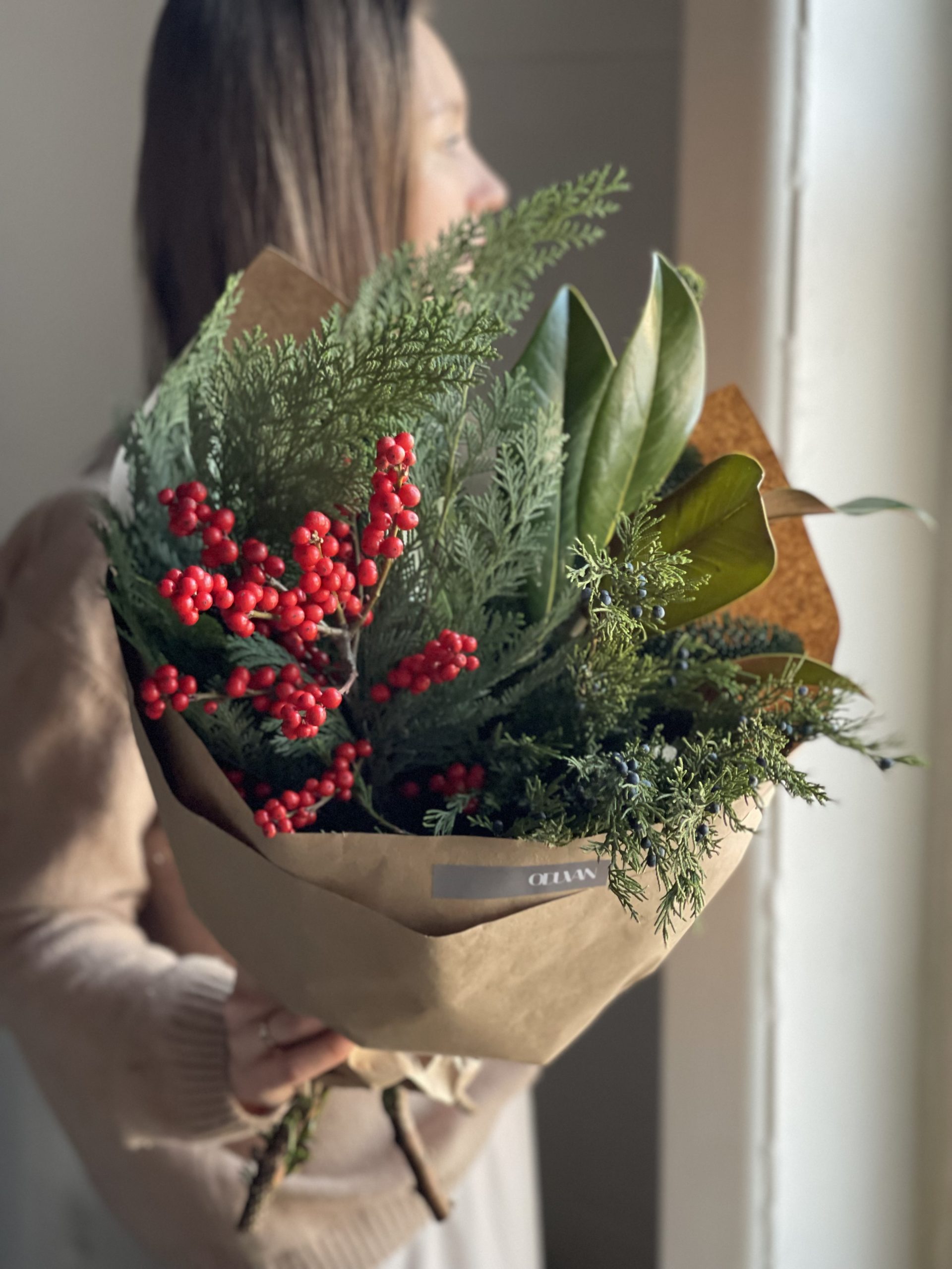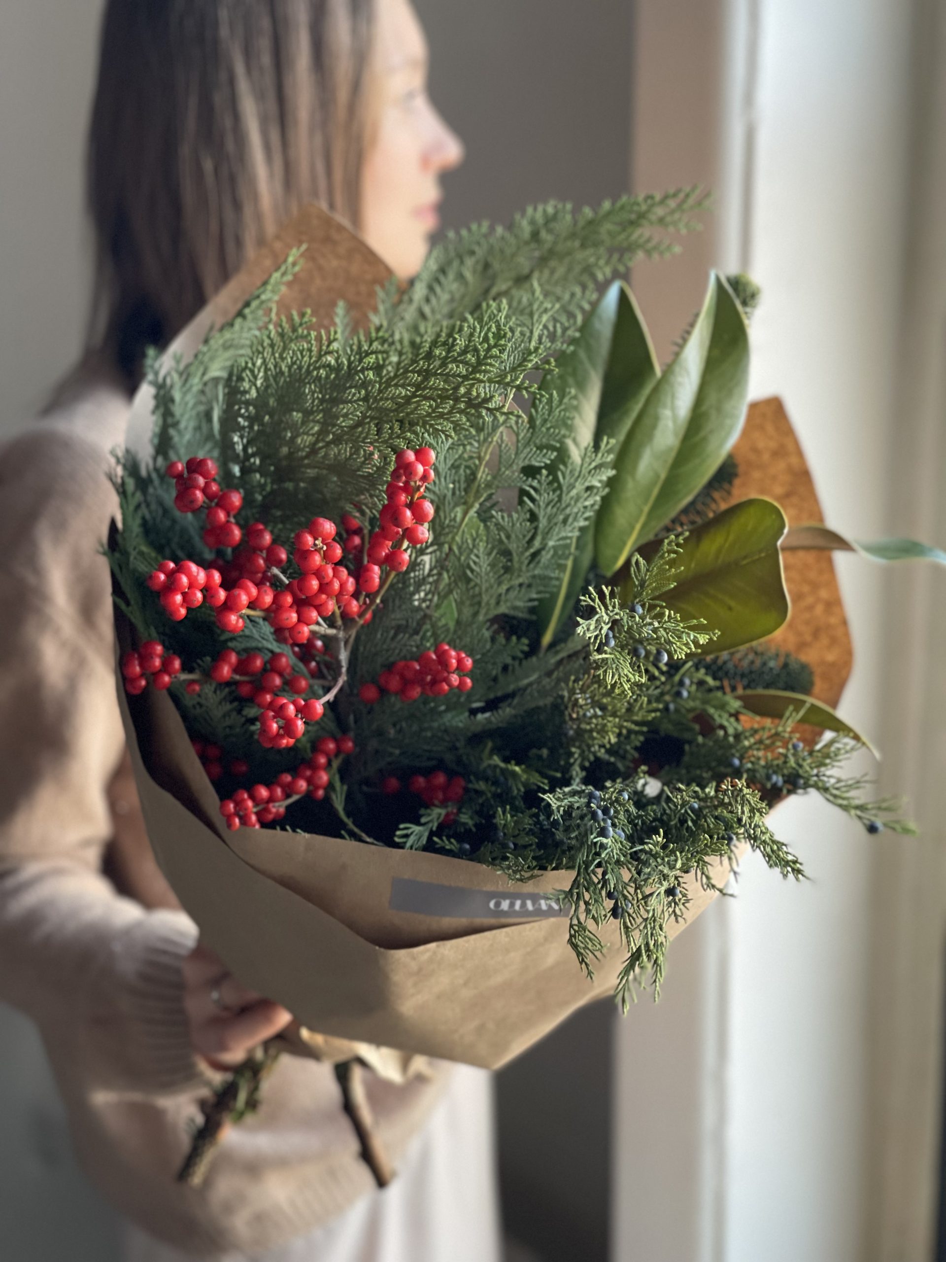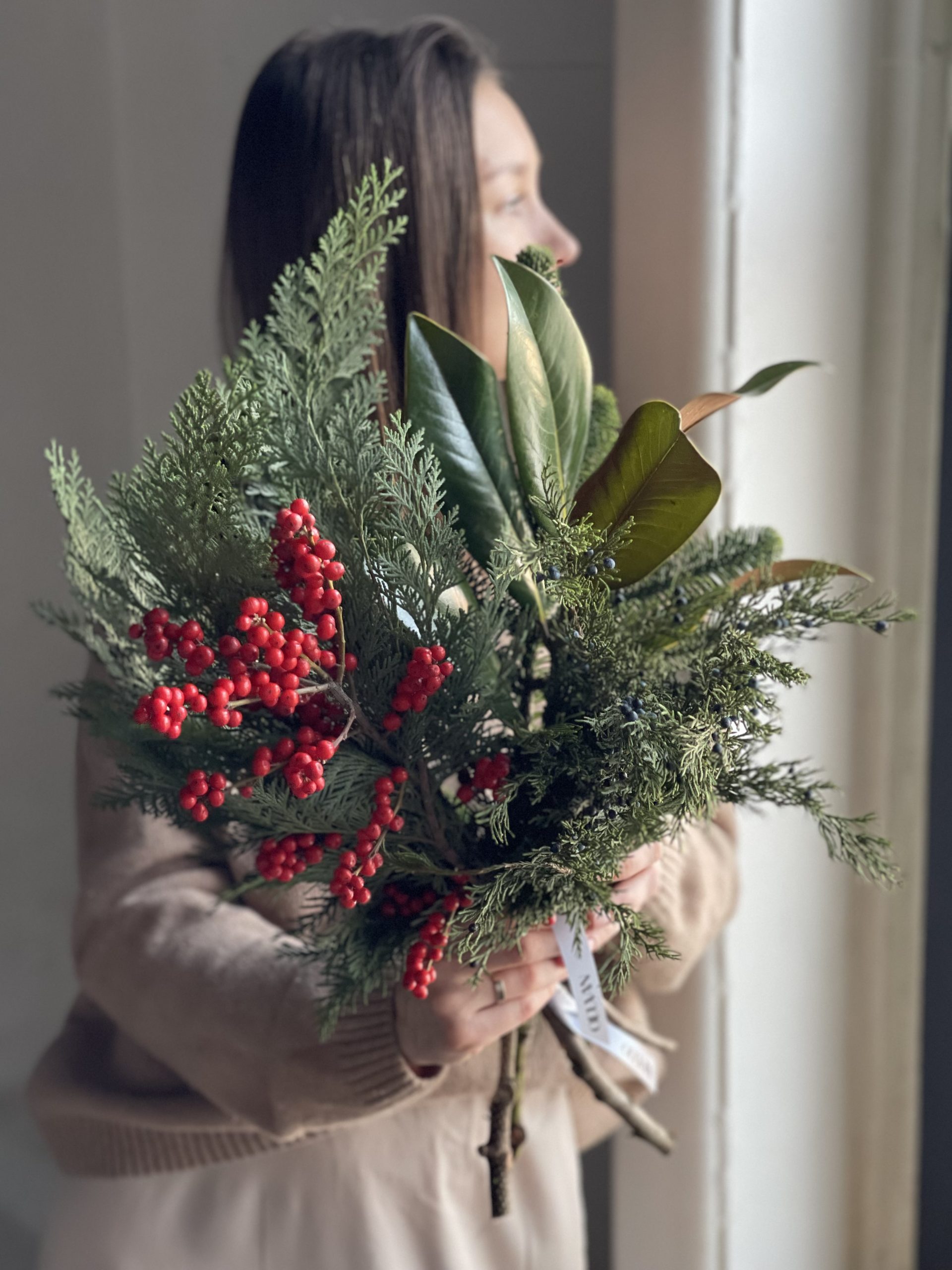 Описание: Букет с ветками хвои, кипарисом, листьями Магнолии, веточками ягод Илекса и туи.