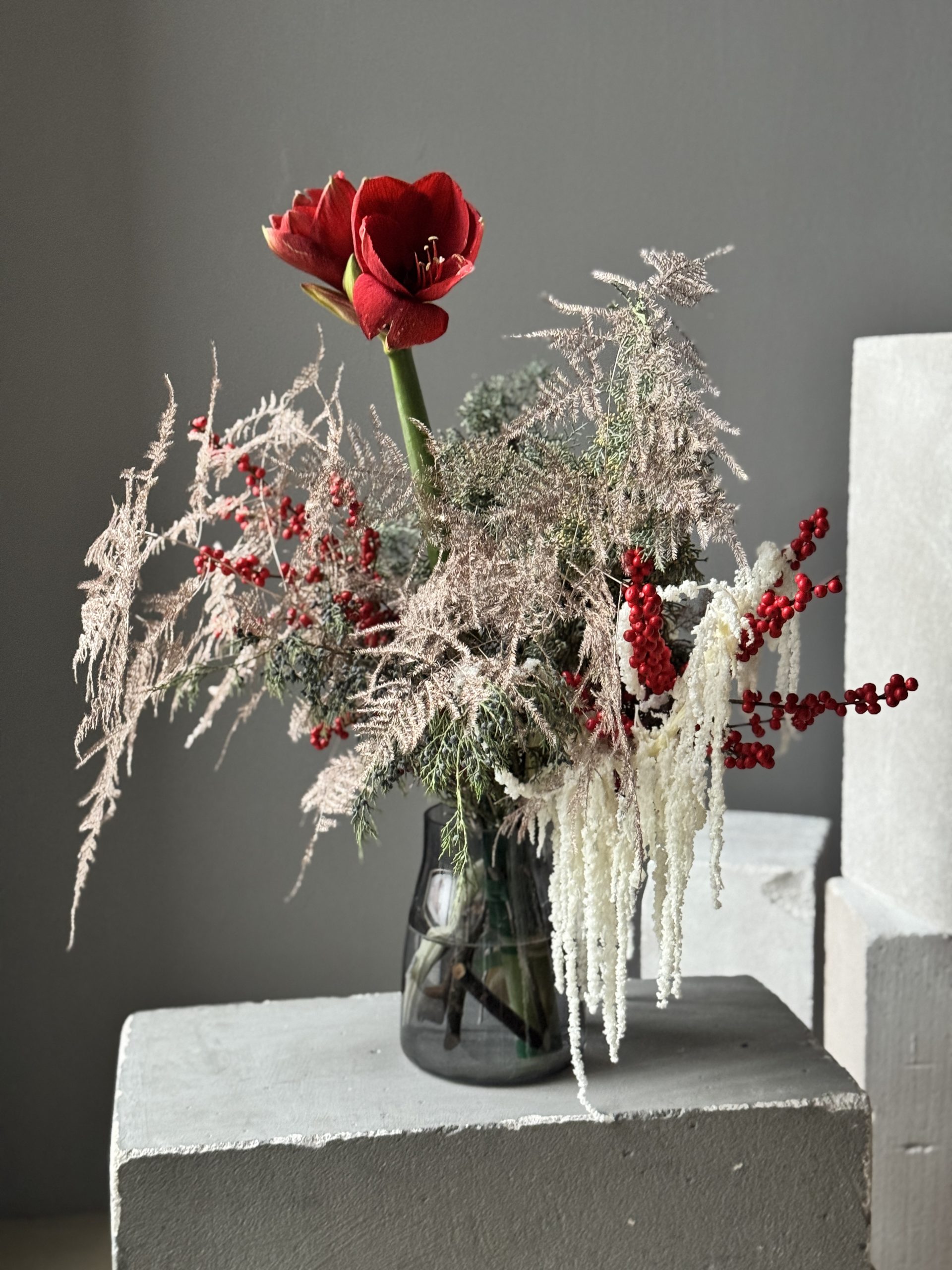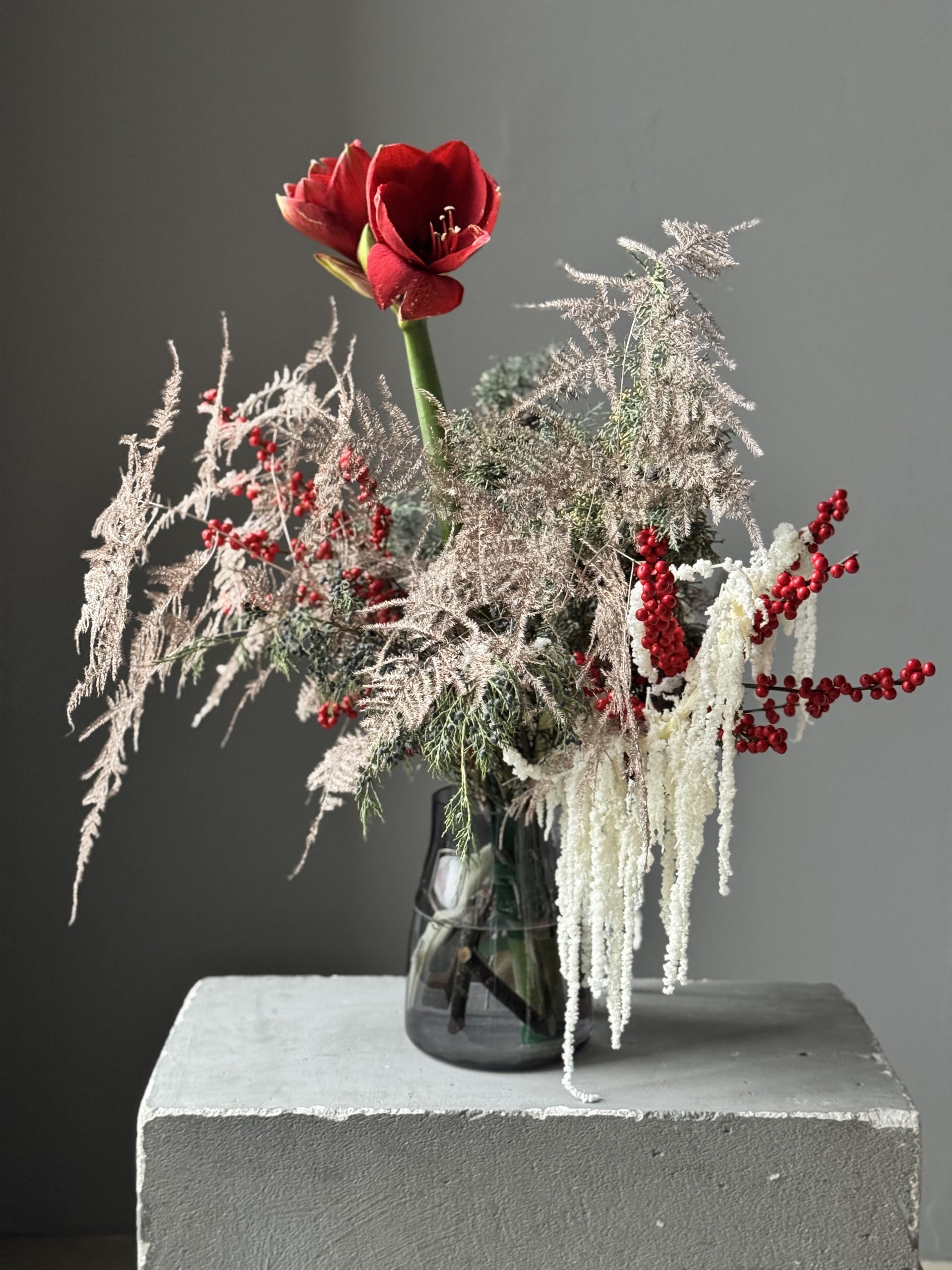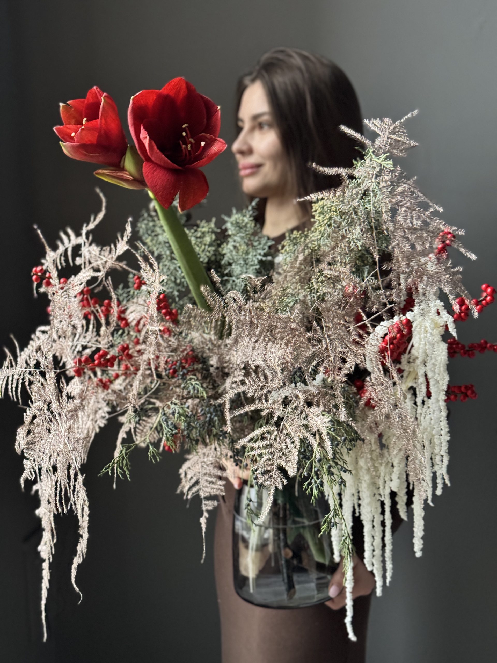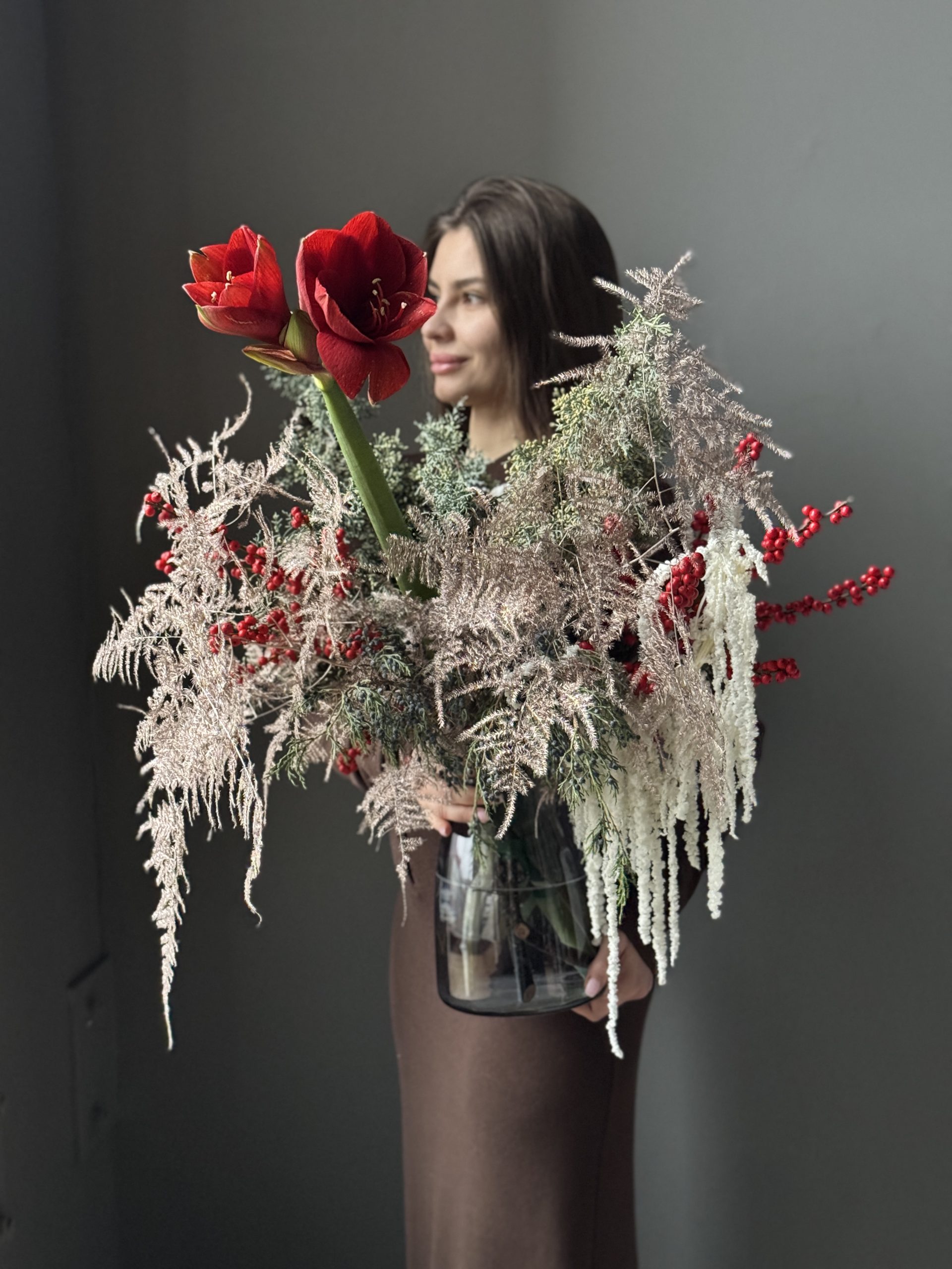 Описание: Сборный букет с амариллисом, илексом, свисающим амарантом, веточками туи, можевельника, аспарагусом и веточками березы