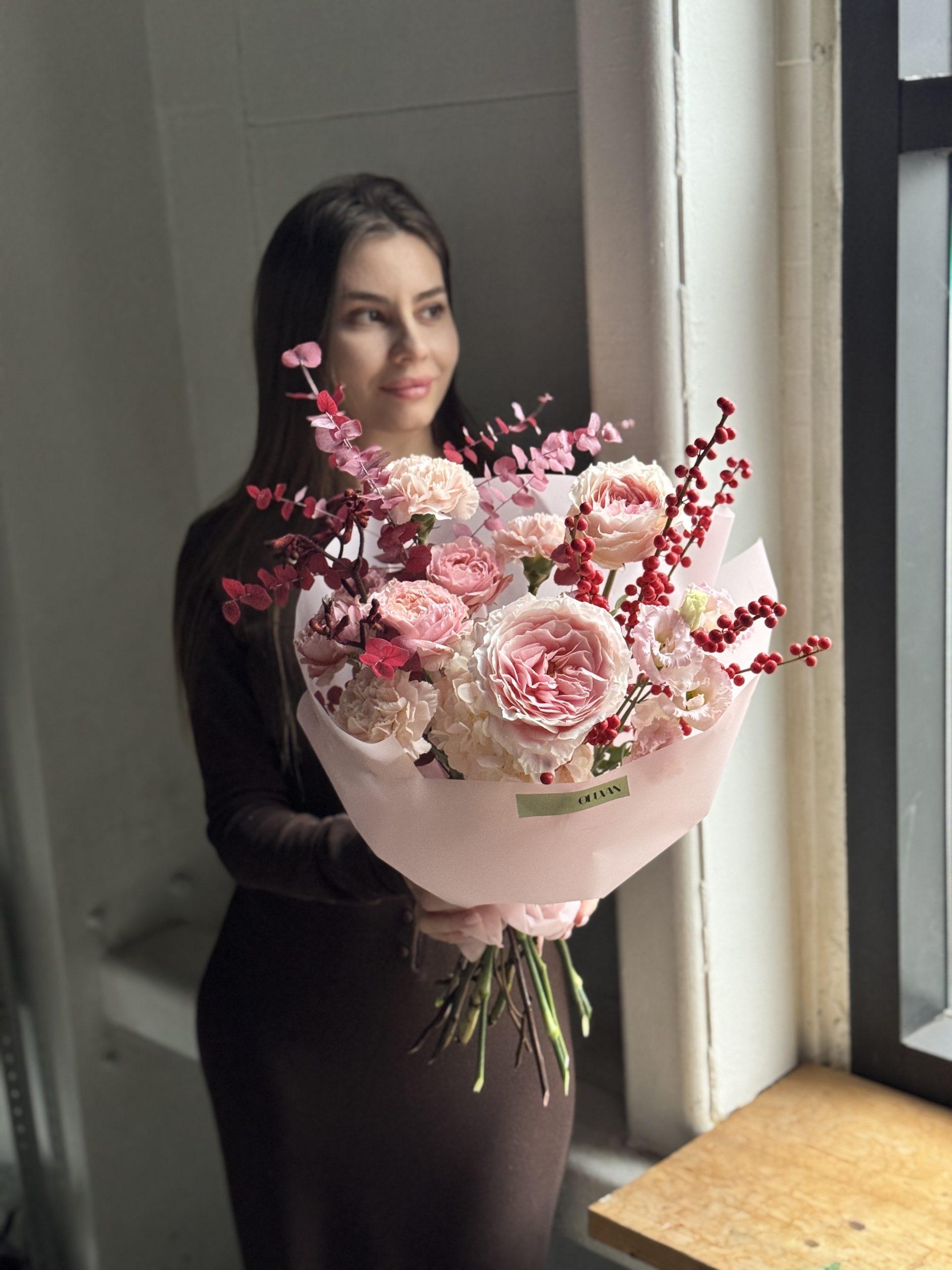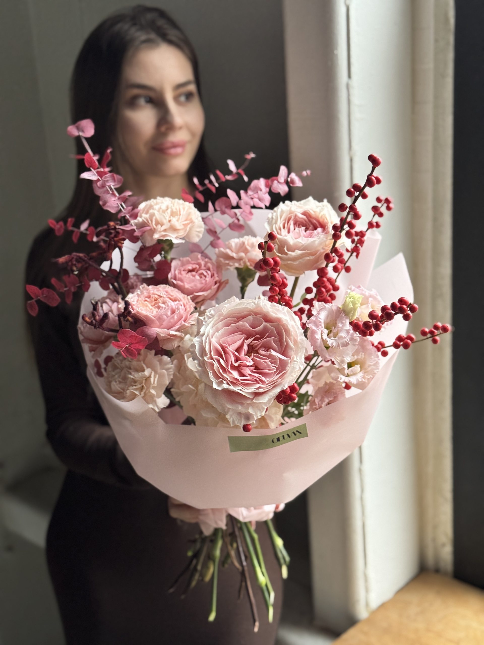 Описание: Сборный букет с гортензией, пионовидными розами Тсумуги и Джульетта, веточками илекса, диантусами, эустомой и листьями стабилизированного эвкалипта.