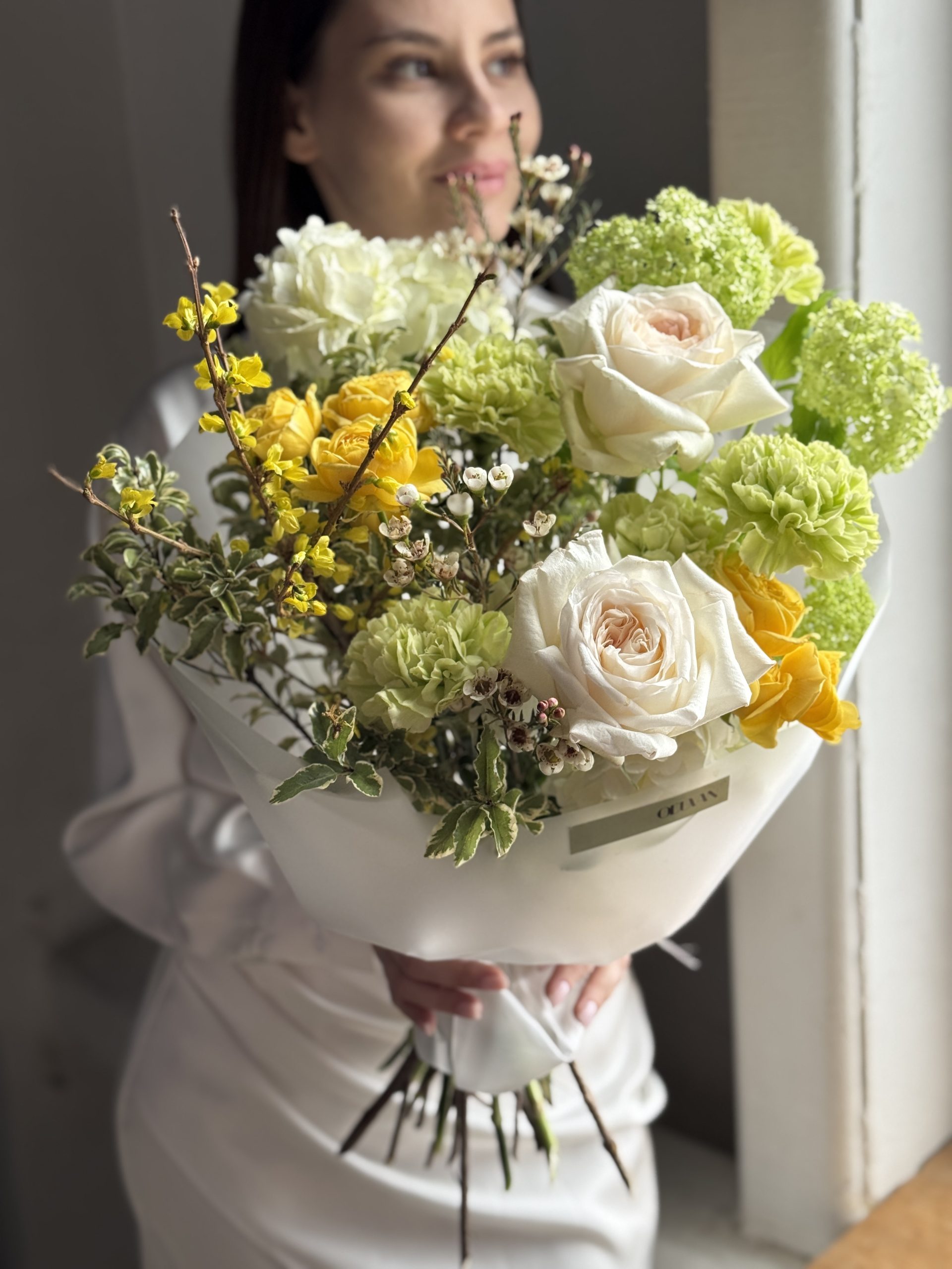 Описание: Сборный букет с гортензиями, ранункулюсами, ароматными розами, зеленым вибурнумом, цветущей форзицией, кустовыми розами Луна, диантусами и цветущими веточками хамелациума.