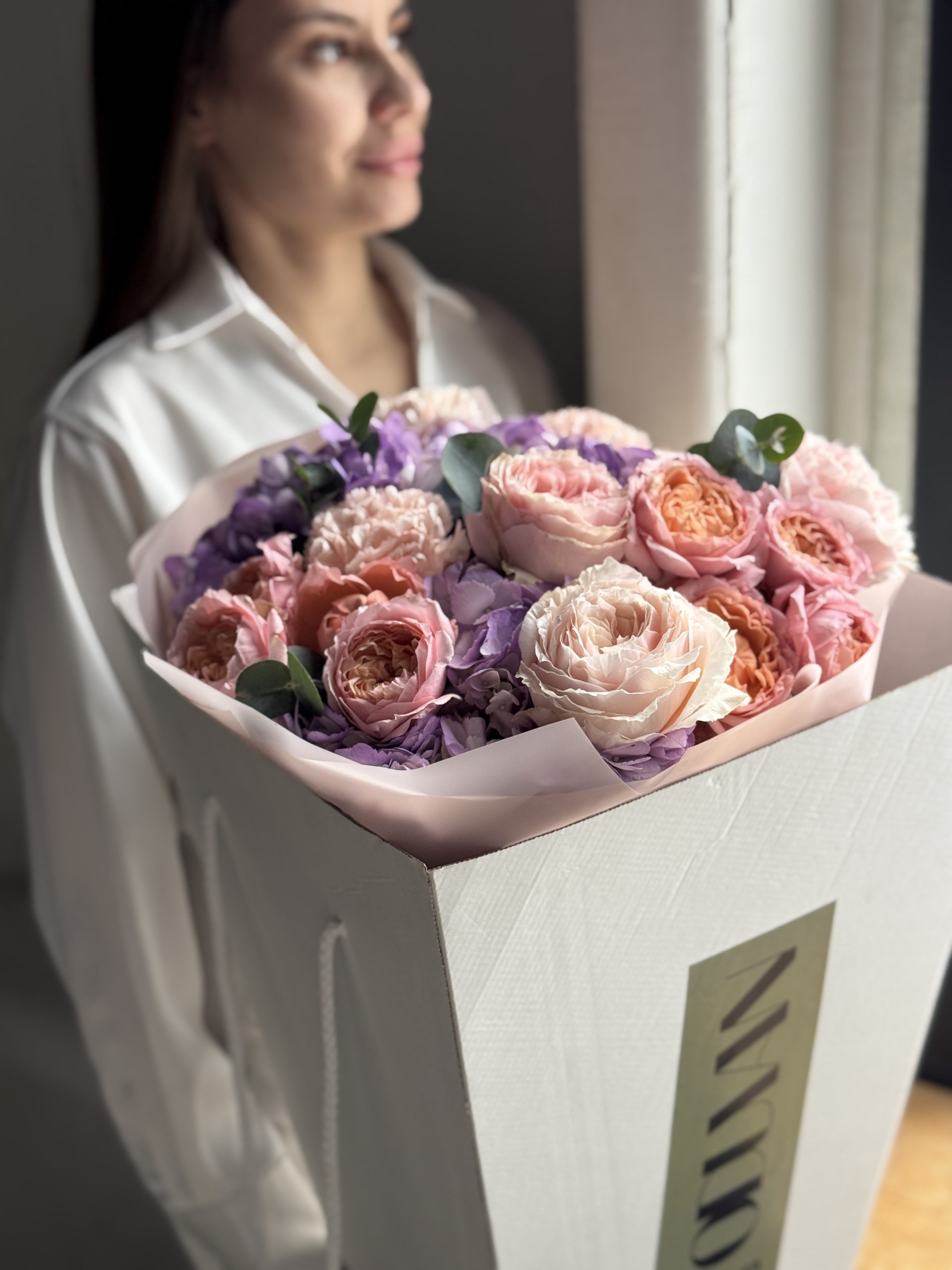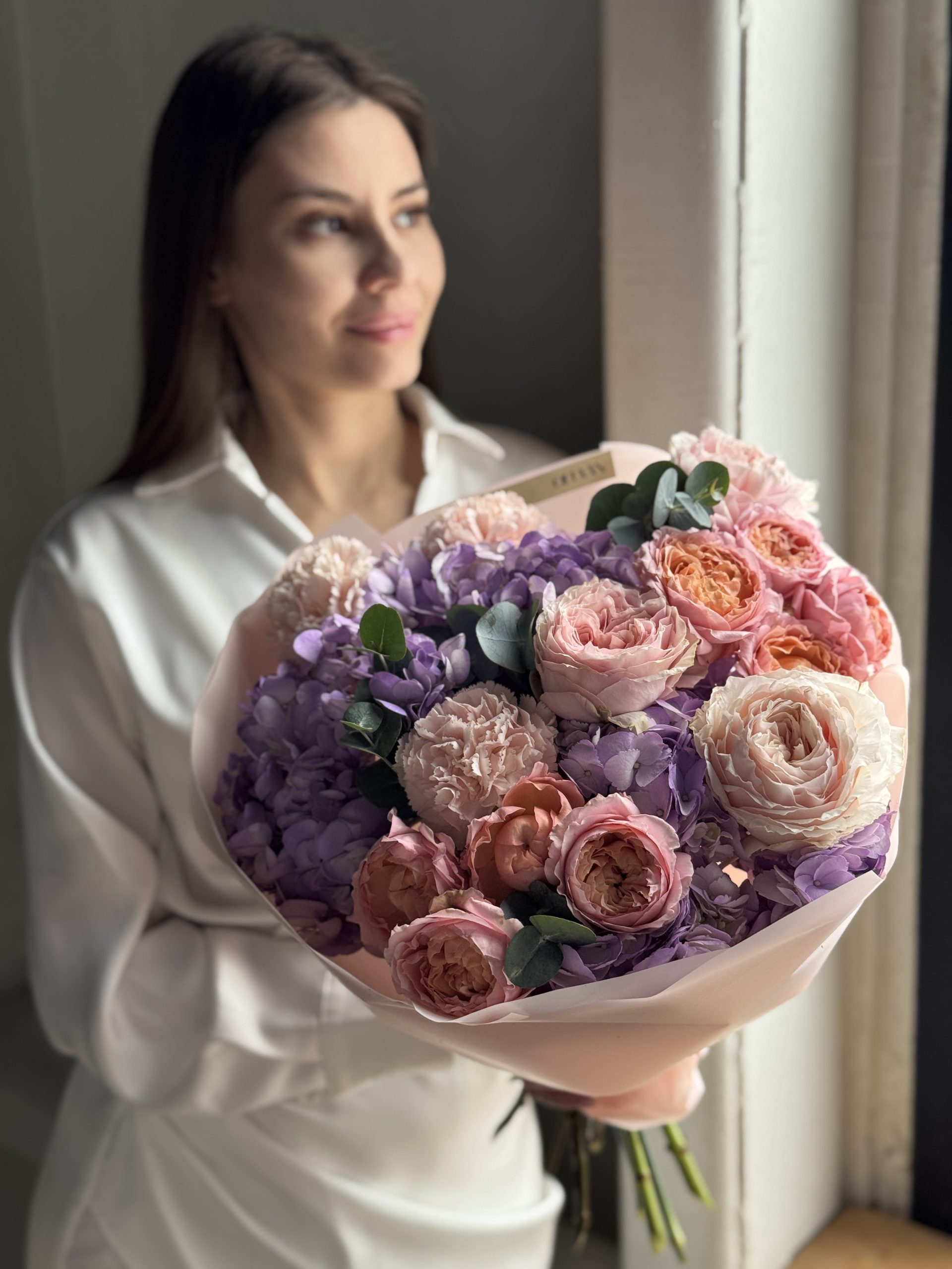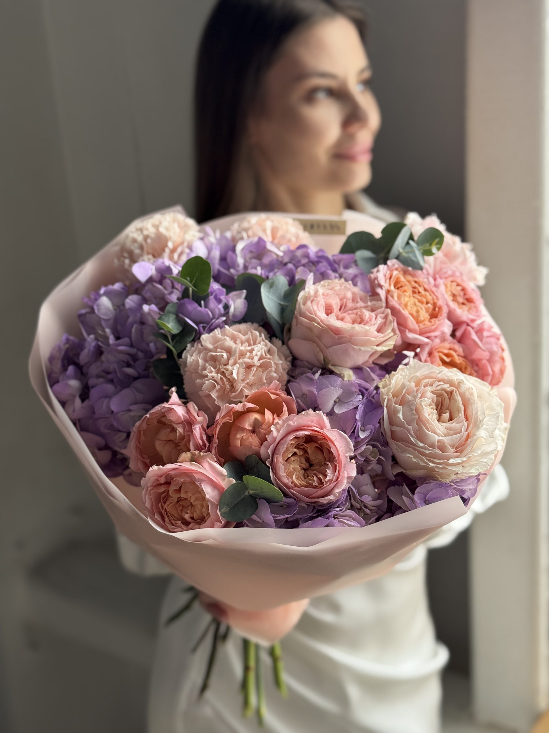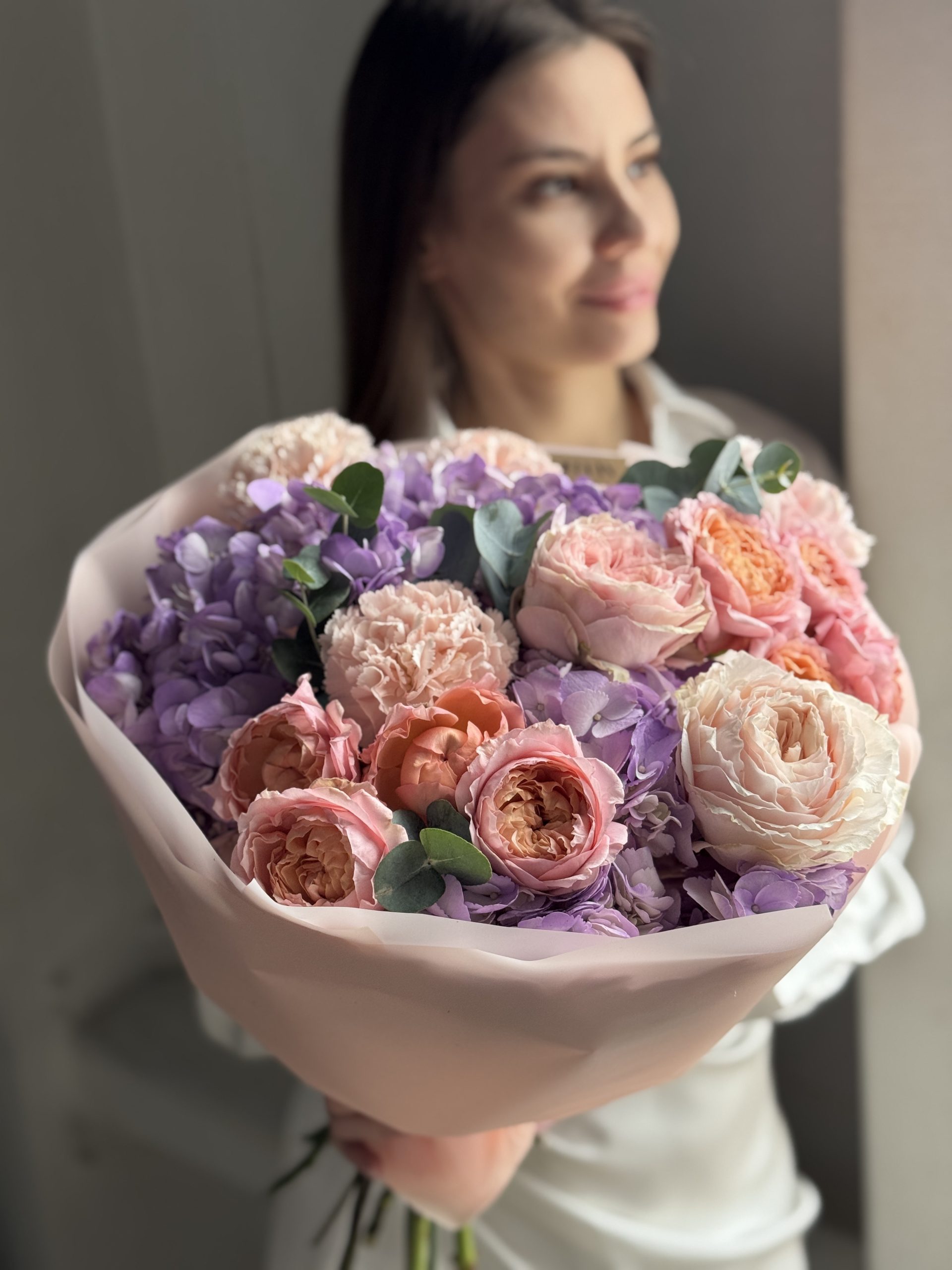 Описание: Сборный букет с гортензиями, кустовыми пионовидными розами Джульетта, диантусами и веточками эвкалипта.