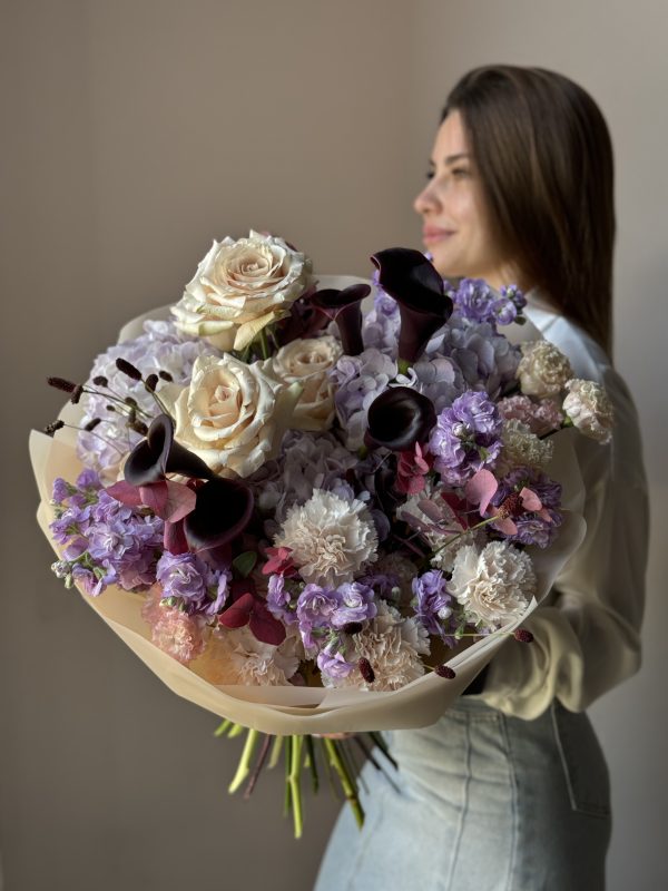 Описание: Сборный букет с каллами, гортензиями, кустовыми маттиолами, эустомами, диантусами, розами Квиксенд, сангисорбой и стабилизированным эвкалиптом.