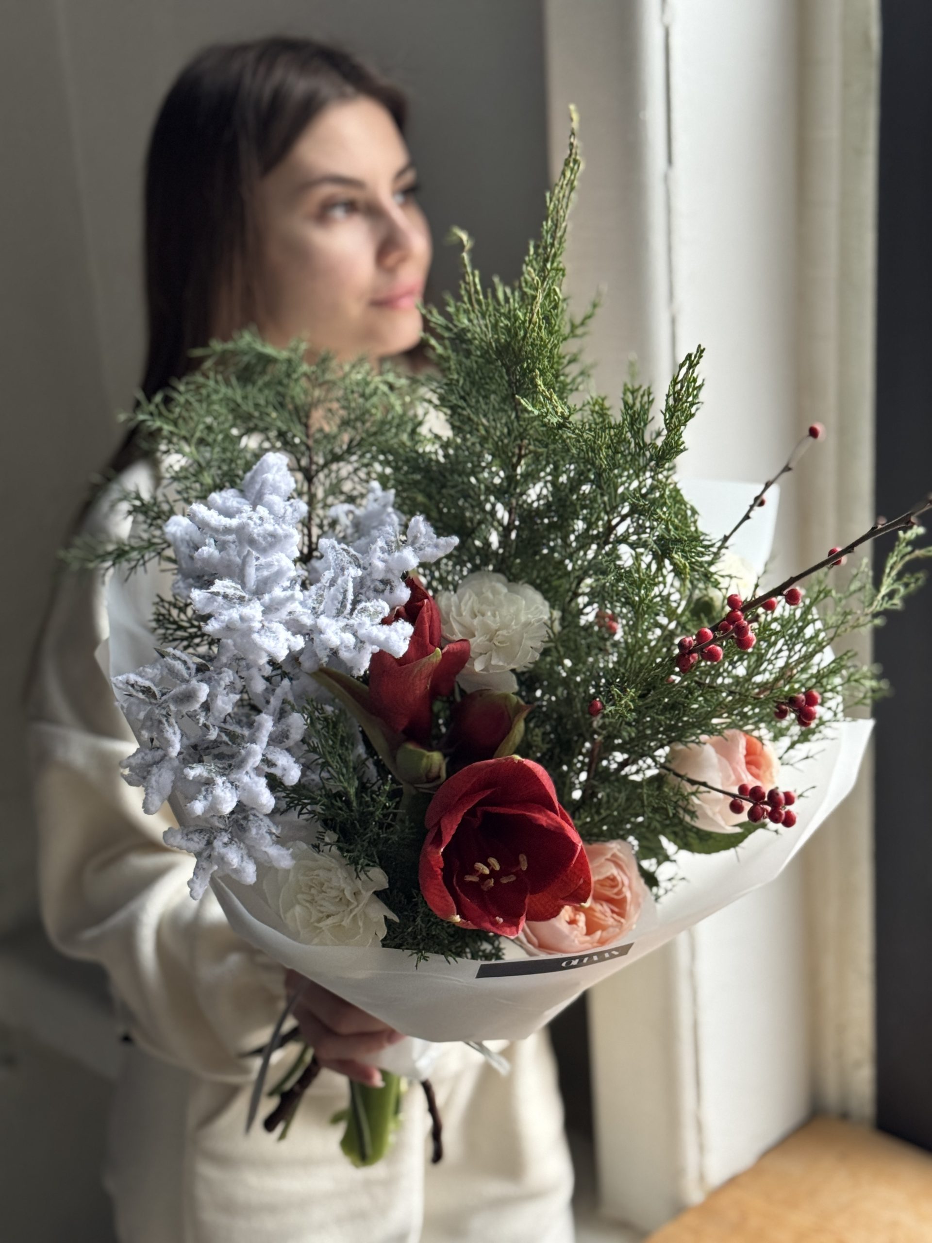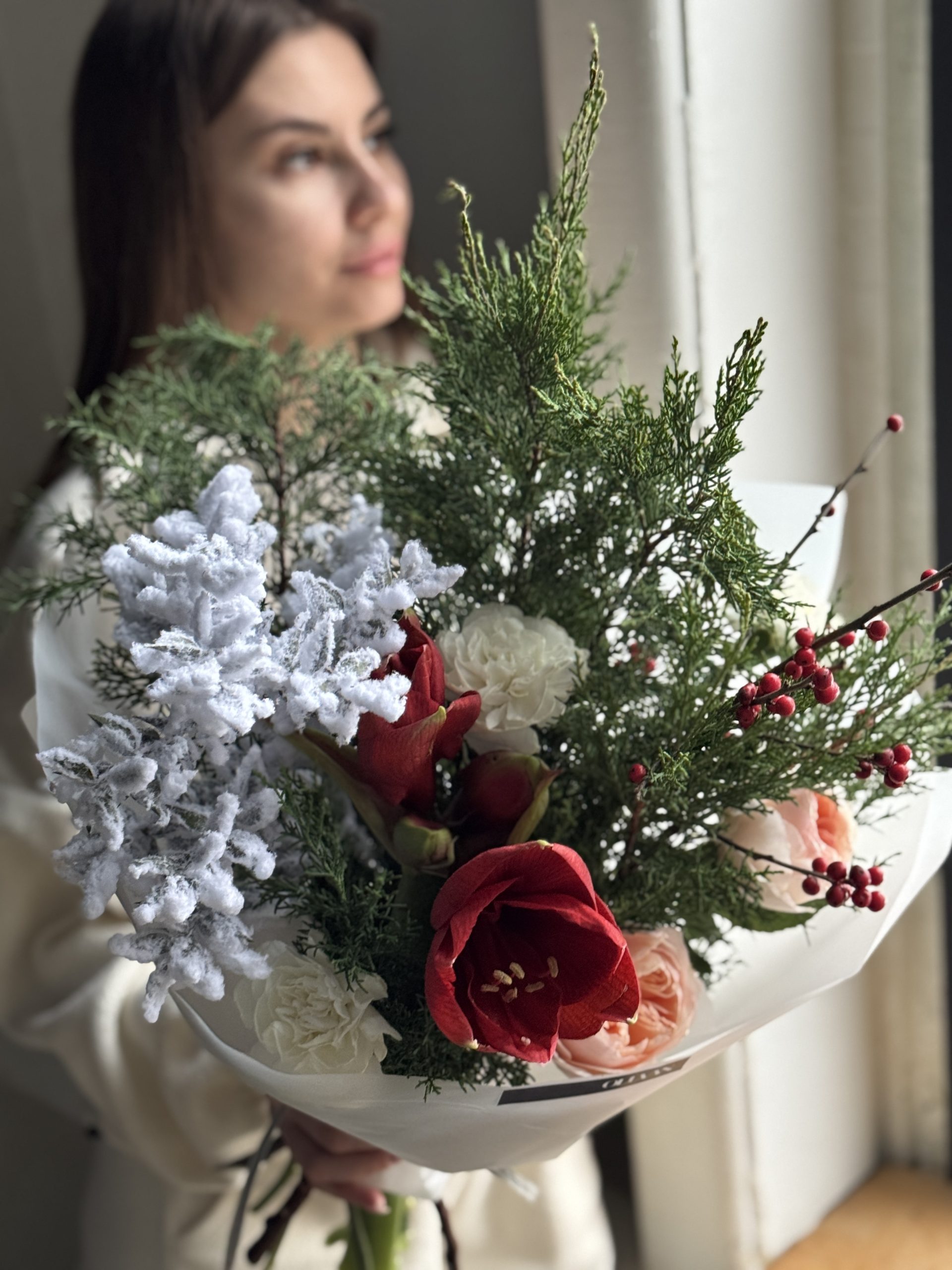 Описание: Сборный букет с амариллисом, дмантусами, садовыми розами, ягодами Илекса, хвоей и заснеженными ветками.