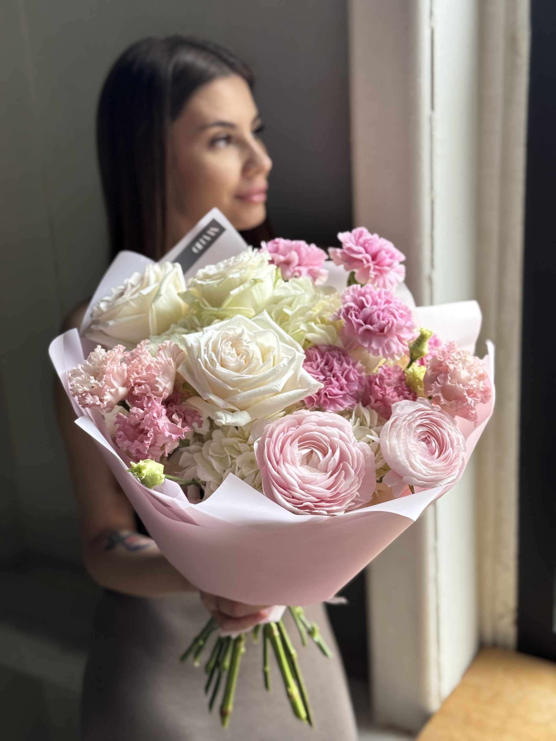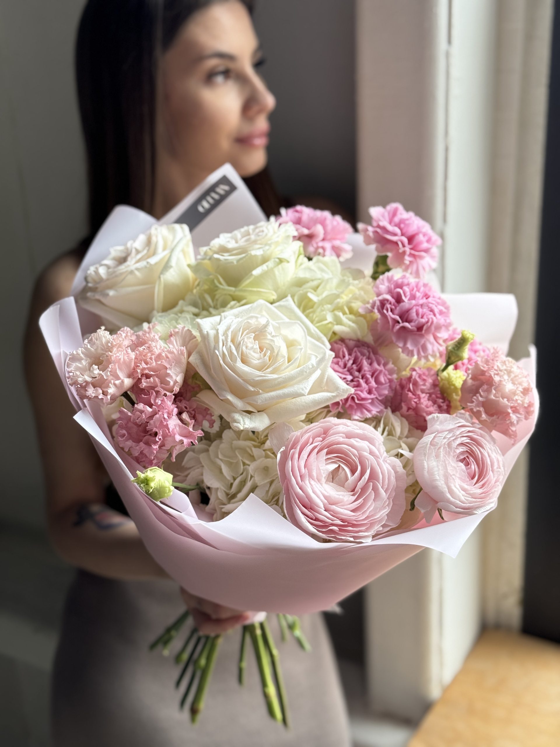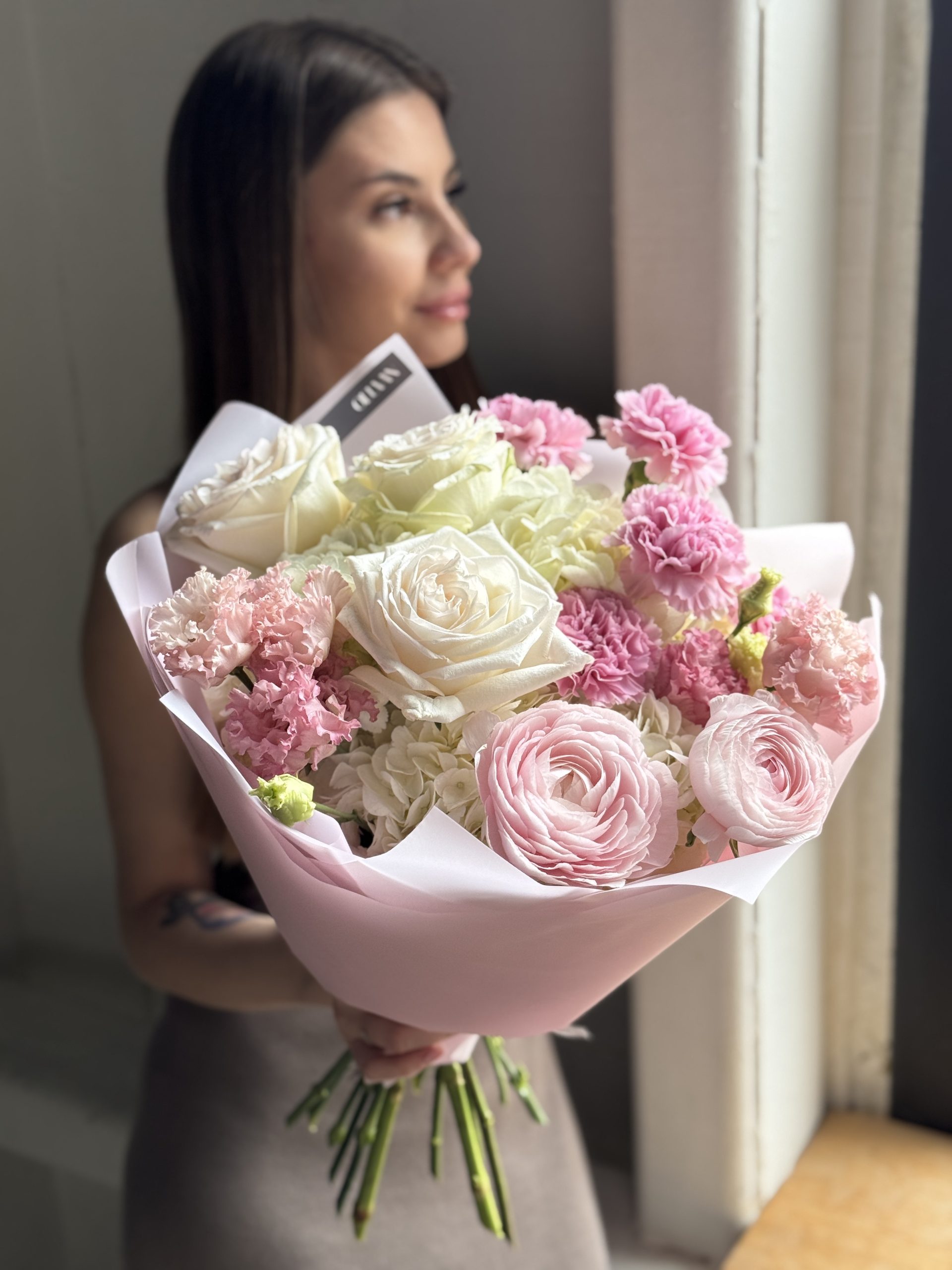 Описание: Сборный букет с гортензией, ранункулюсами, эустомой, садовыми розами и диантусами.