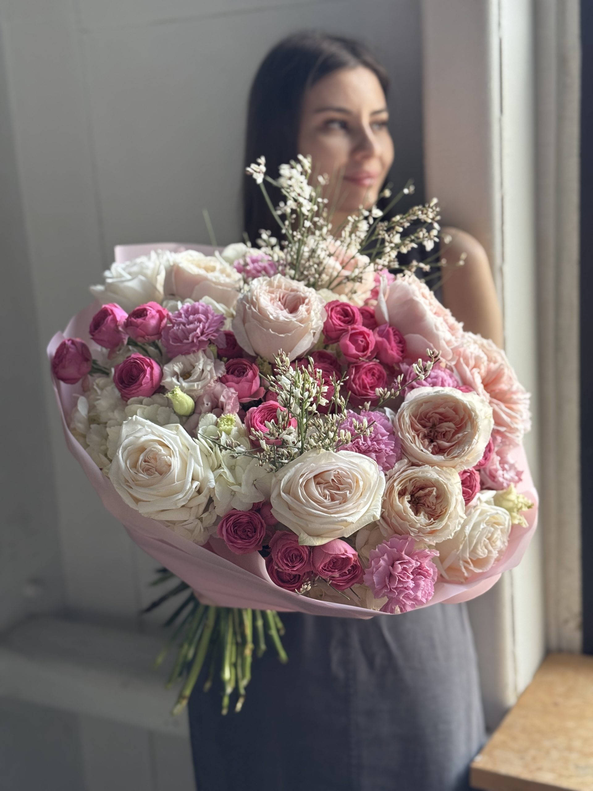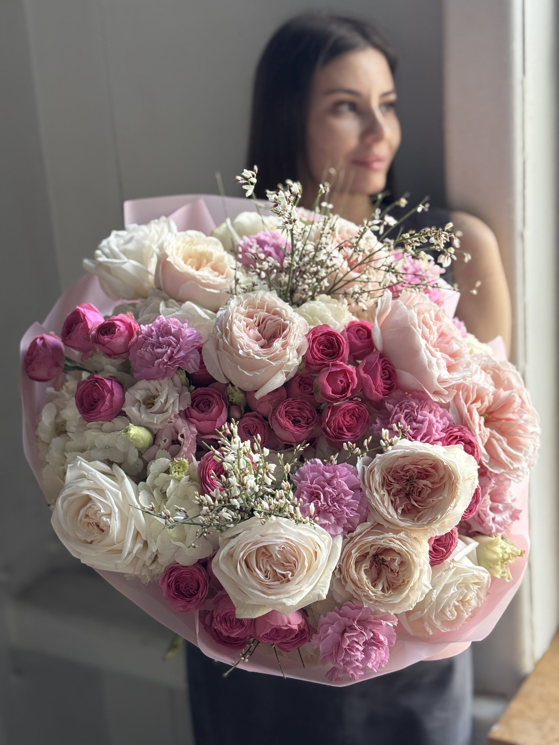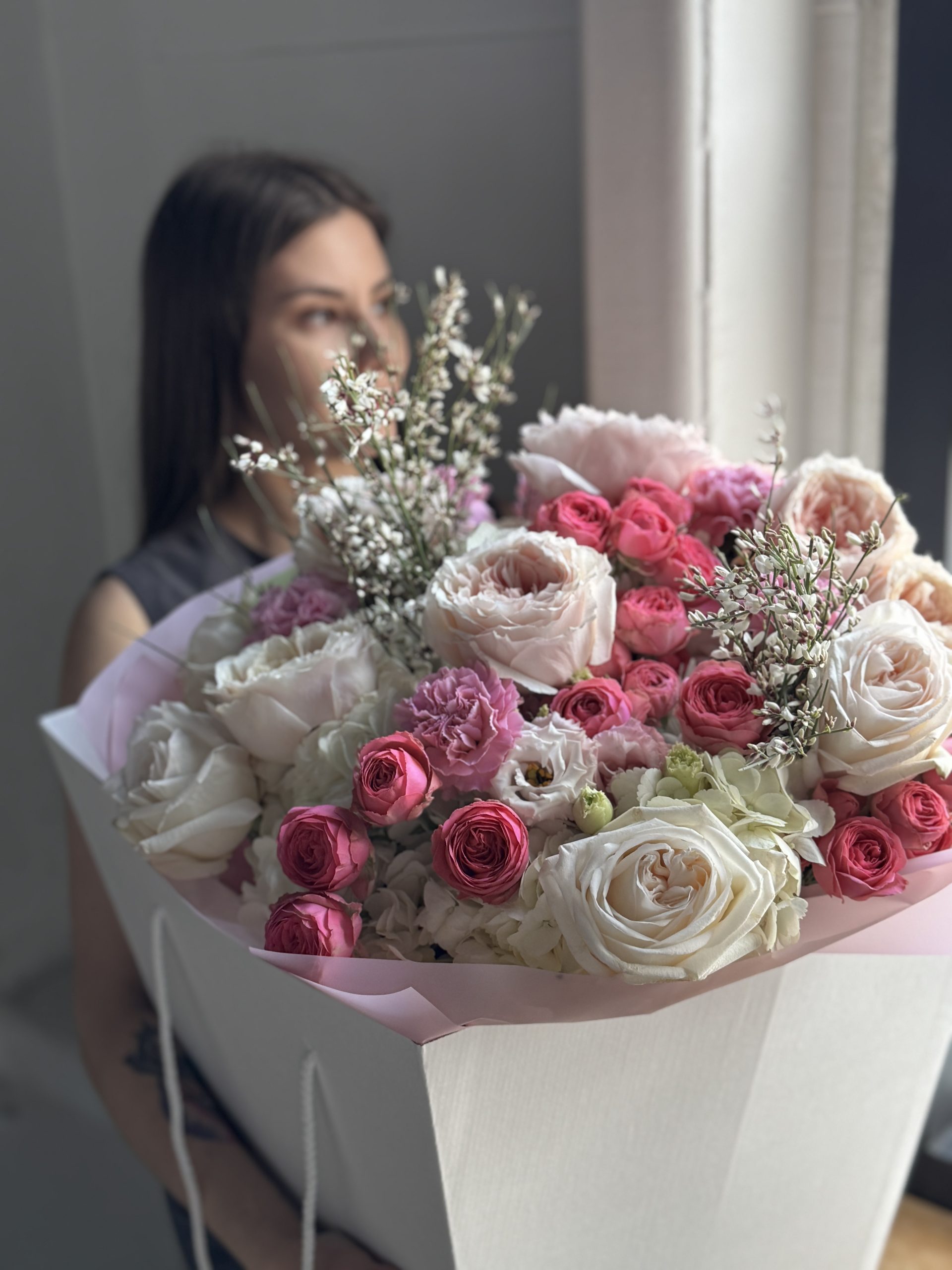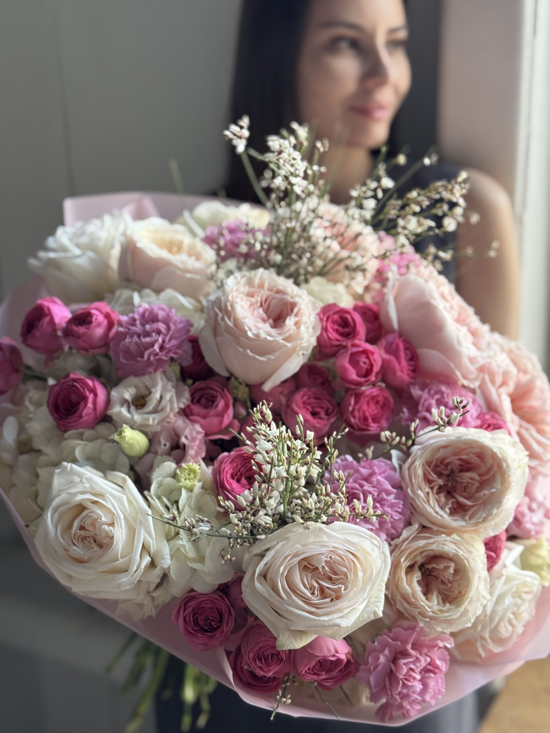 Описание: Сборный букет с гортензиями, миксом пионовидных роз Тсумуги и ароматными Вайт Охара, кустовыми розами Жизель, сортовыми гвоздиками, эустомами и ароматными веточками генисты.