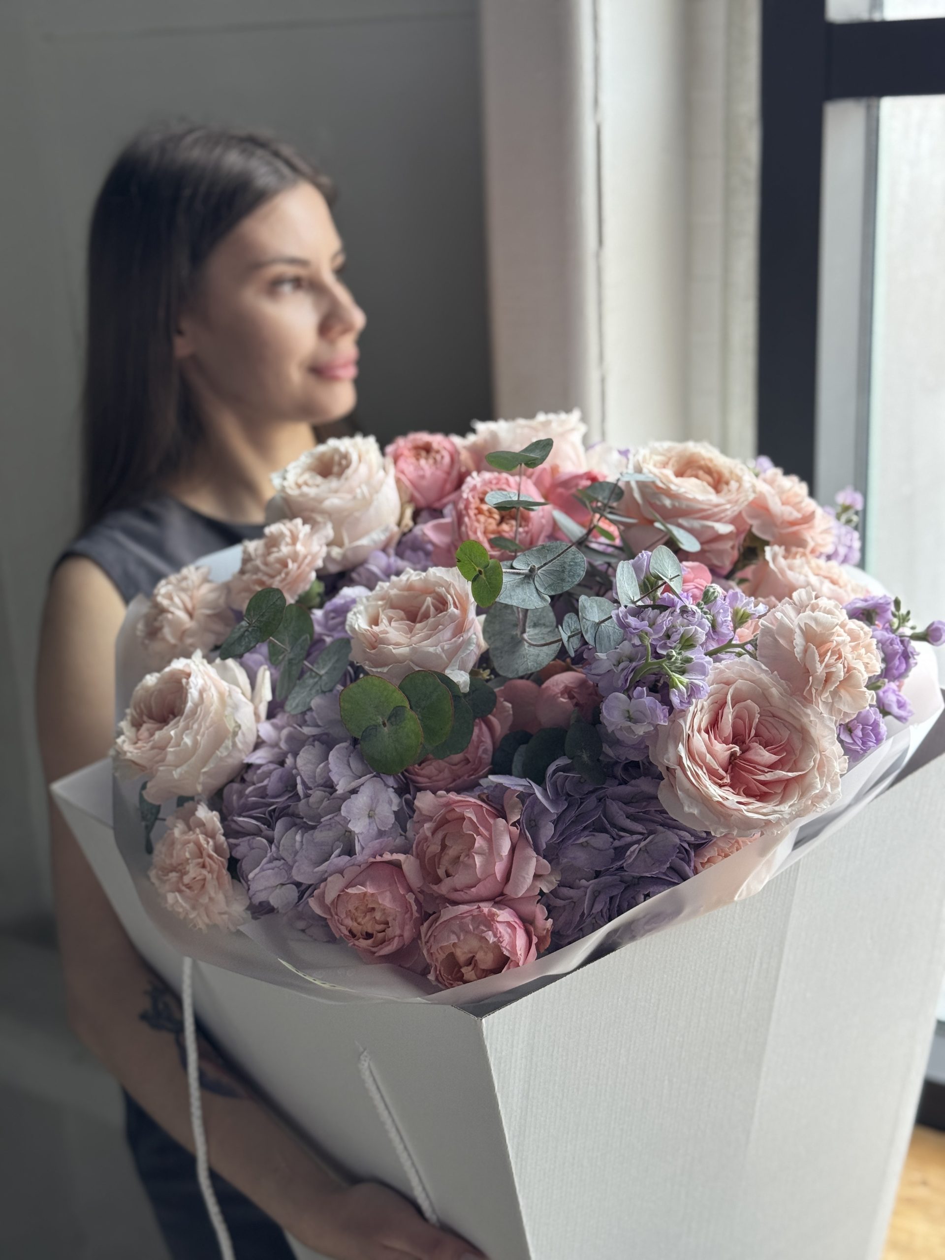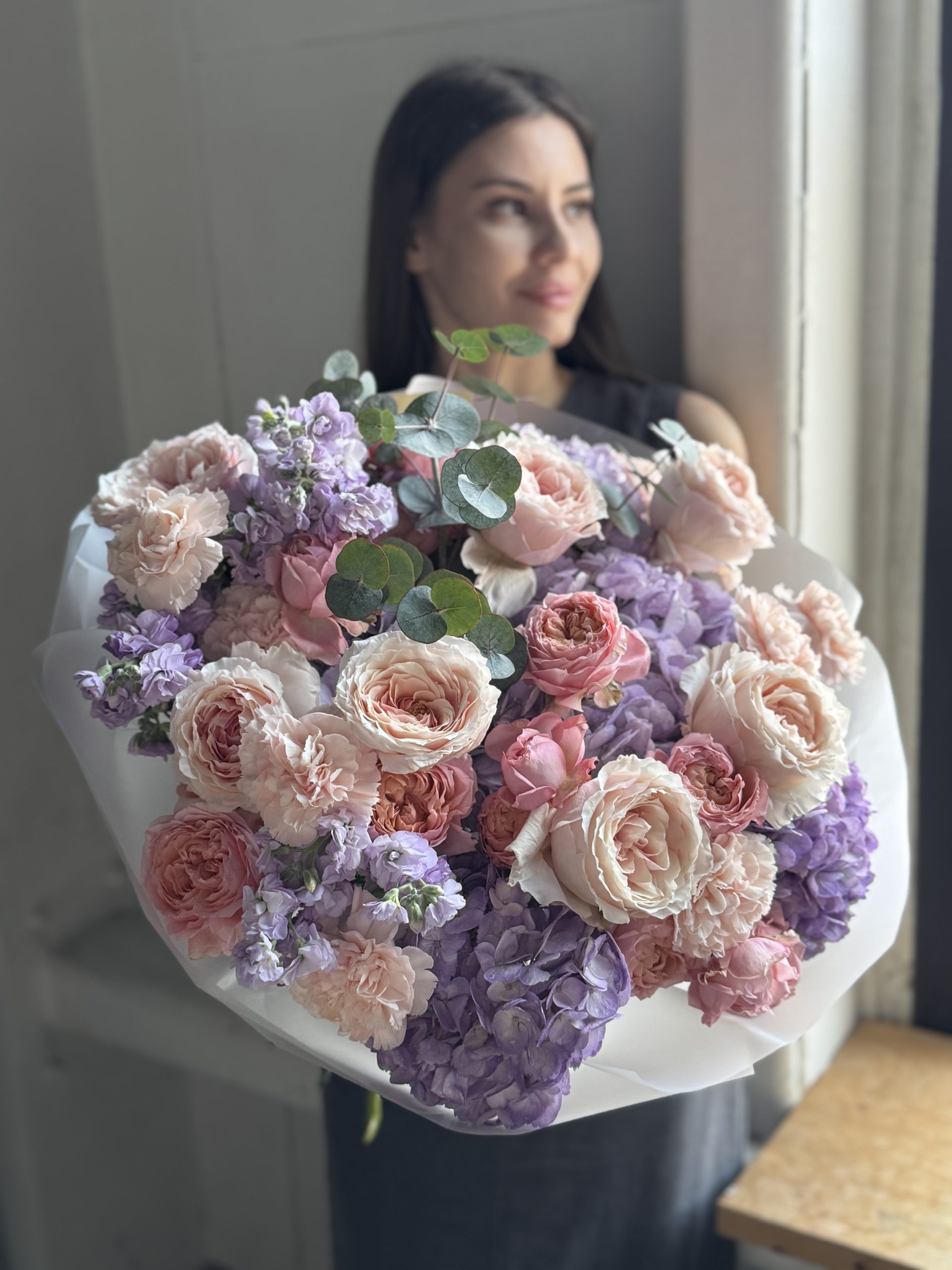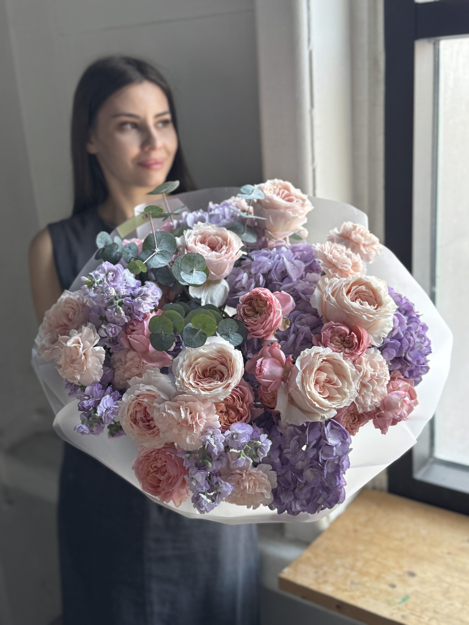 Описание: Сборный букет с гортензиями, пионовидными розами Тсумуги и кустовыми Джульетта, диантусами, ароматными маттиолами и веточками эвкалипта.