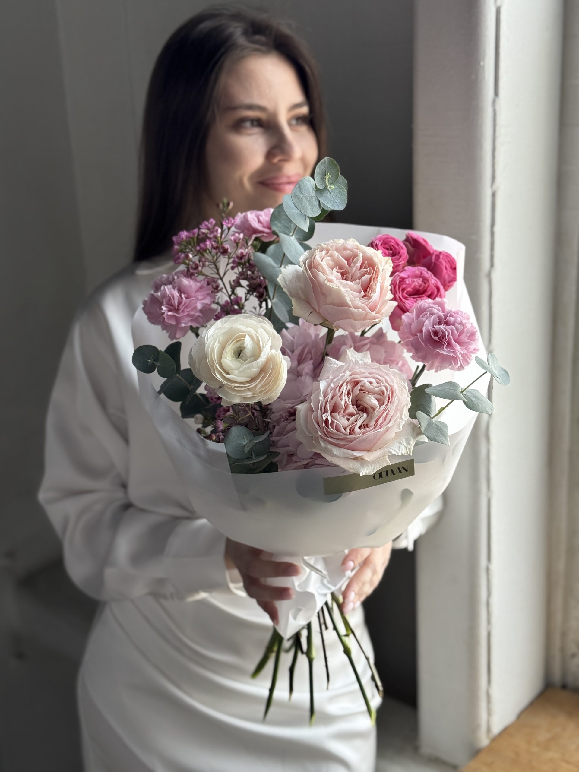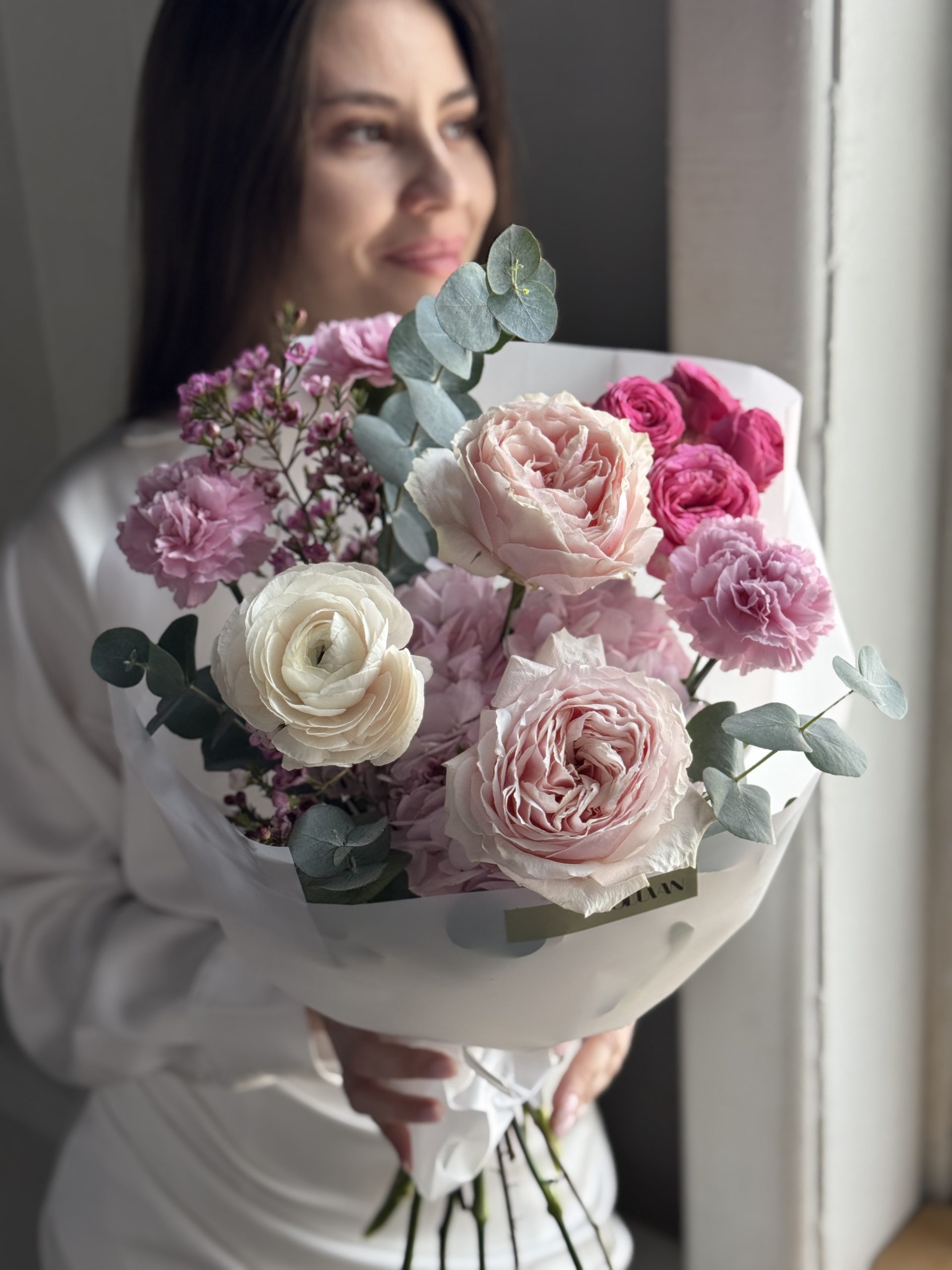 Описание: Букет с гортензией, розами Тсумуги, ранункулюсом, кустовой пионовидной розой Жизель, диантусами, веточками хамелациума и эвкалиптом.