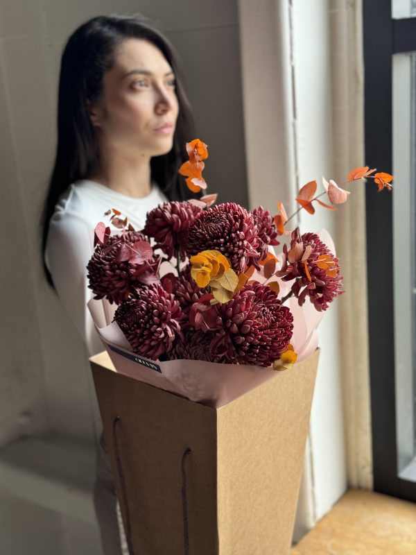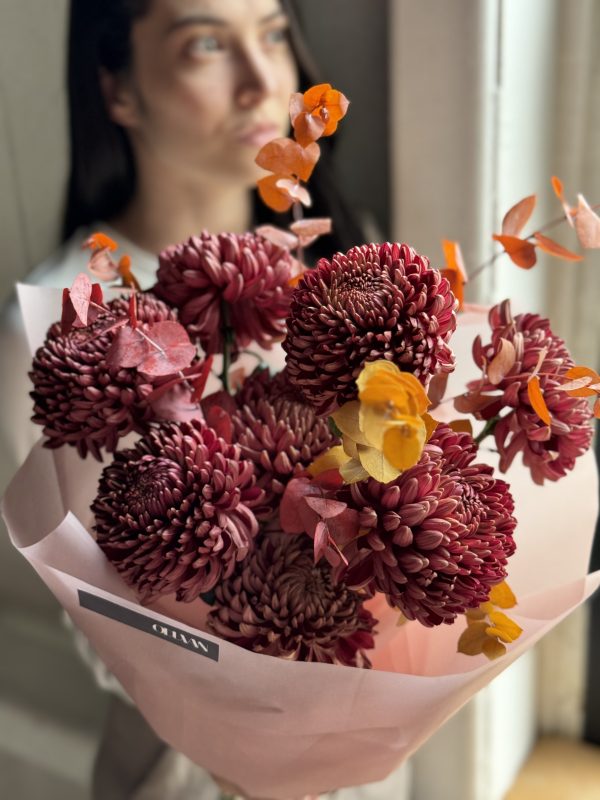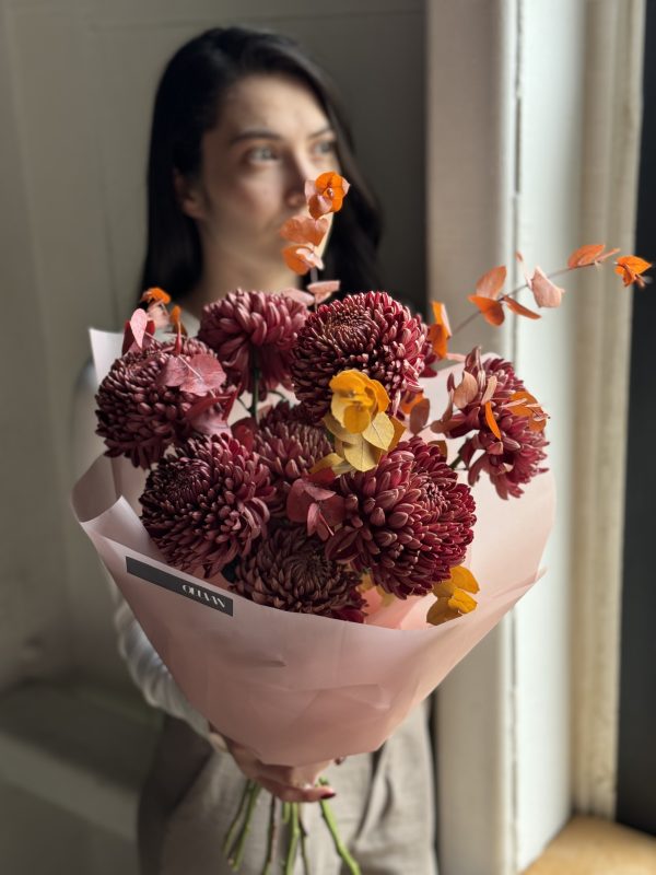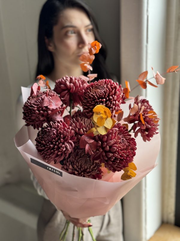 Описание: Букет с хризантемой Бигуди и эвкалиптом.