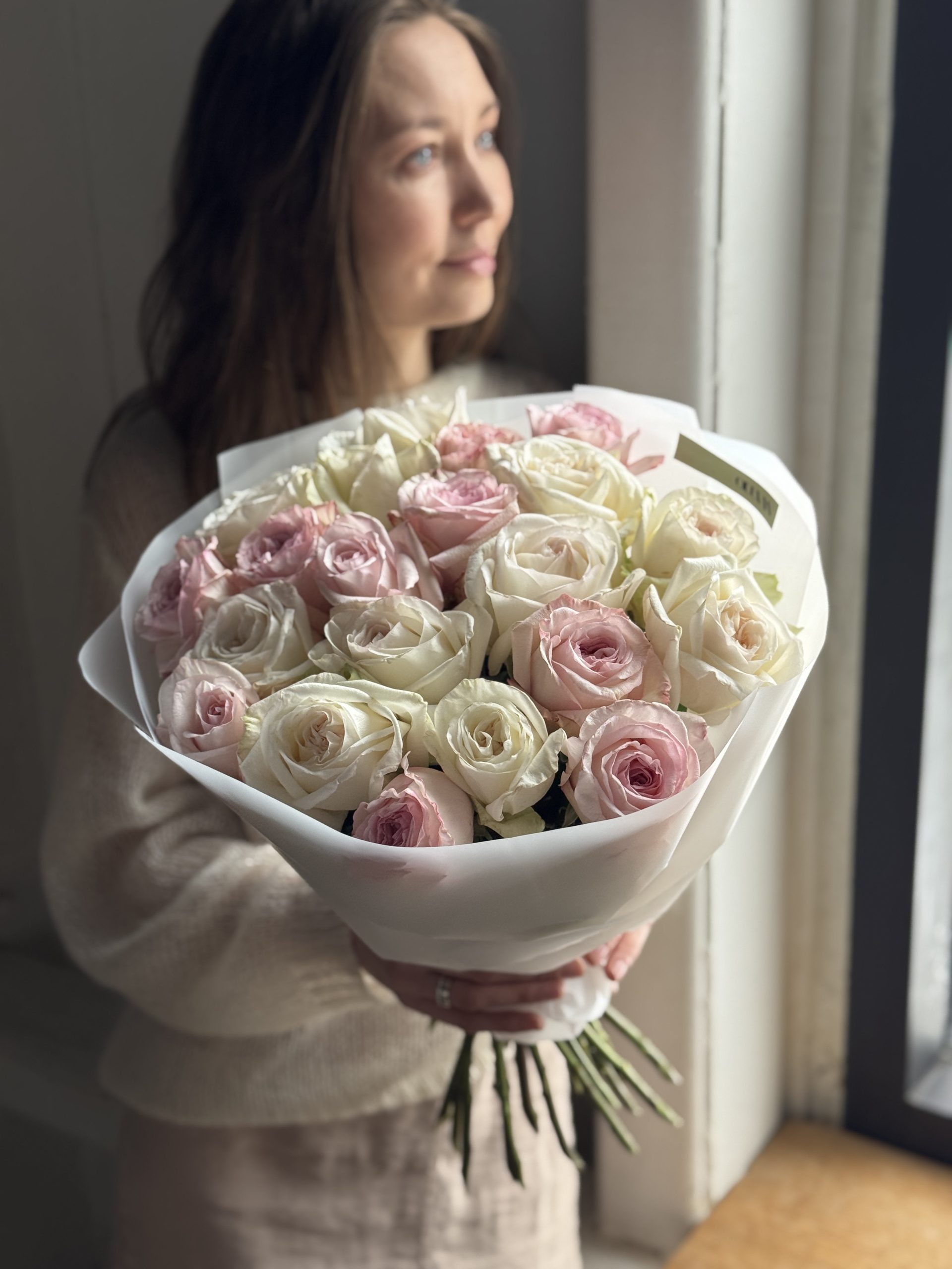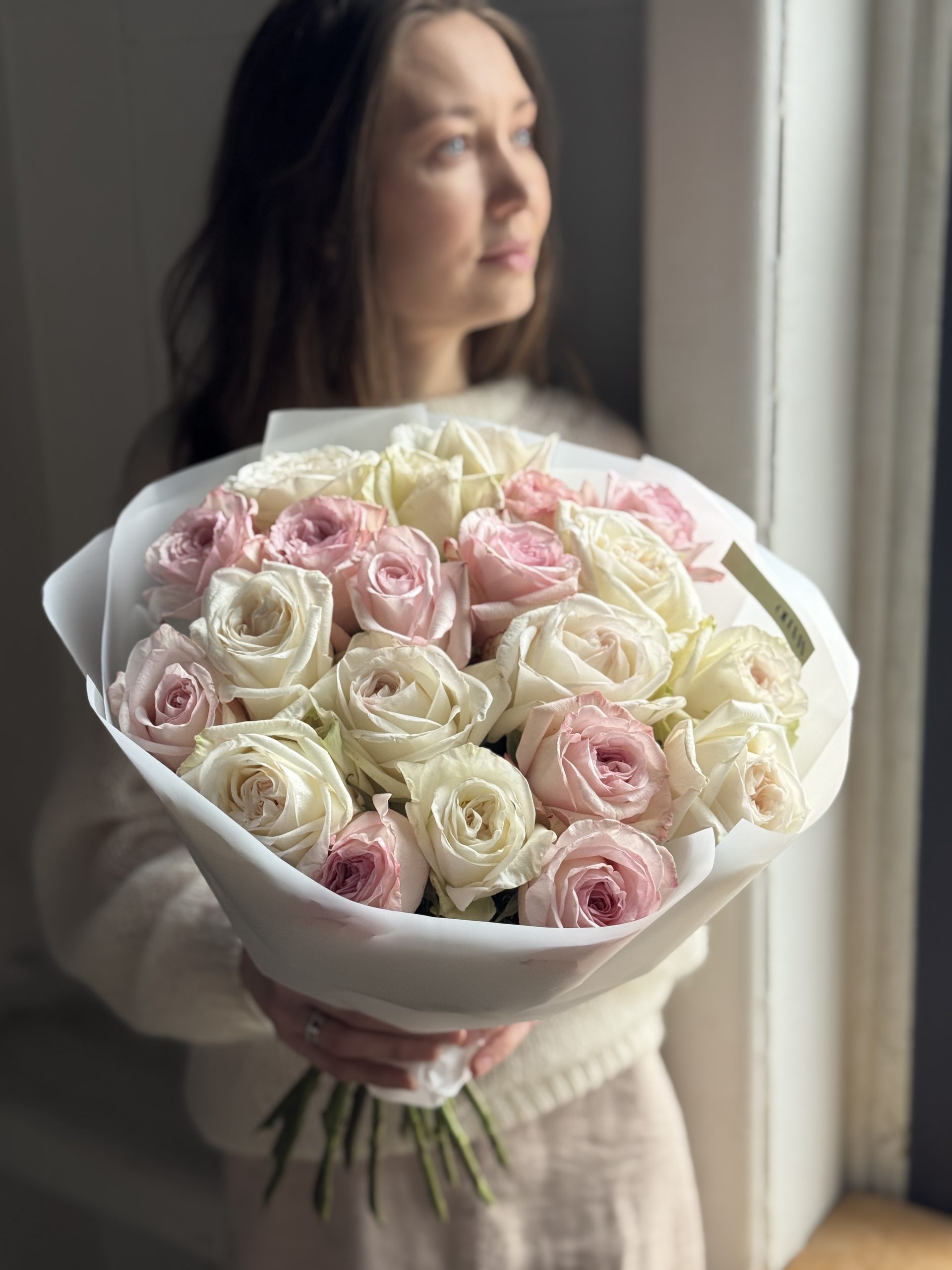 Описание: Букет из микса пионовидных ароматных роз Пинк Охара и Вайт Охара в авторской упаковке.