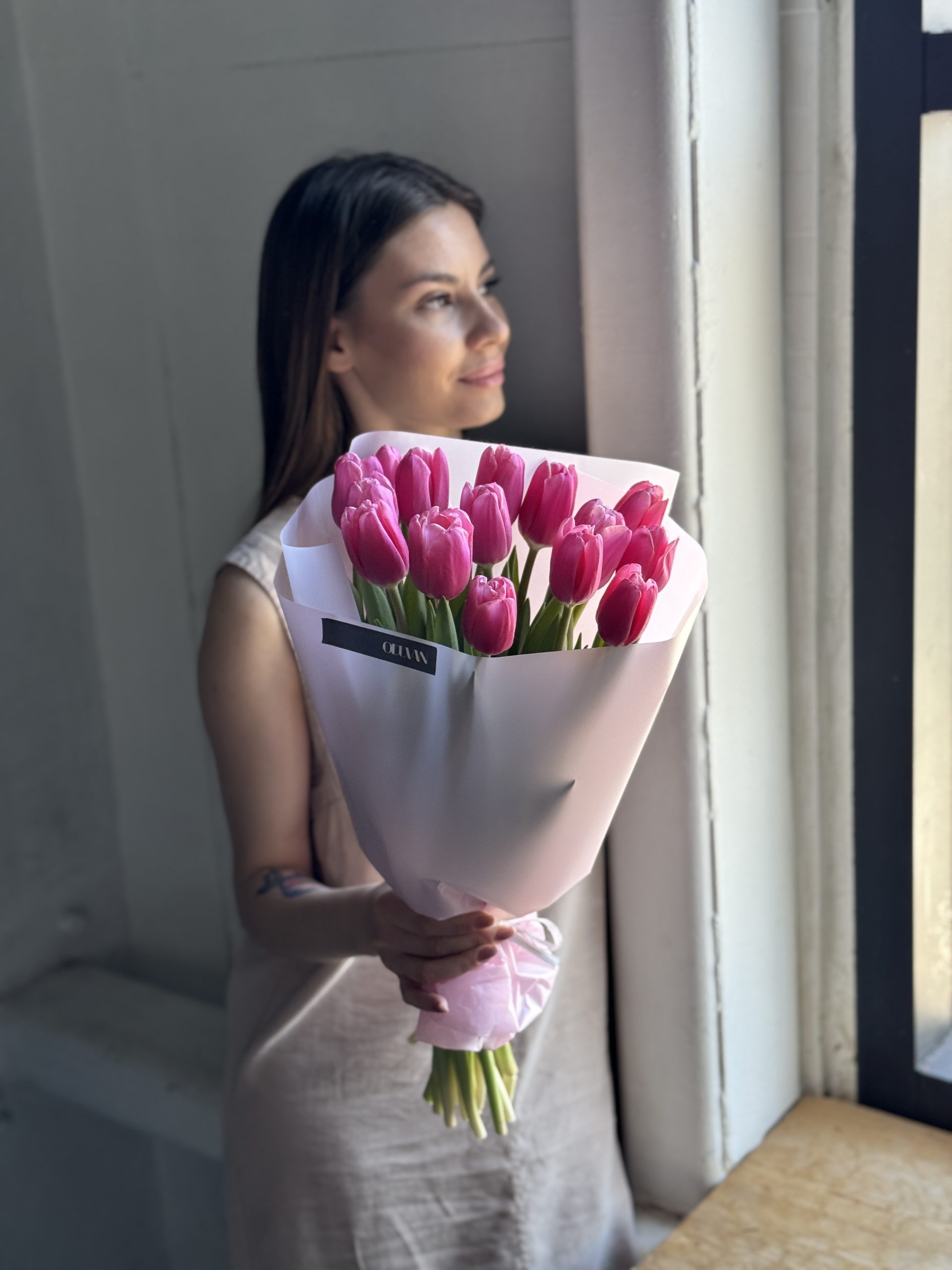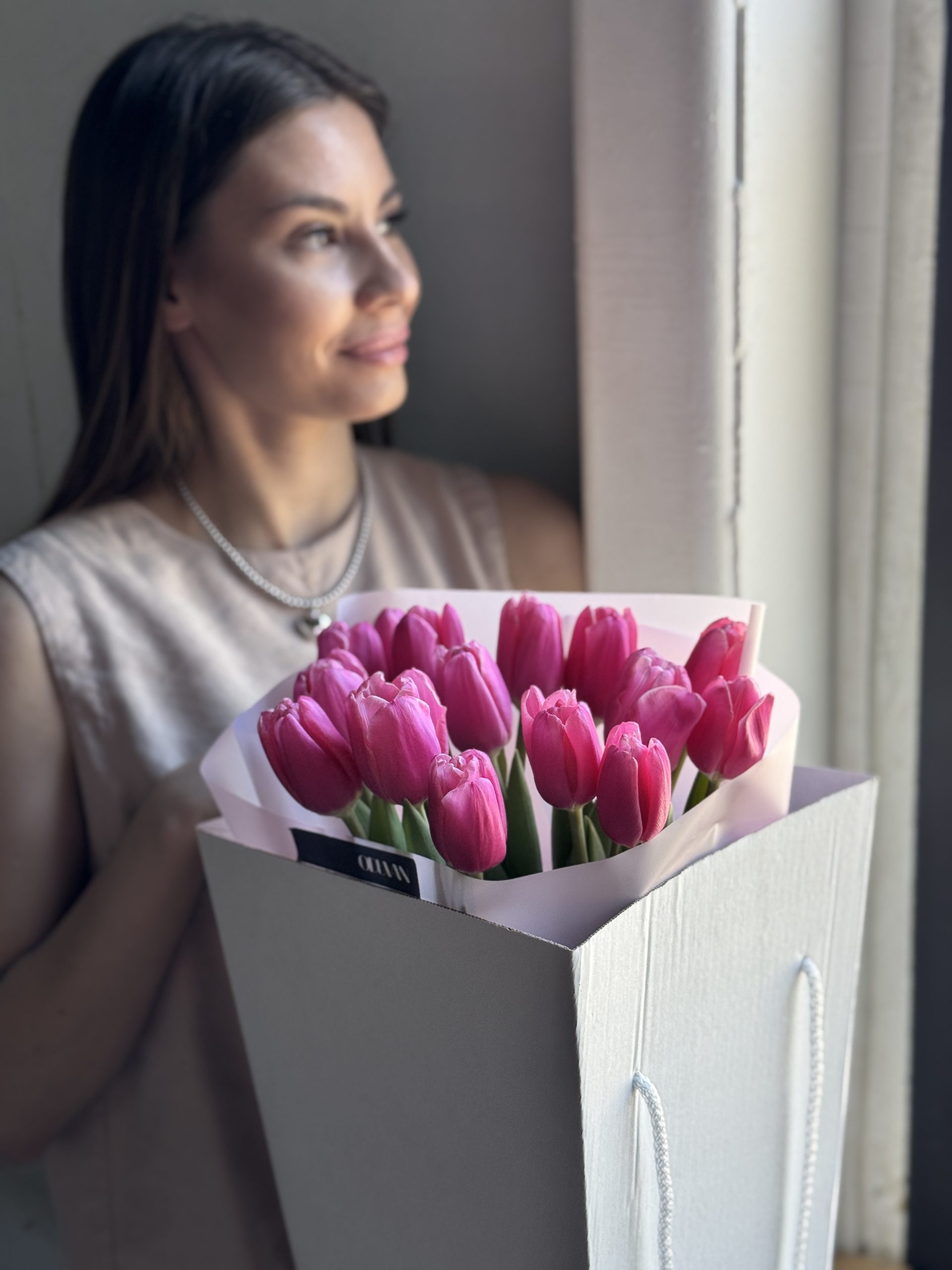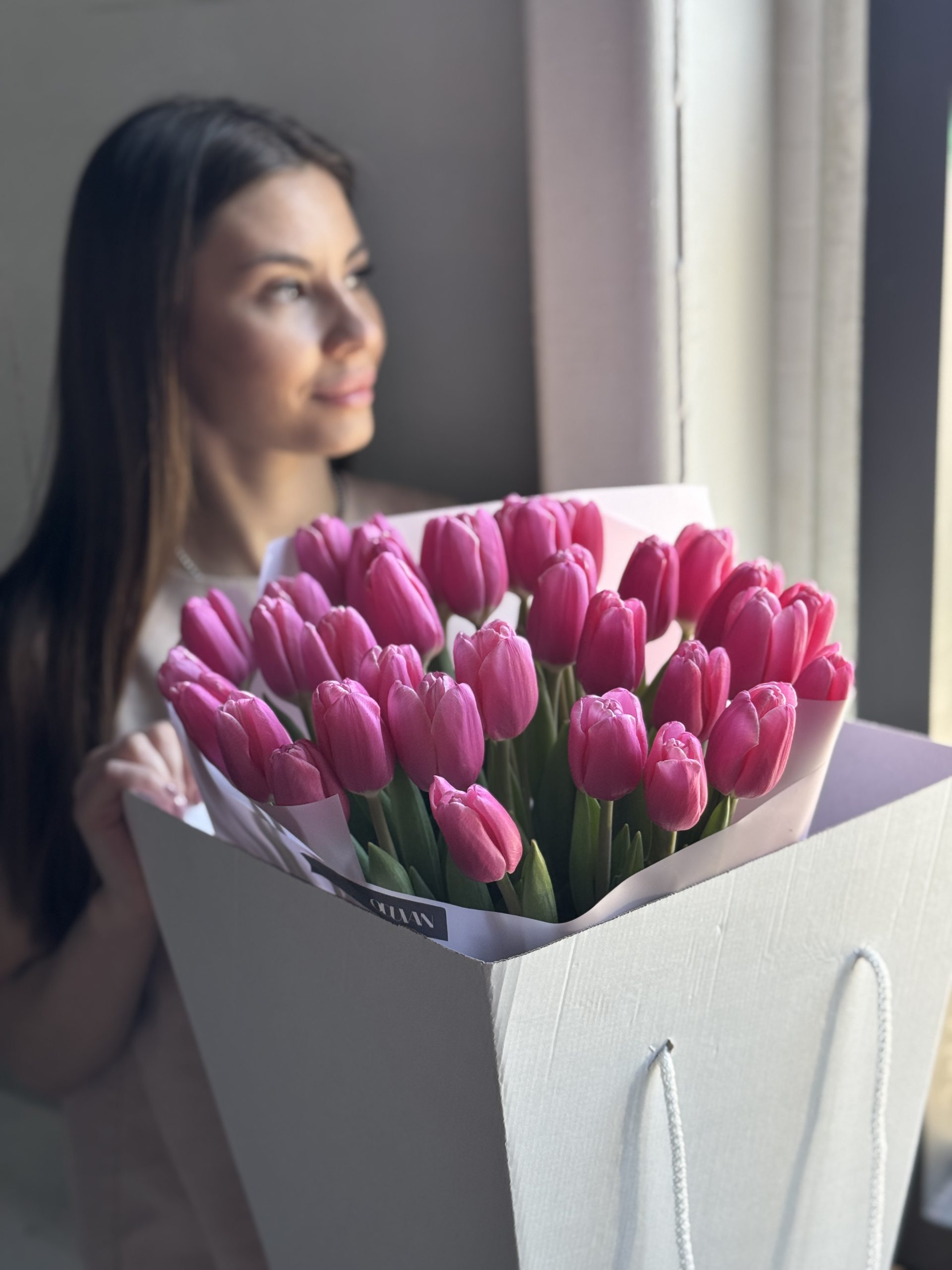 Описание: Монобукет из тюльпанов в авторской упаковке.
